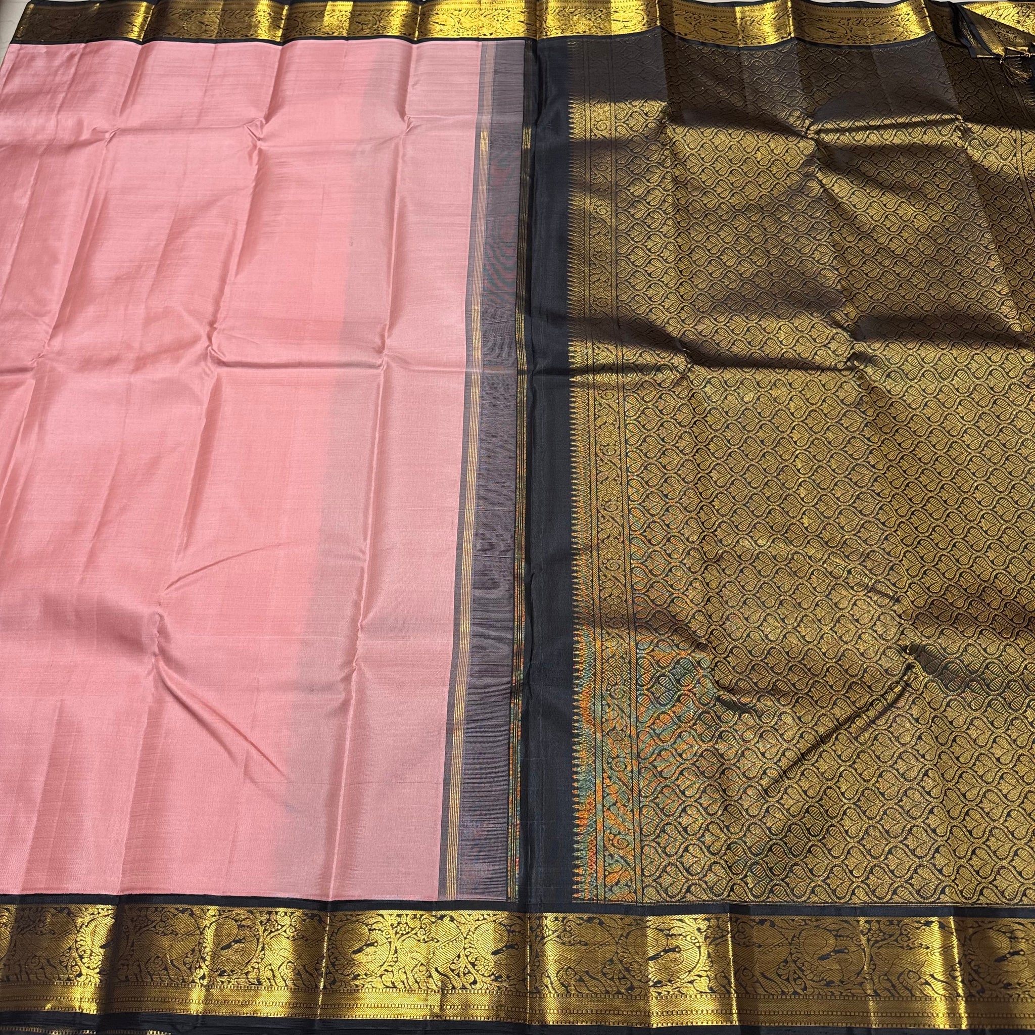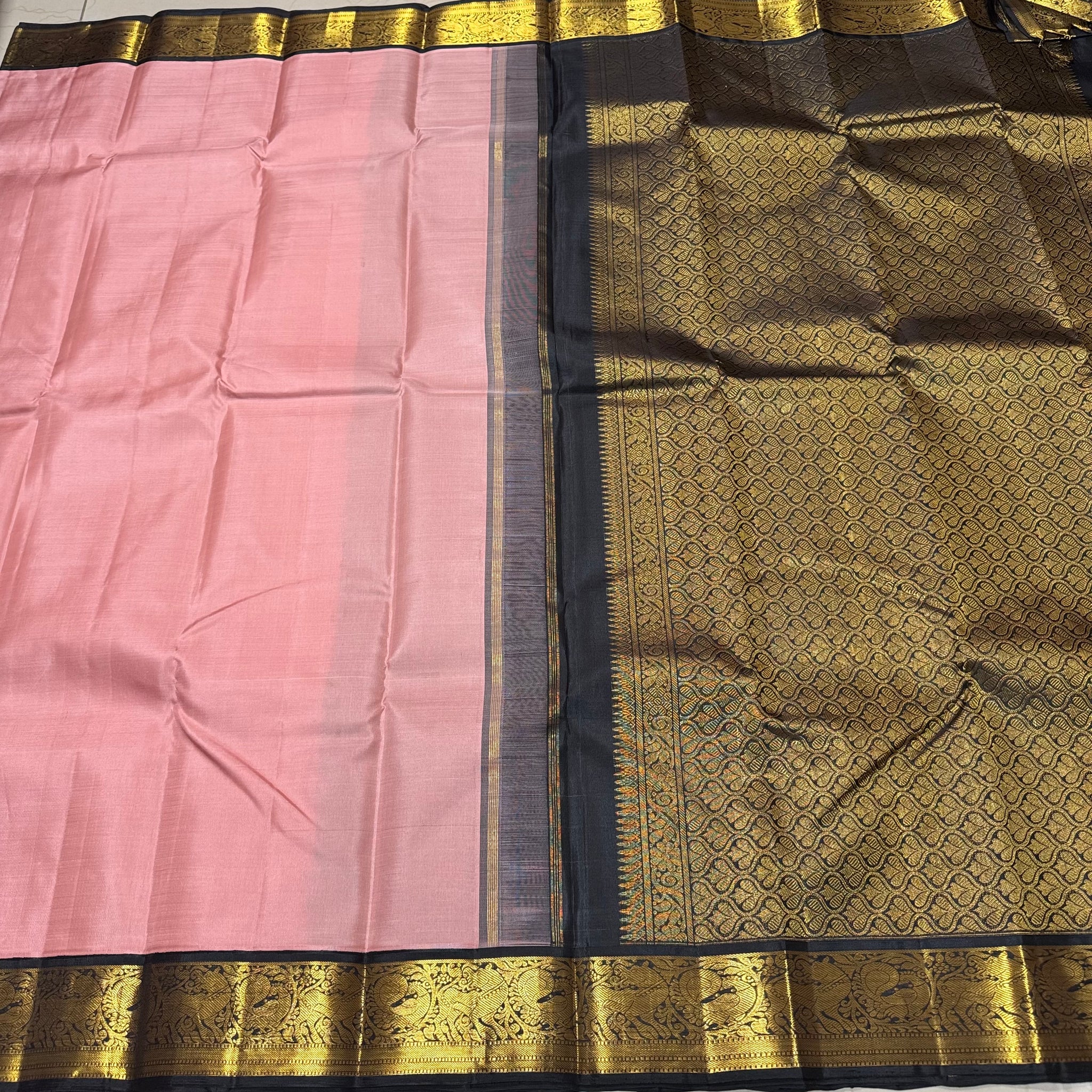 Beautiful Handwoven Pure Jari Korvai Kanjivaram Silk Saree in Geva with Black combination with beautiful yazhi and peacock motifs woven borders rich pallu and contrast woven blouse