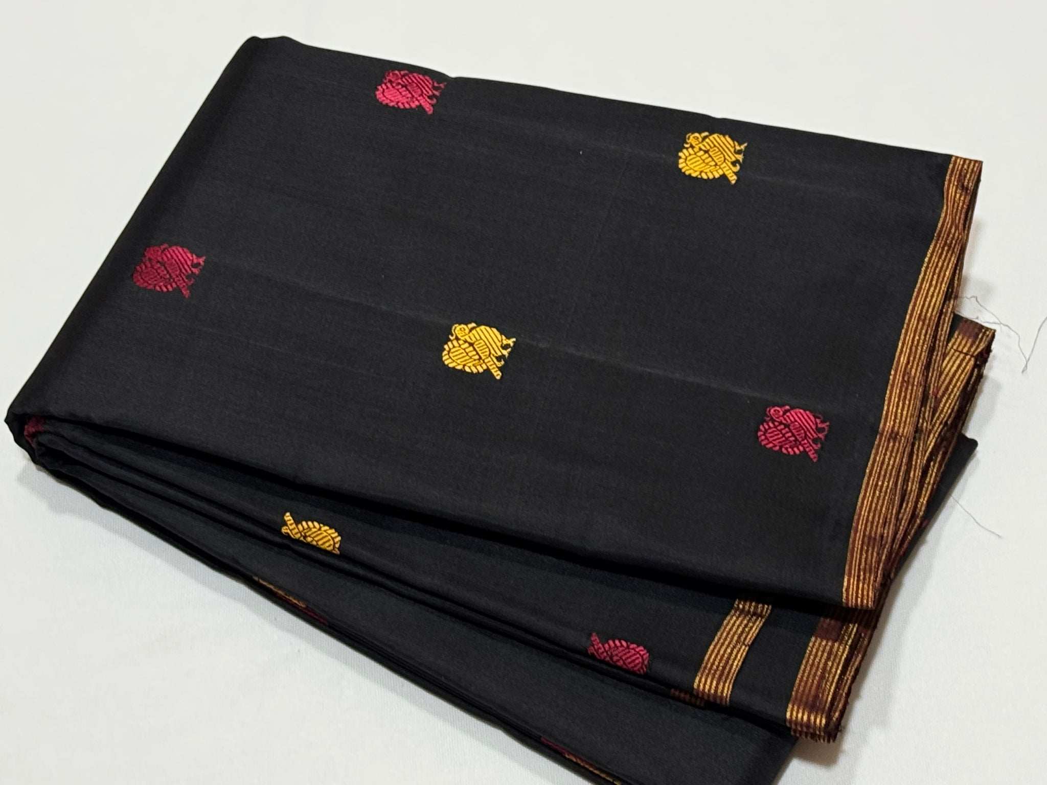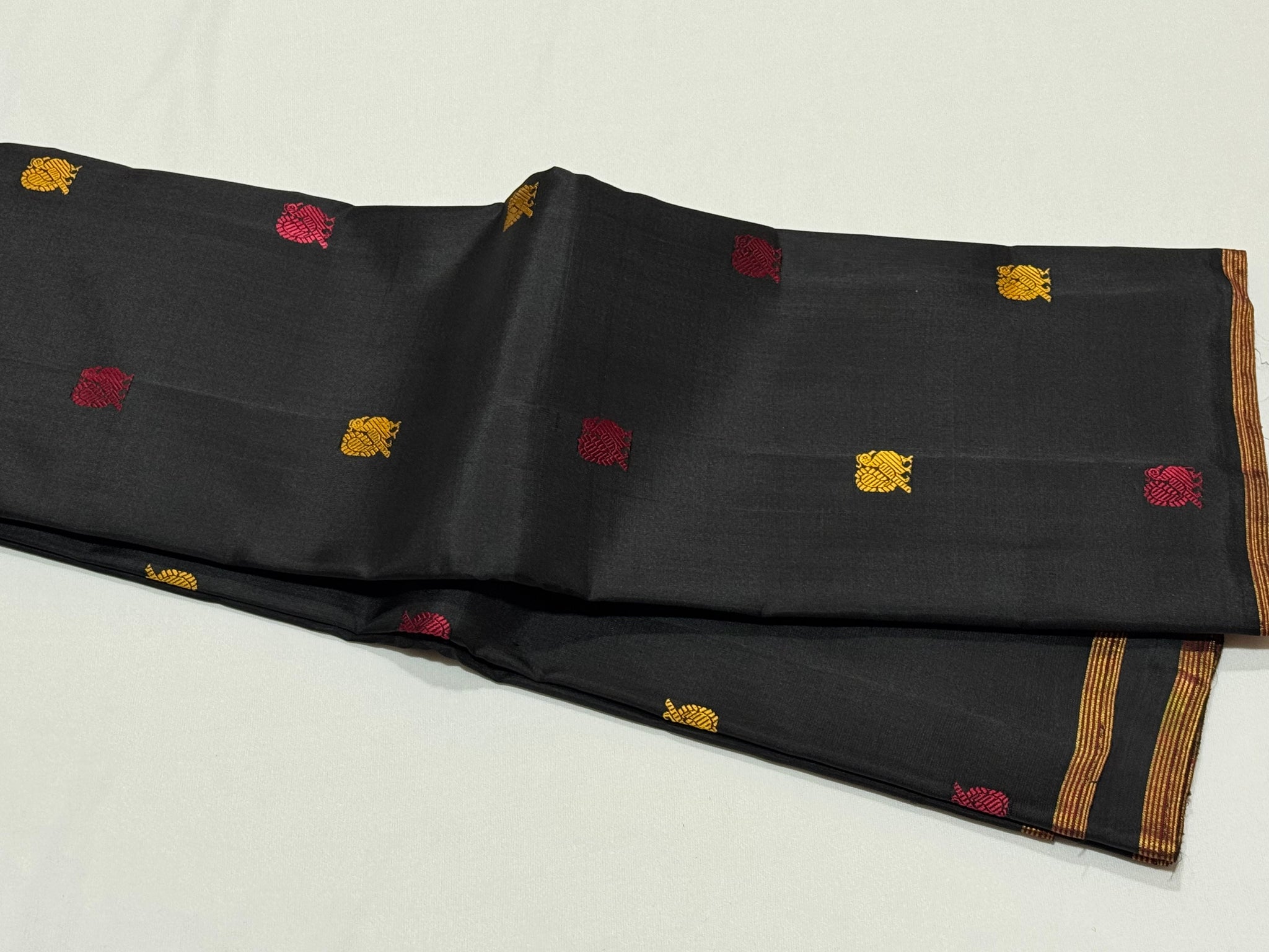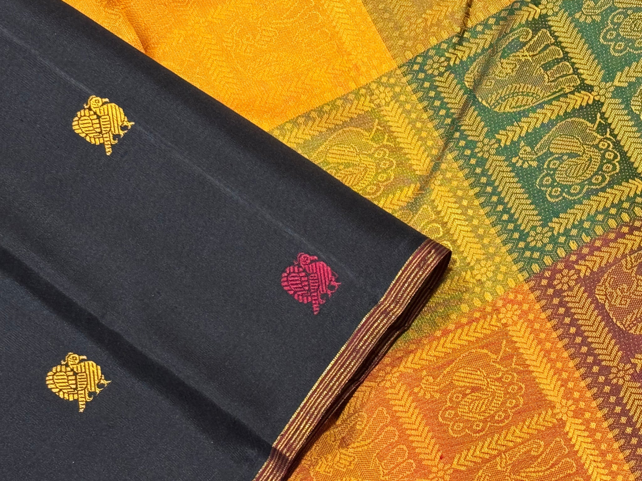 Black with Bomkai Pallu Premium Zariless Handwoven Pure Kanjivaram Silk Saree with small borders rich silk thread buttas woven body rich bomkai pallu and contrast checked blouse beauty