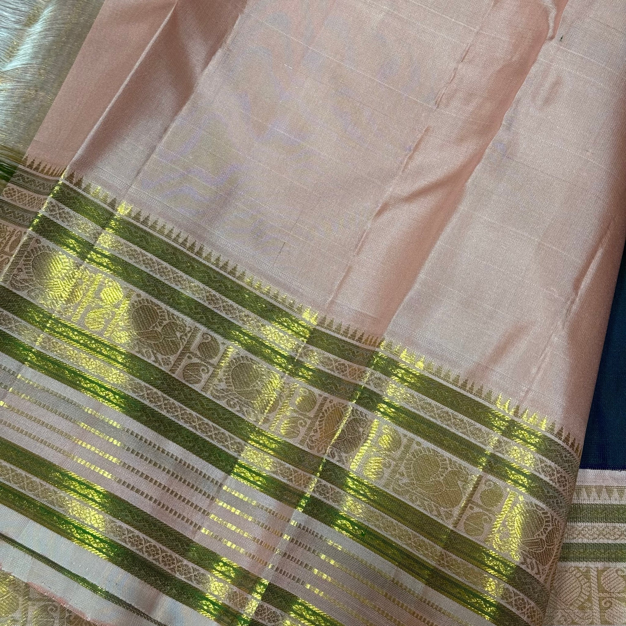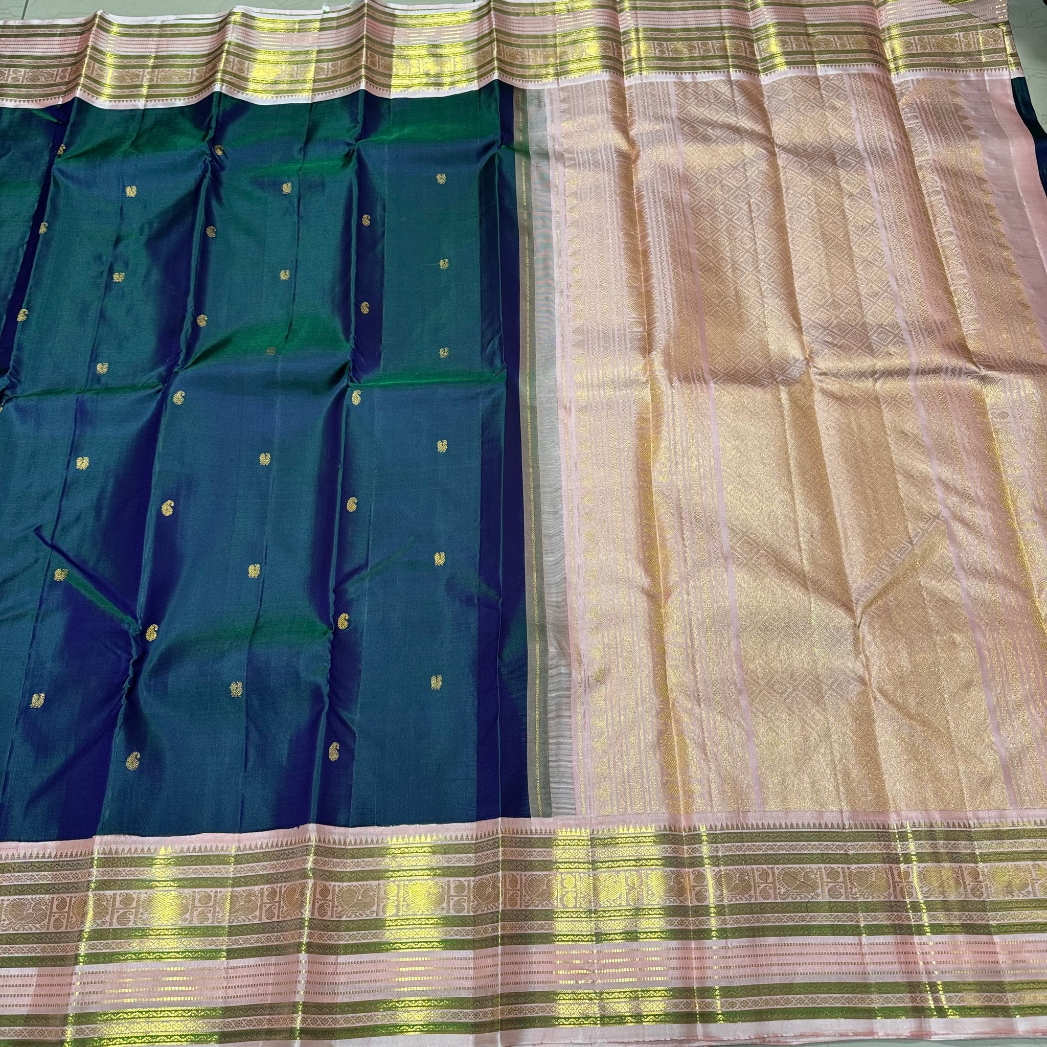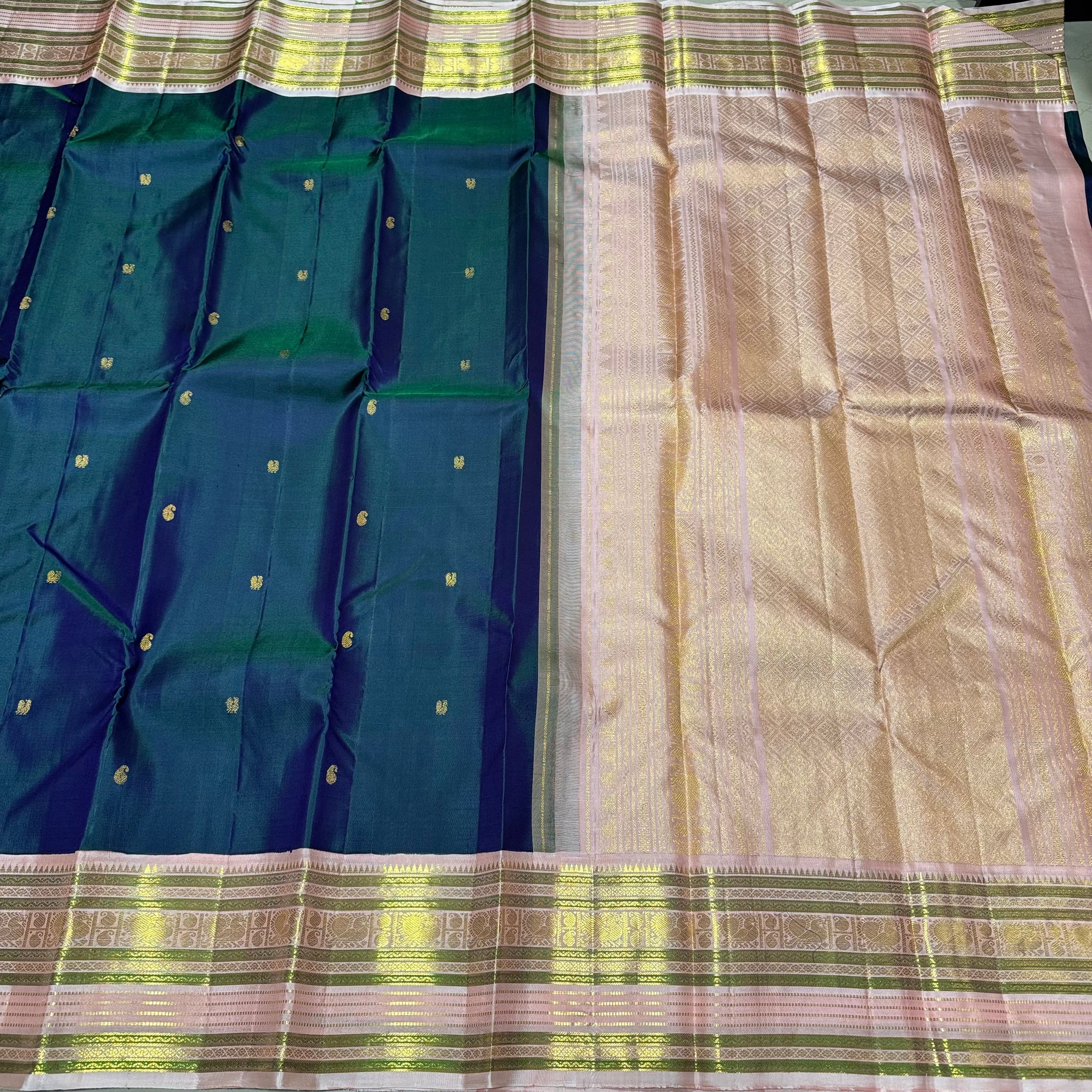 Deep Prussian Blue (dual tone of sapphire blue and green) with Soft Pink Buttas Handwoven Pure Jari Korvai Kanjivaram Silk Saree with rich meenakari varisaipet borders with vel, annam, manga, Neli streaks woven rich borders rich pallu and contrast woven