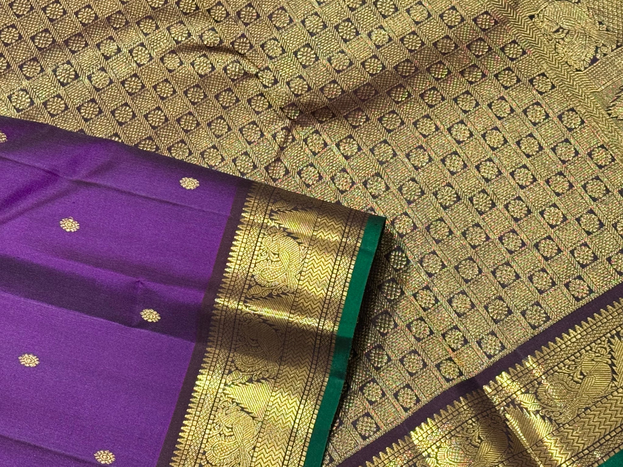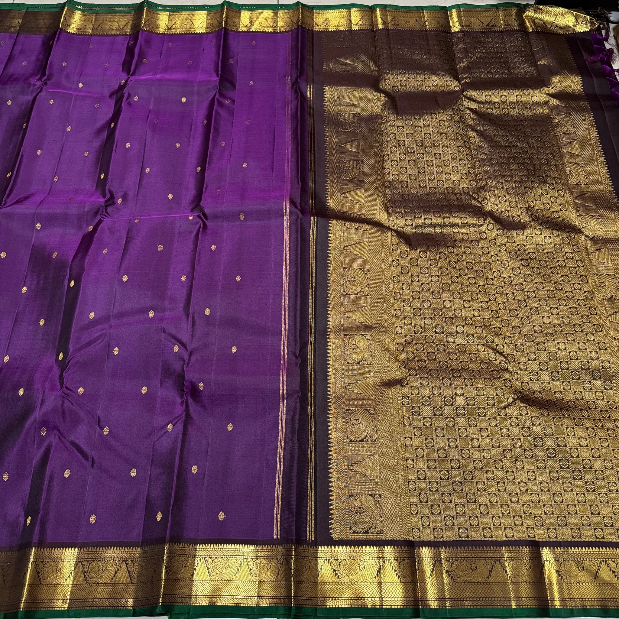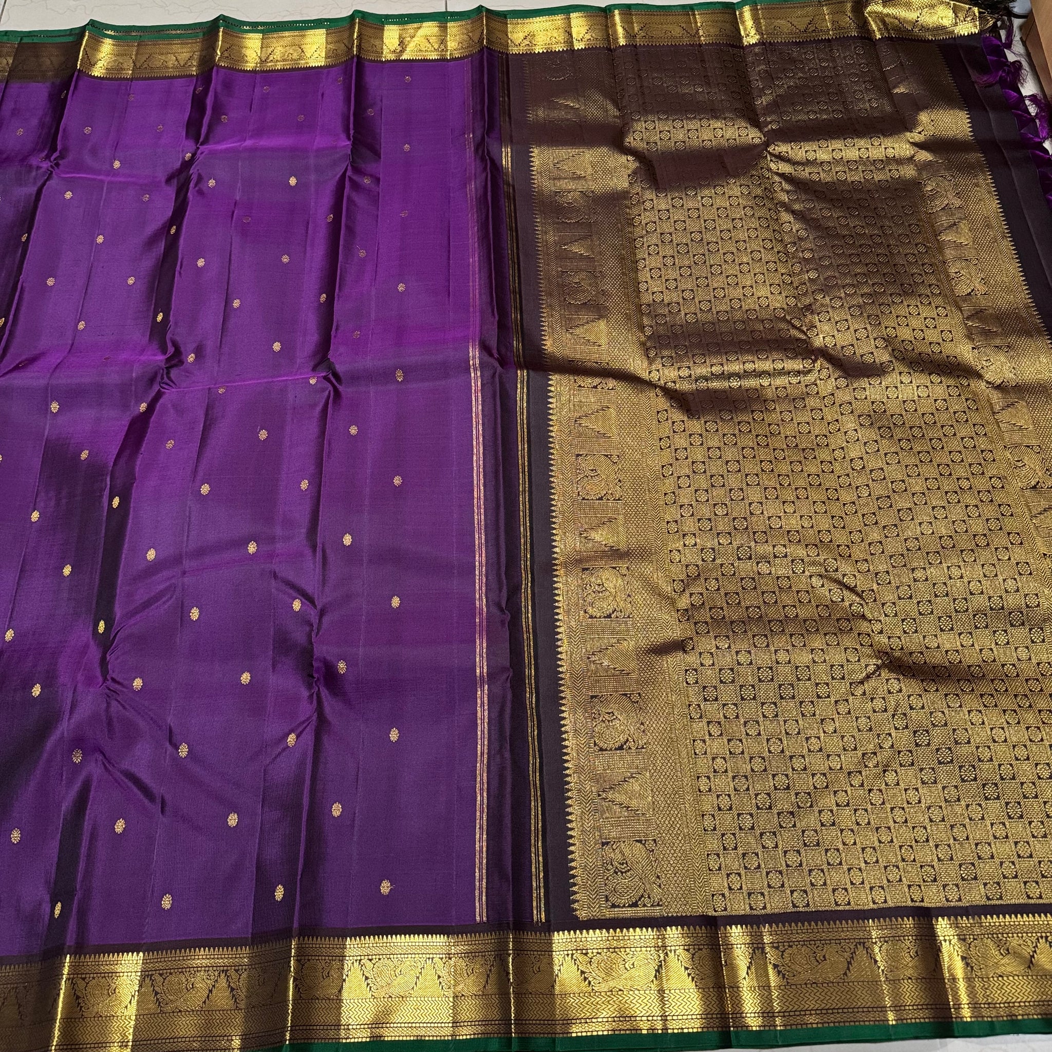 Deep Purple with Coffee Brown Buttas Handwoven Pure Jari Kanjivaram Silk Saree with beautiful buttas with green selvedges rich pallu and contrast woven blouse