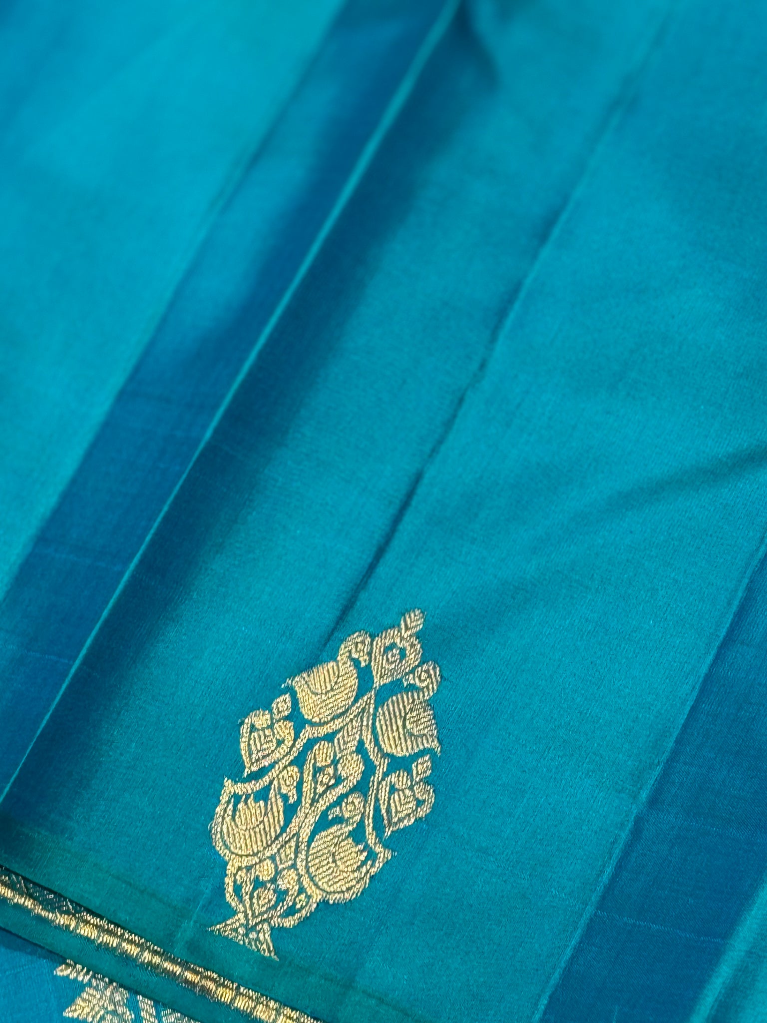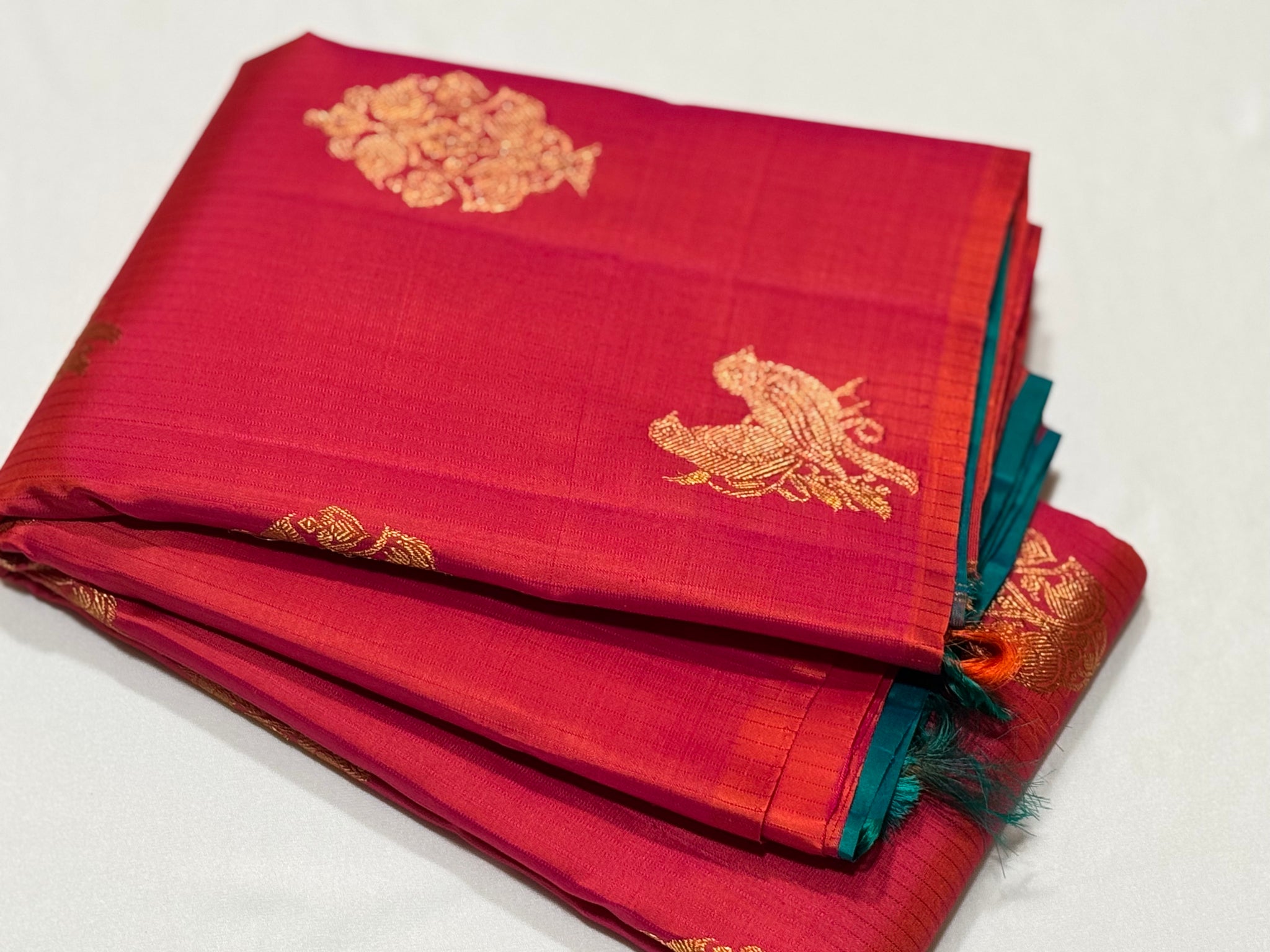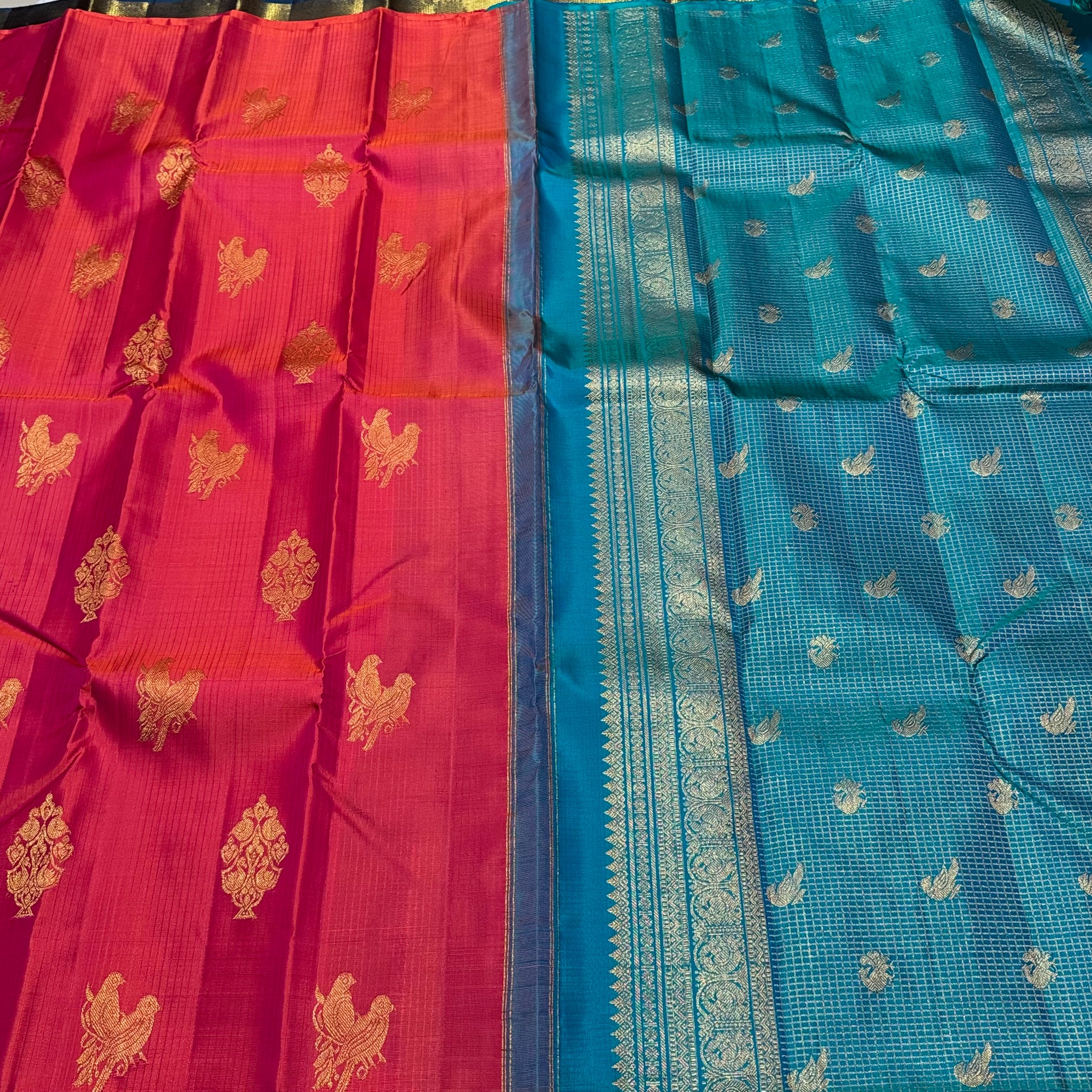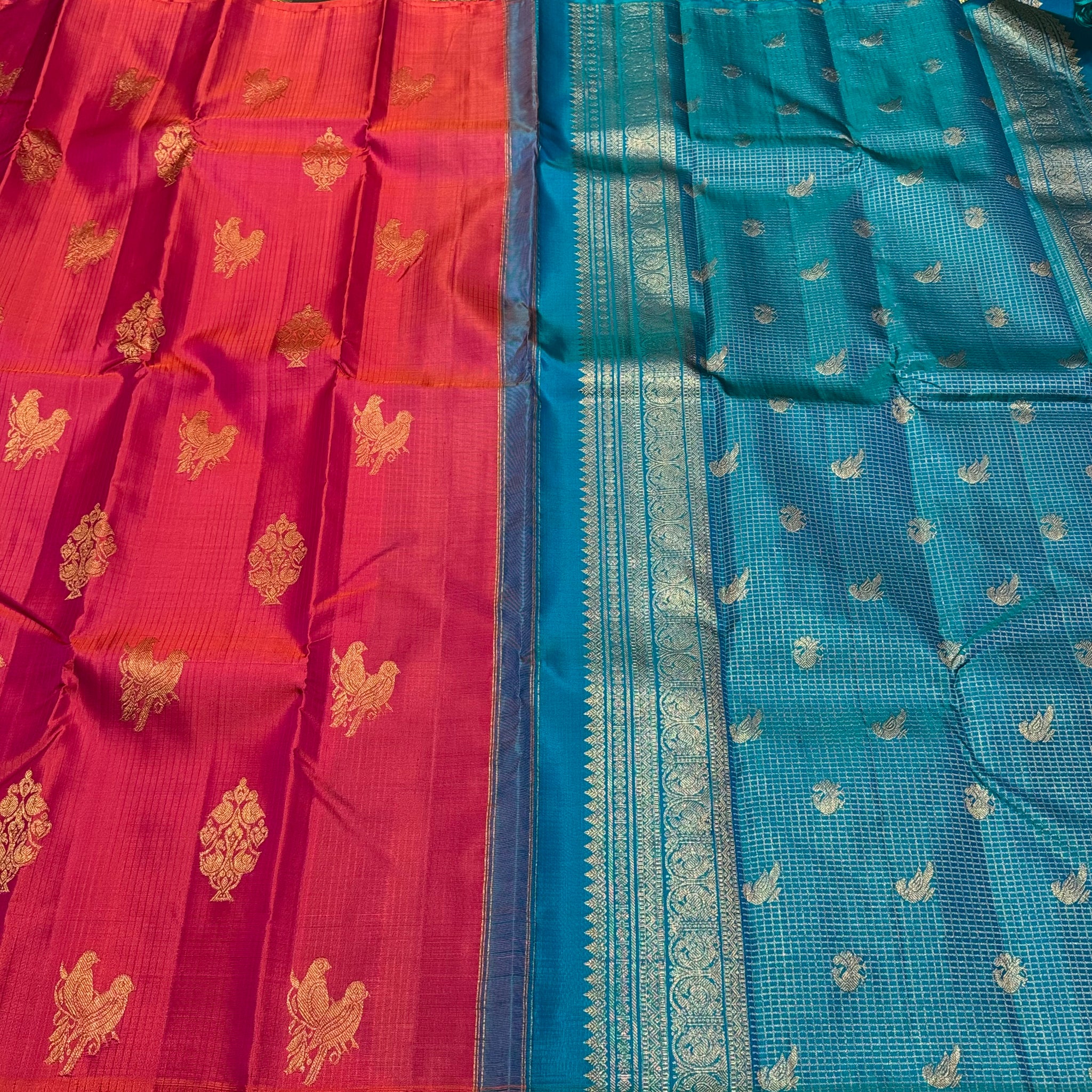 Dual tone Orange Tomato Pink with Peacock Blue Borderless Muthukattam with Double Parrot & Floral Motifs with rich parrots woven pallu and contrast blouse in Handwoven Pure Jari Kanjivaram Silk Saree Beauty
