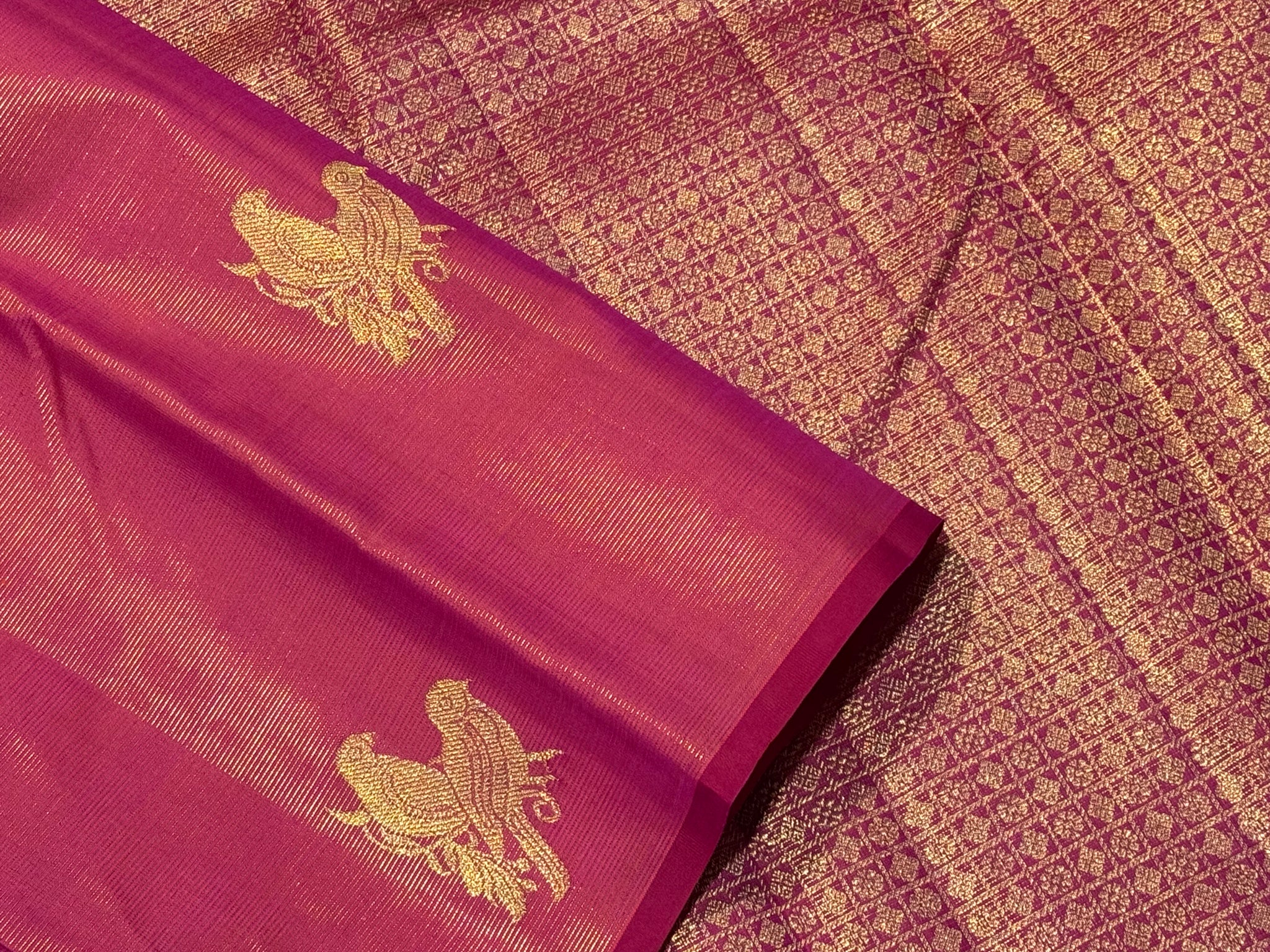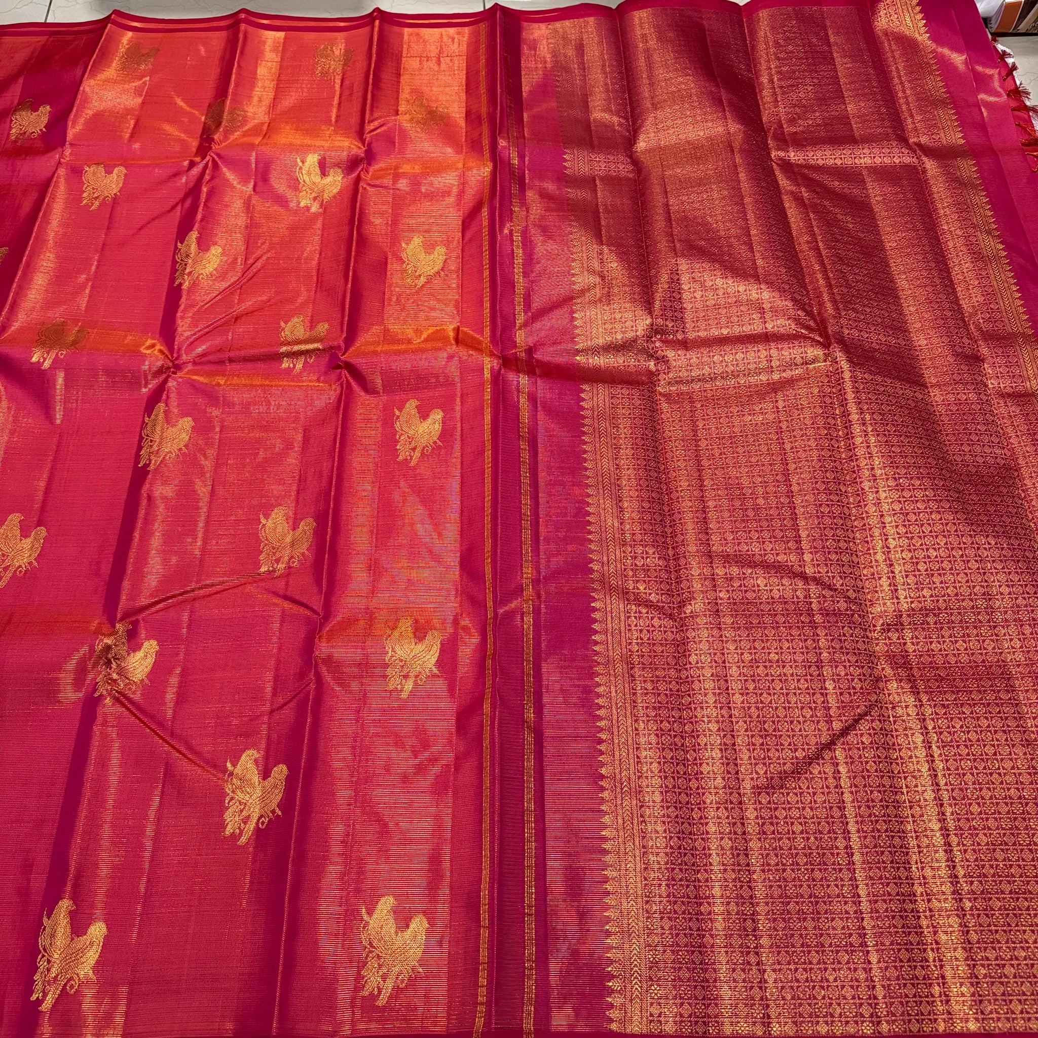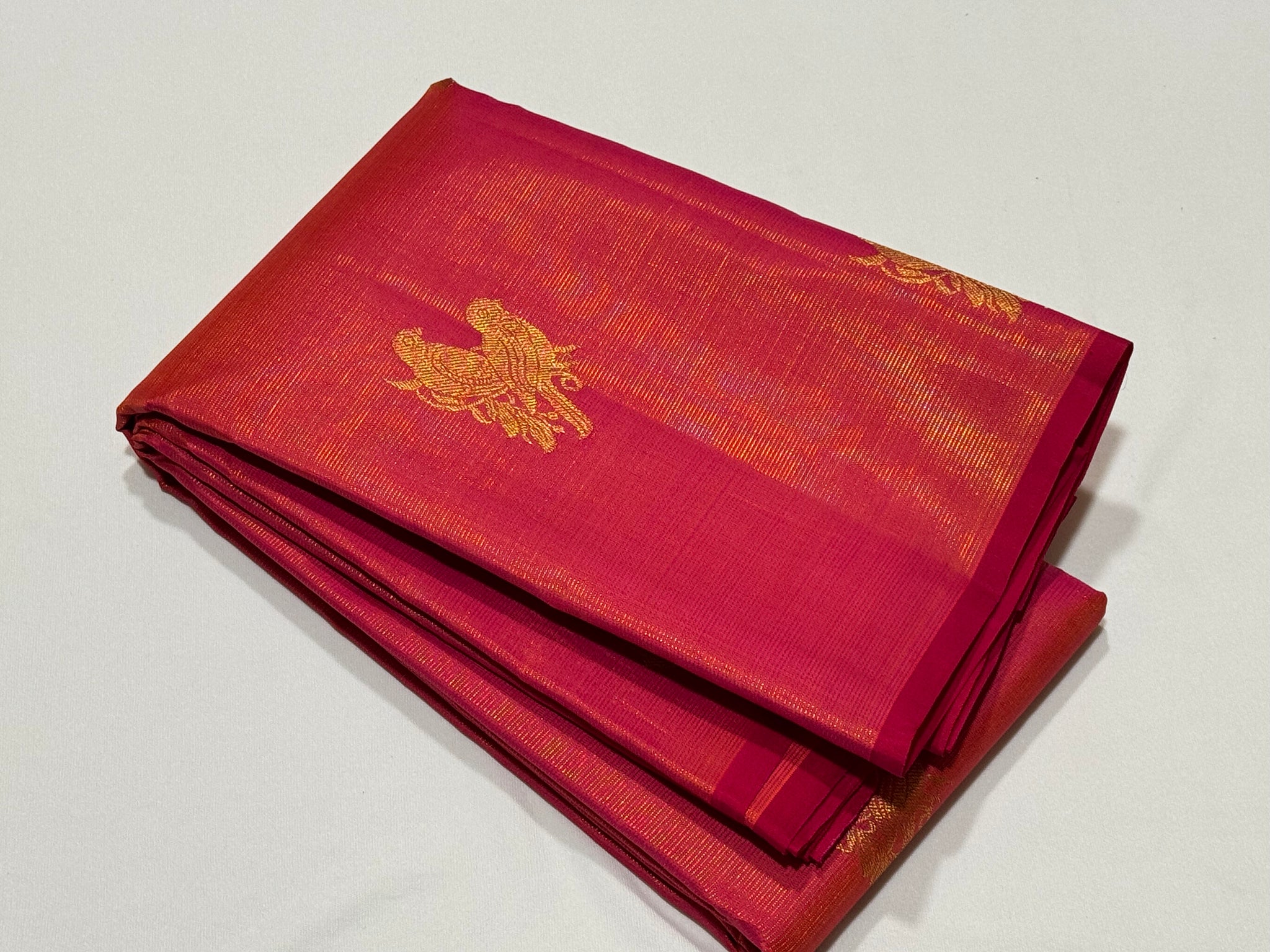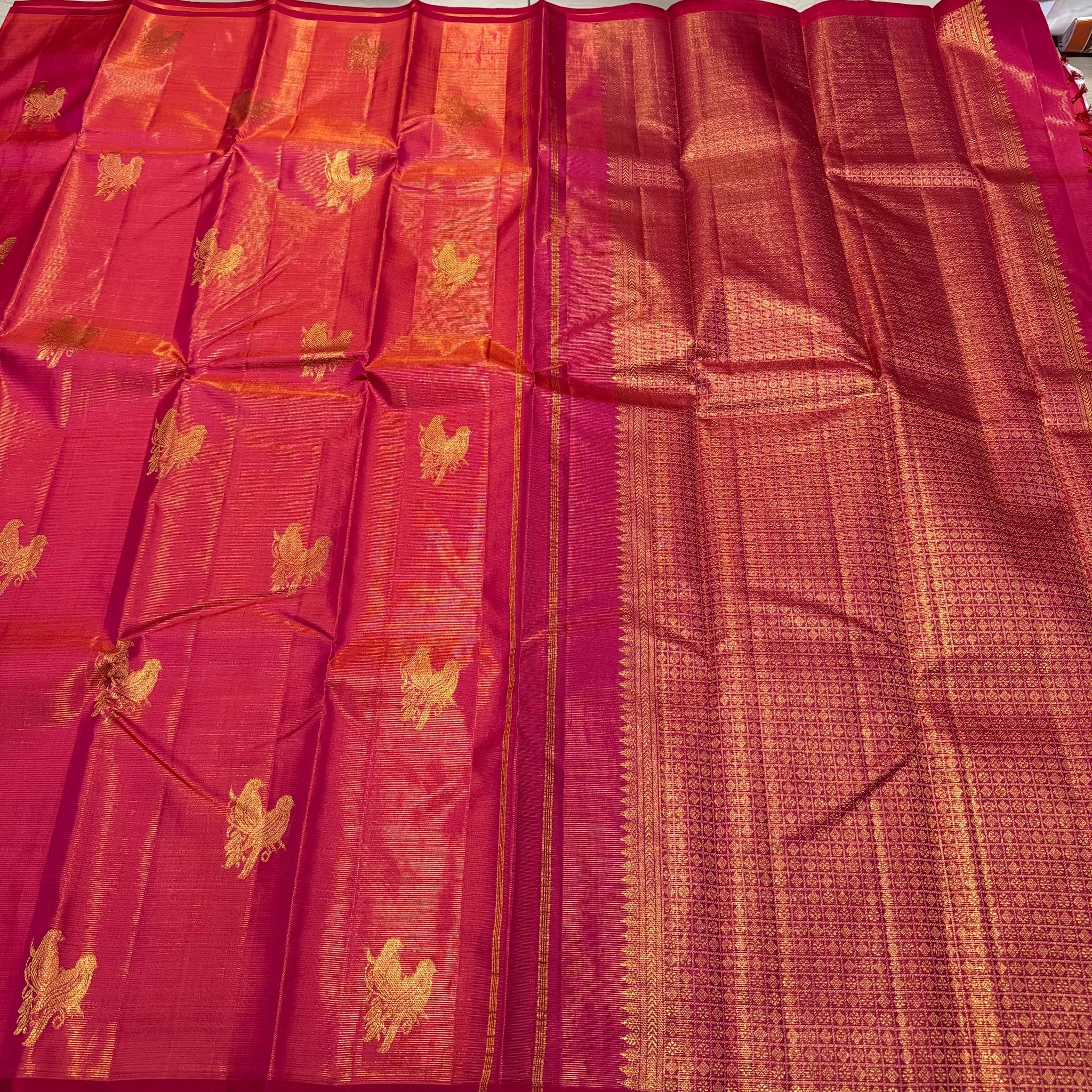 Gorgeous Dual tone Orange with Deep Reddish Pink Borderless Vairaoosi with Rettaikili buttas Handwoven Pure Jari Kanjivaram Silk with rich pallu and contrast woven blouse
