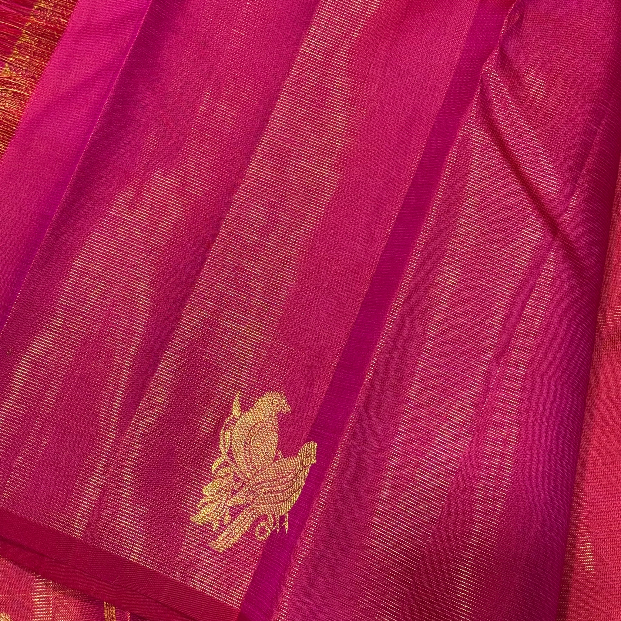 Saranga-Gorgeous Dual tone Orange with Deep Reddish Pink Borderless Vairaoosi with Rettaikili buttas Handwoven Pure Jari Kanjivaram Silk with rich pallu and contrast woven blouse