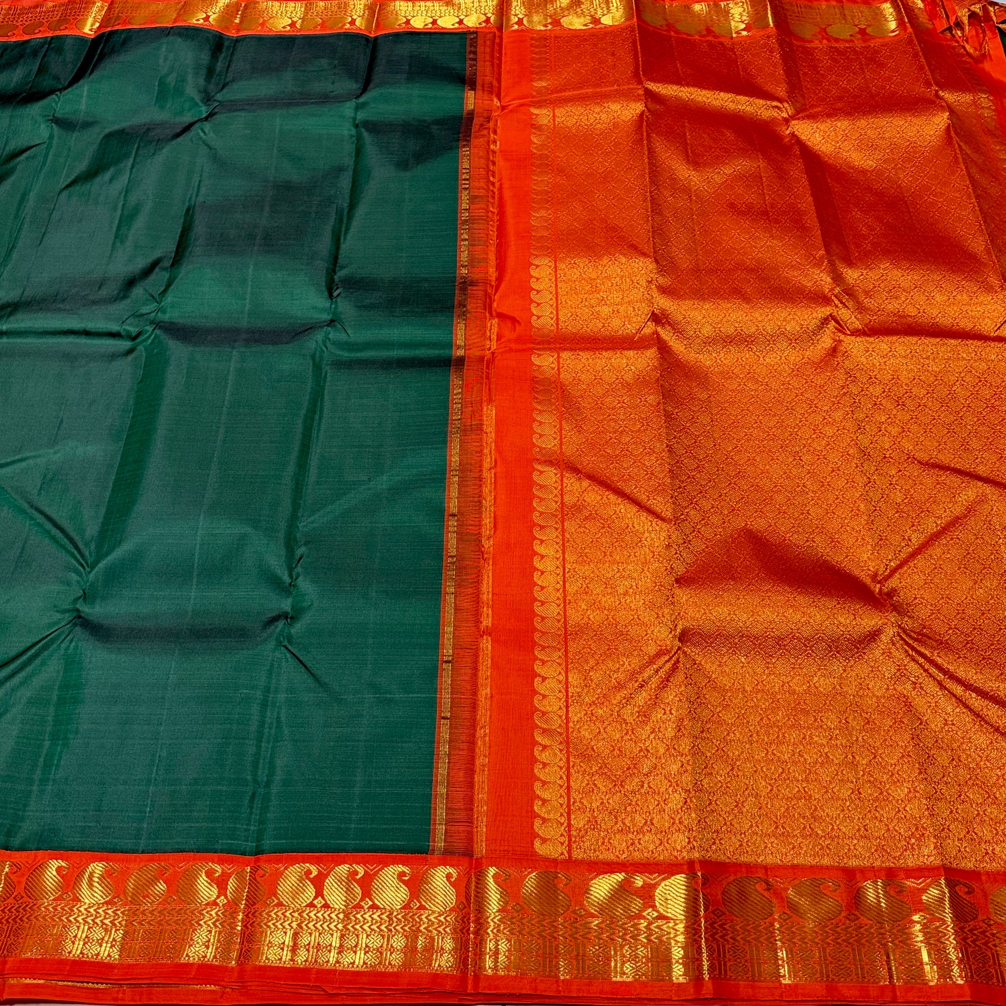 Sarasangi-Beautiful Bottle Green with Orange Handwoven Pure Korvai Kanjivaram Silk with beautiful paisleys and rudrakshas woven borders rich pallu and contrast woven blouse