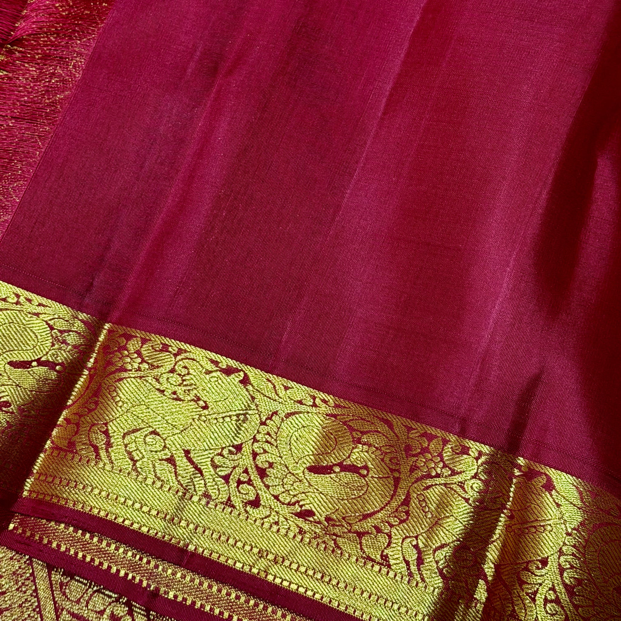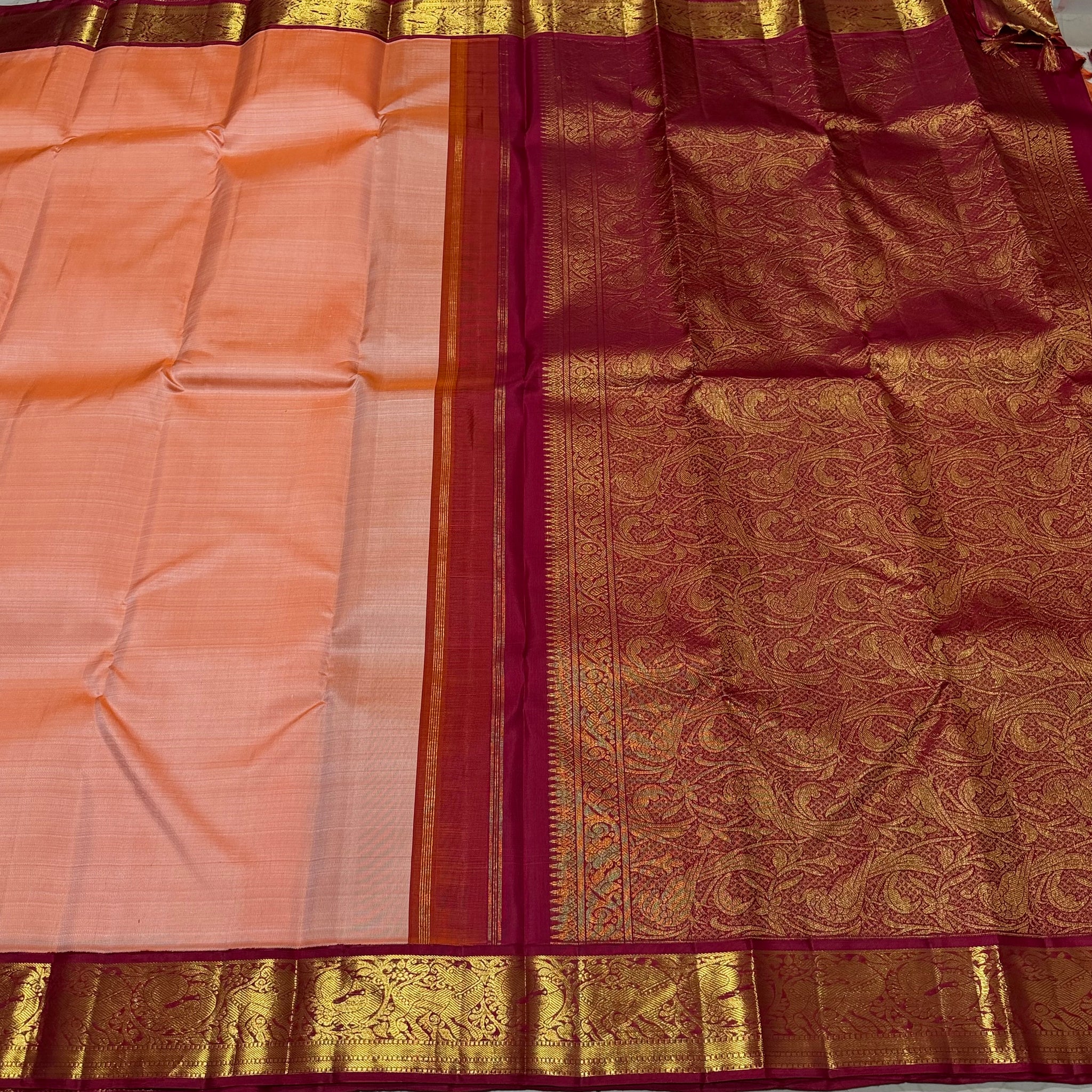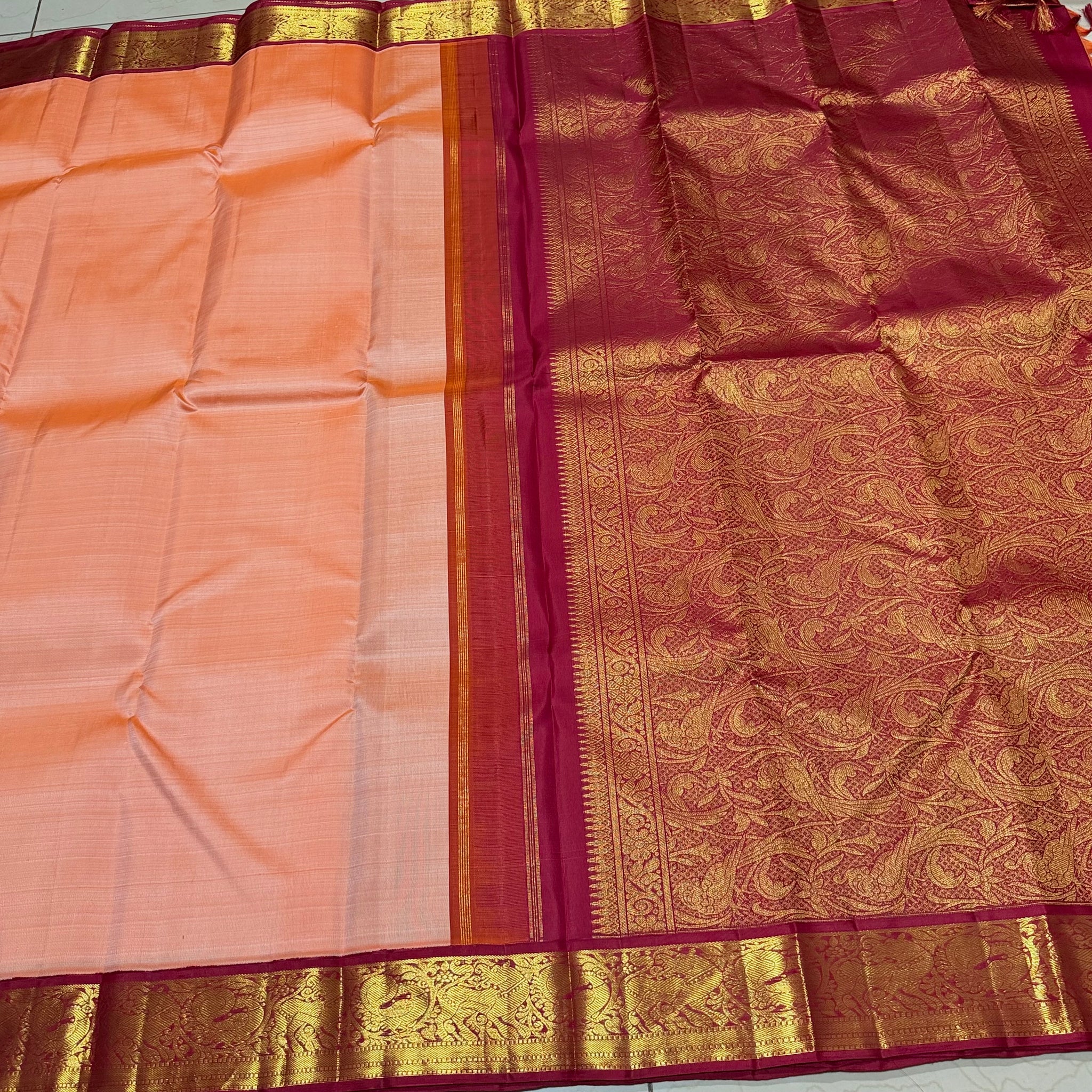 Sarasangi-Gorgeous Light Peach with Arakku Red Handwoven Pure Korvai Kanjivaram Silk with rich yazhis and peacocks woven beautiful borders rich parrots woven pallu and contrast woven blouse