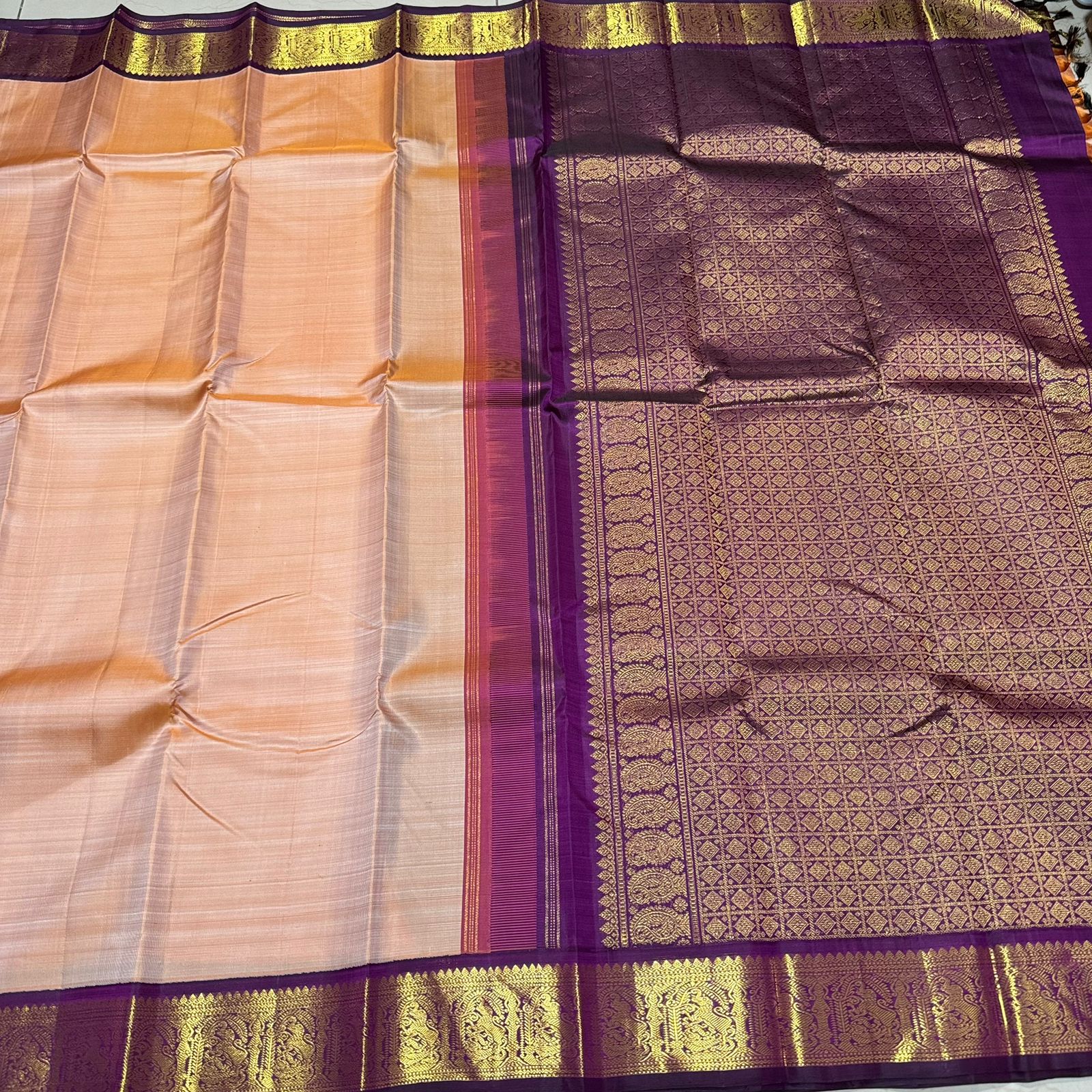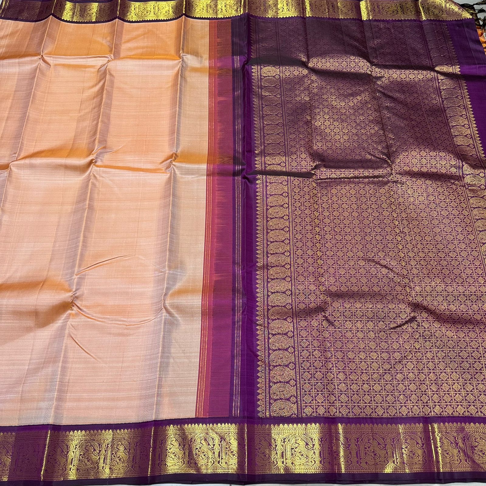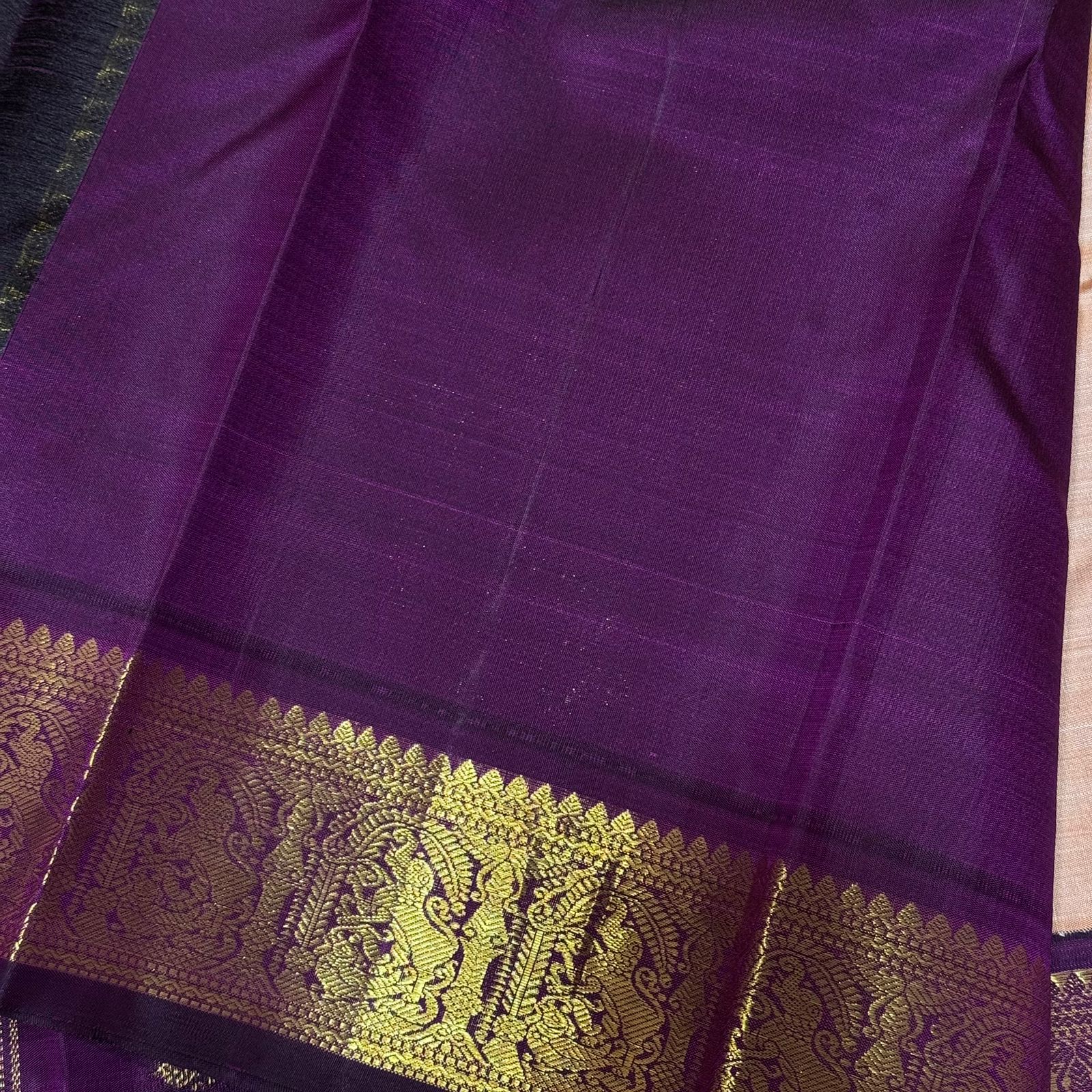 Sarasangi- Gorgeous Sandal with Deep Purple Handwoven Pure Jari Korvai Kanjivaram Silk with beautiful yazhis and annapakshis woven borders rich pallu and contrast woven blouse