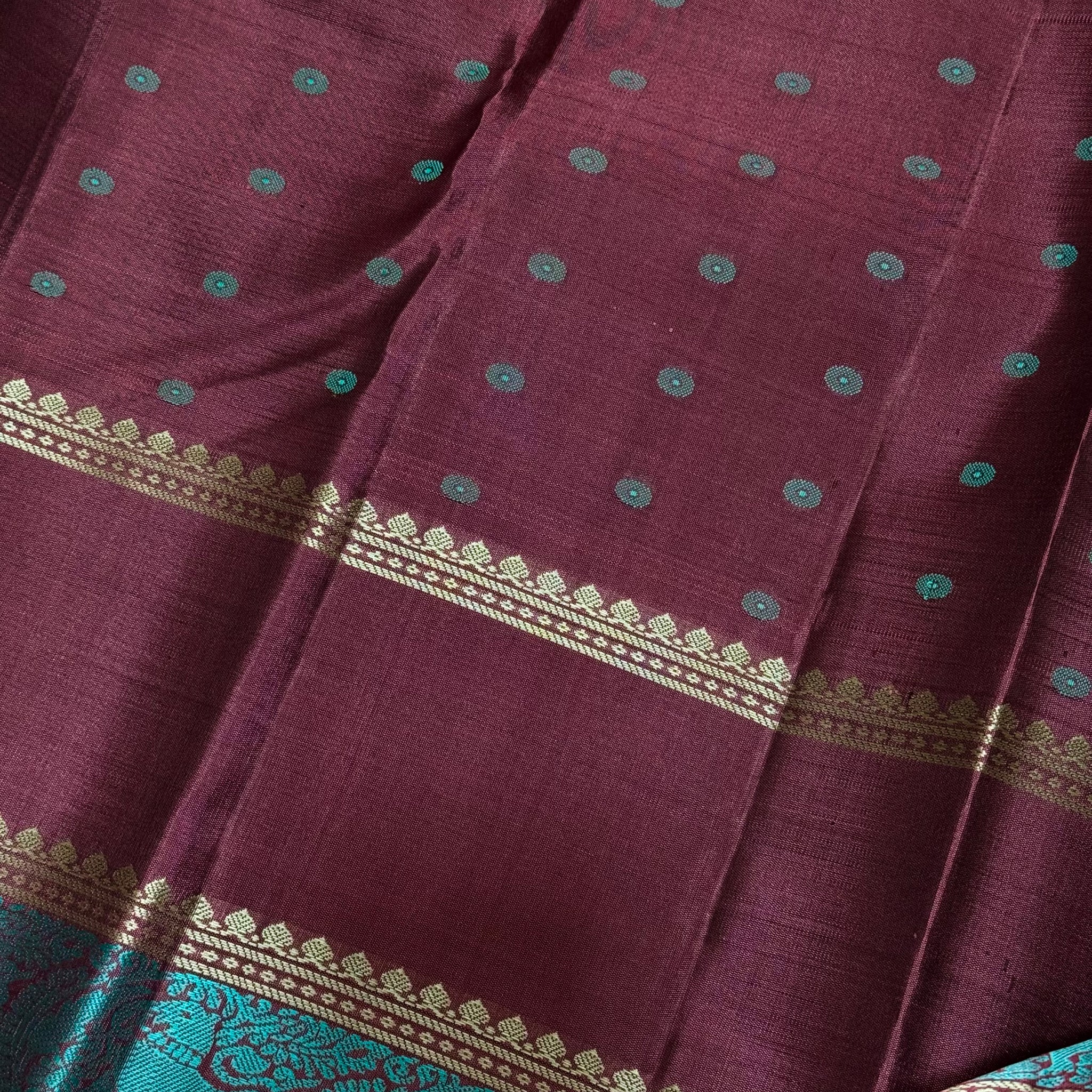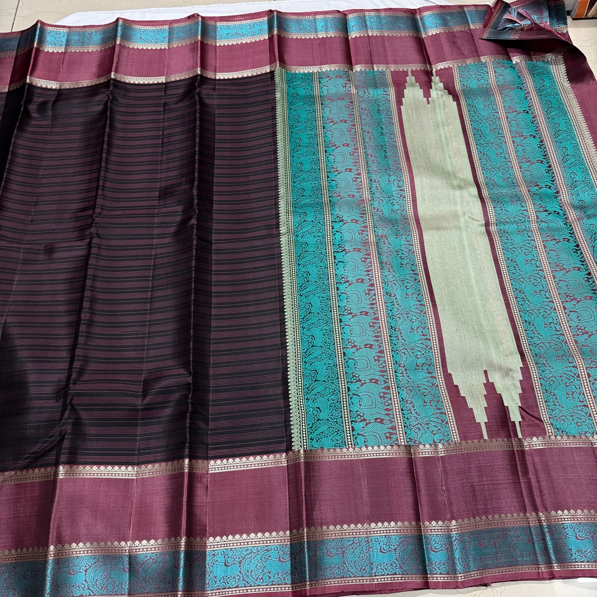 Stunning Black with Teal and Brown Handwoven Pure Zariless Kanjivaram Silk with beautiful borders striped body rich pallu and buttas woven blouse