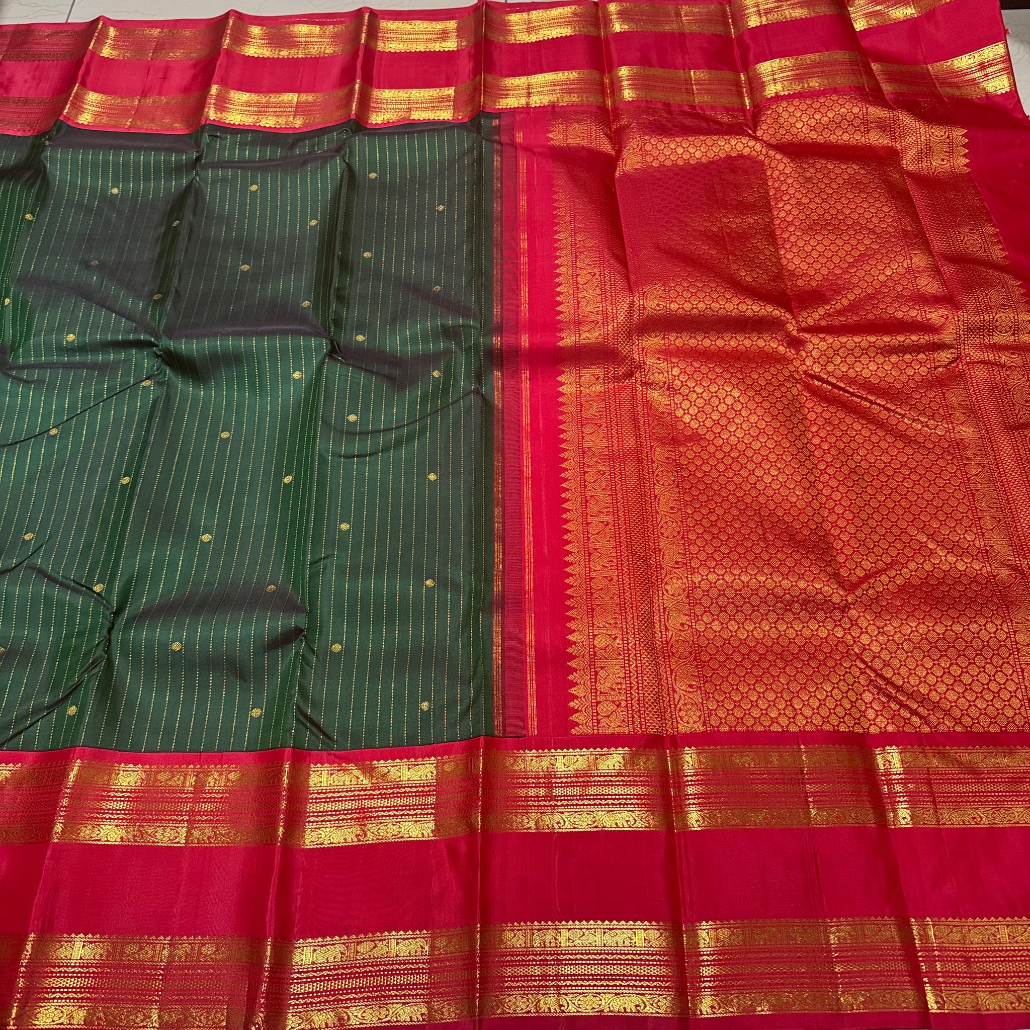 Gorgeous Bottle Green with Red Handwoven Pure Jari Korvai Kanjivaram Silk Saree with beautifully Jari oosi lines woven vertically all over the body with jari polka dots in between dazzling with very intricately woven rettaipet broad borders gorgeous and painstakingly woven beautiful pallu and contrast woven blouse. A truly unique piece to own in a very tradtional and rich combination in a Handwoven Kanjivaram Silk