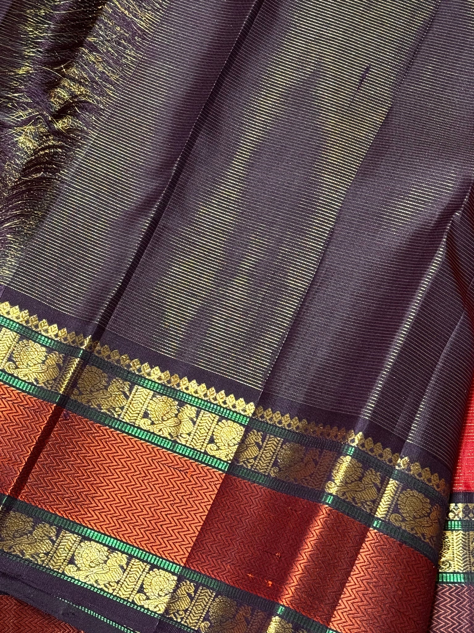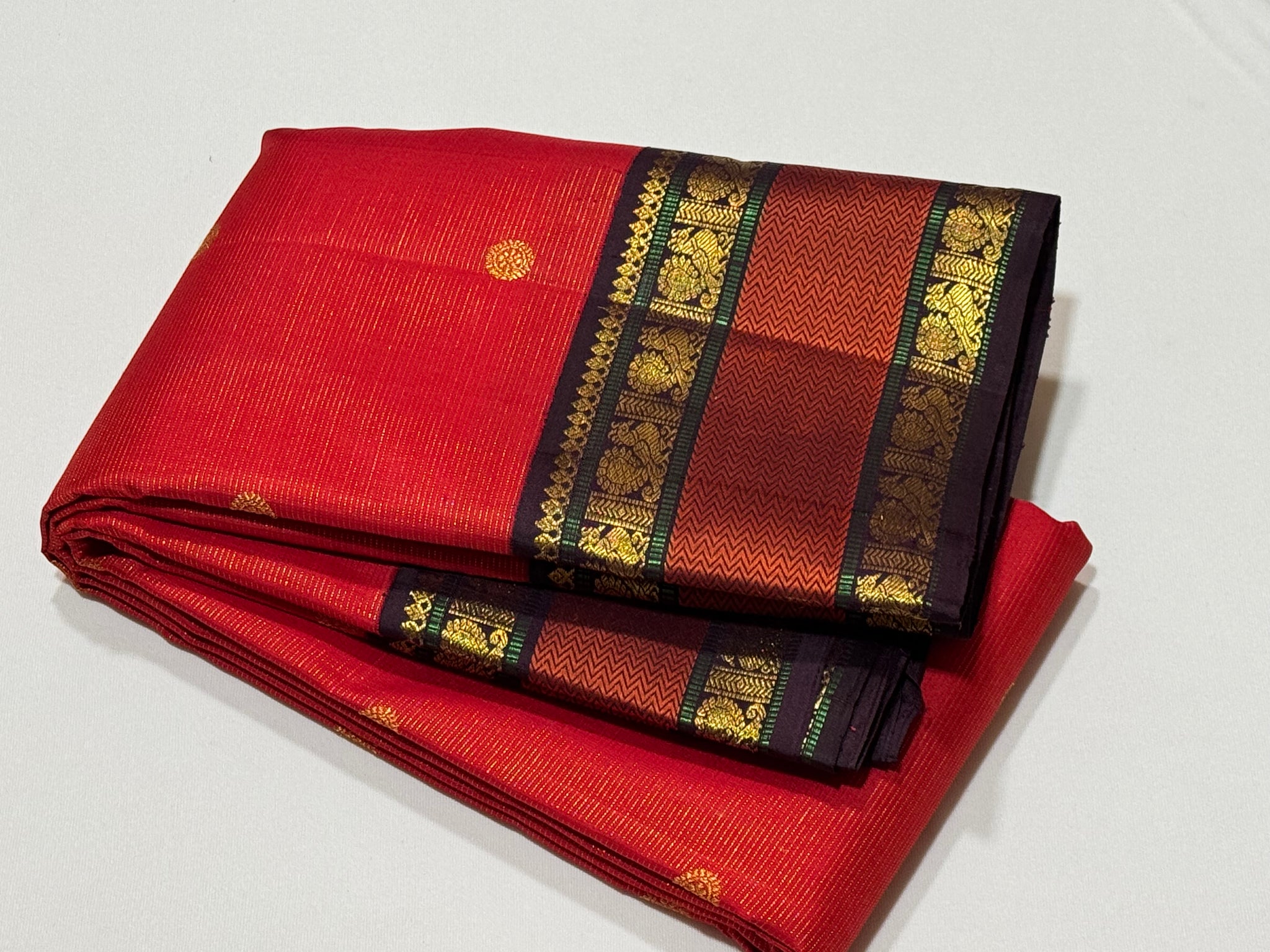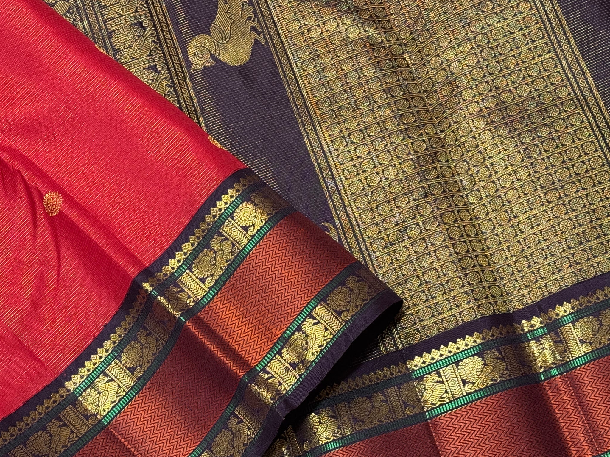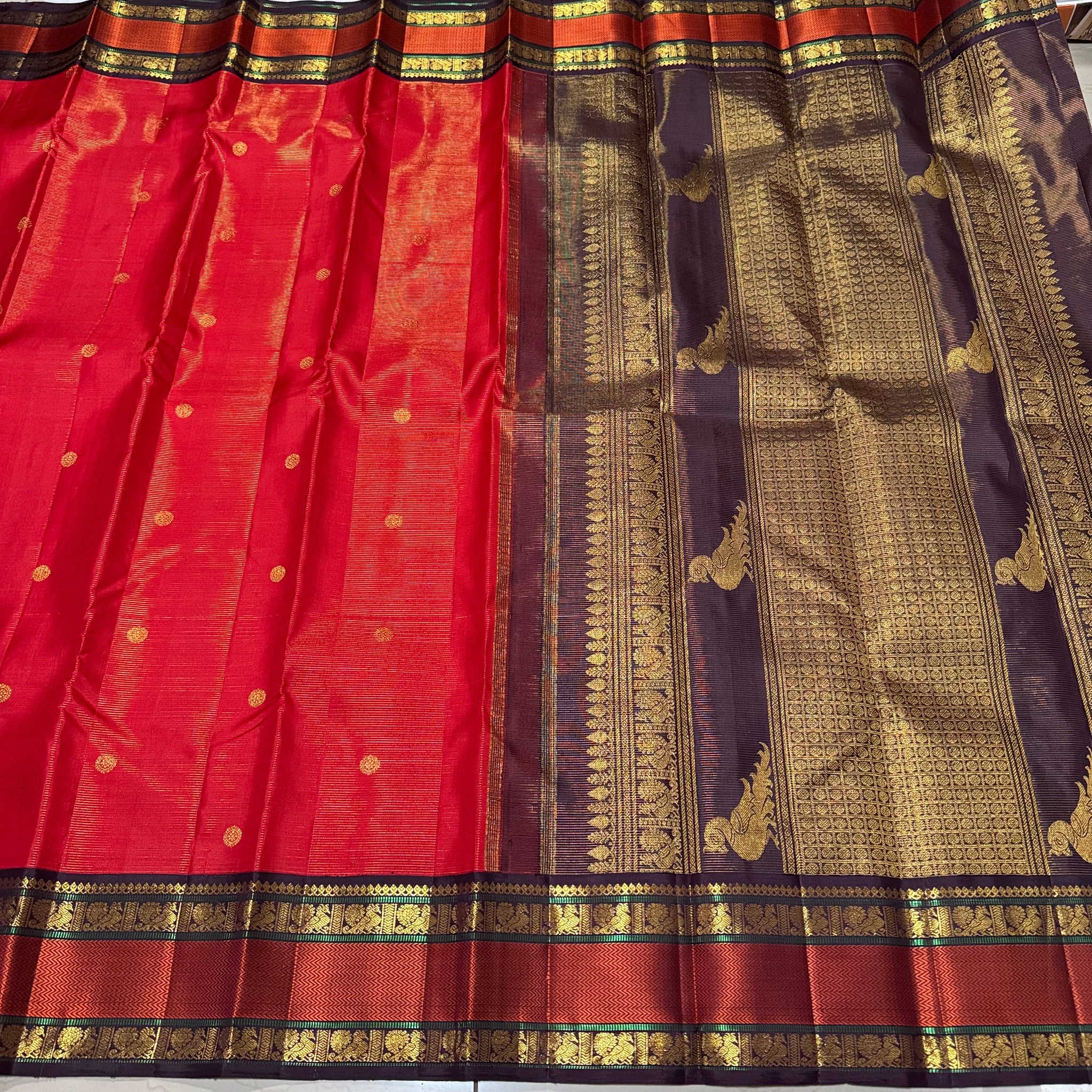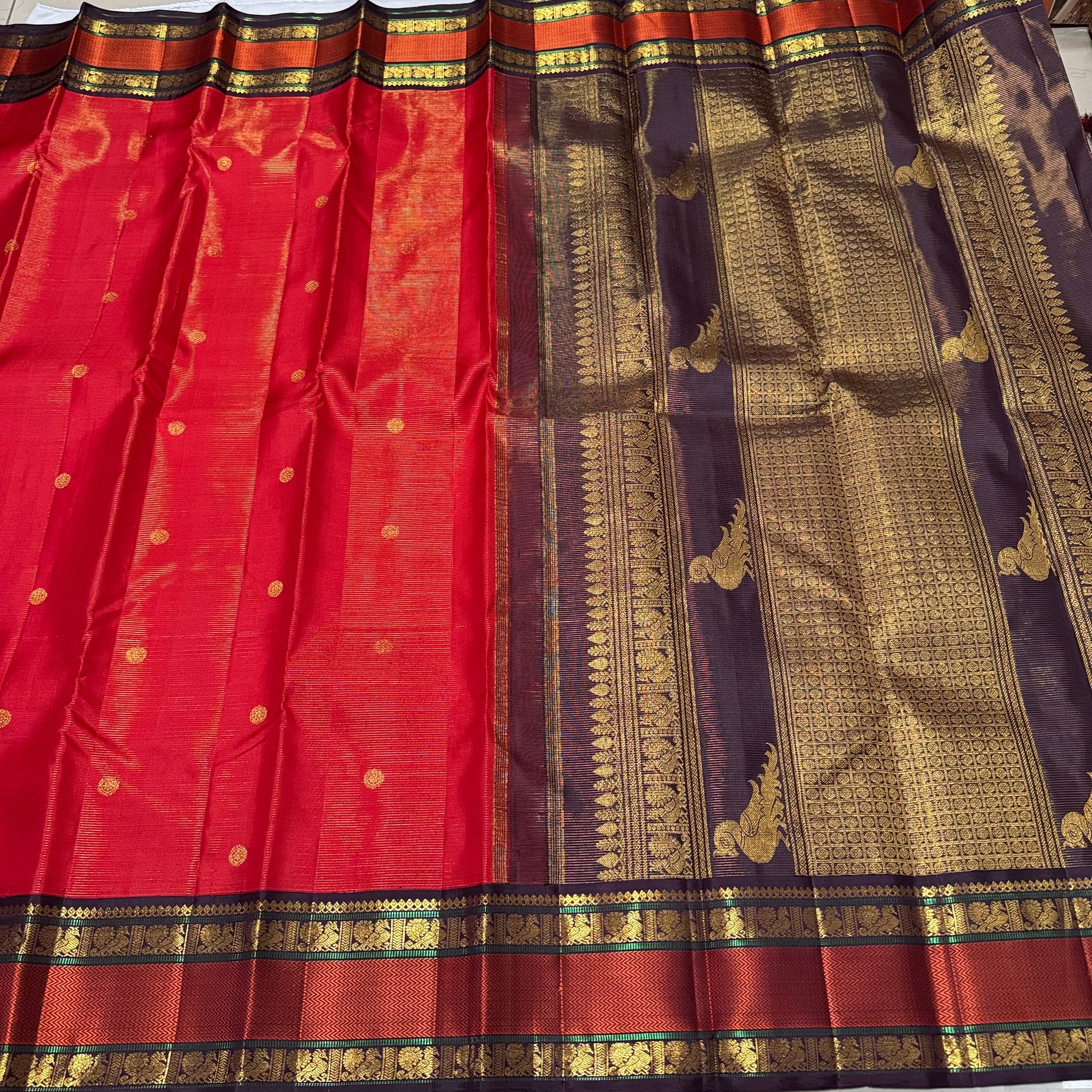 Stunning Red with Coffee Brown Vairaoosi with Buttas and Doublepet Meenakari Matte Finish Borders in Jari and Silk threads in a Pure Jari Handwoven Kanjivaram Silk with super gorgeous Kalakshetra kilis woven pallu and a very beautiful contrast blouse.