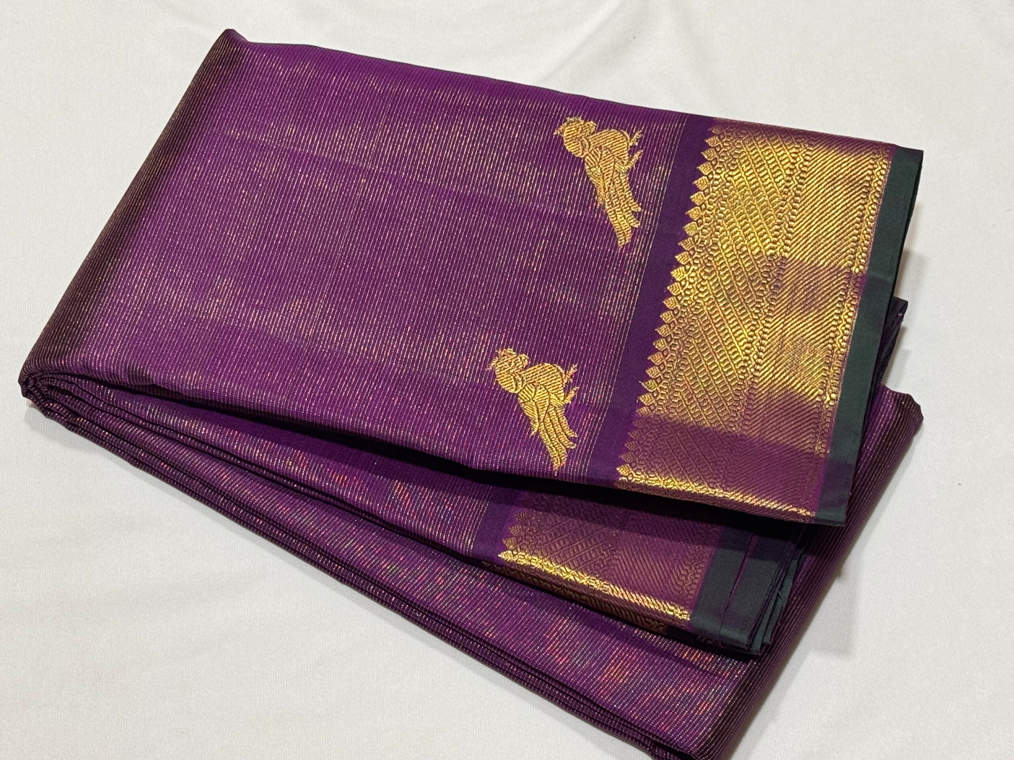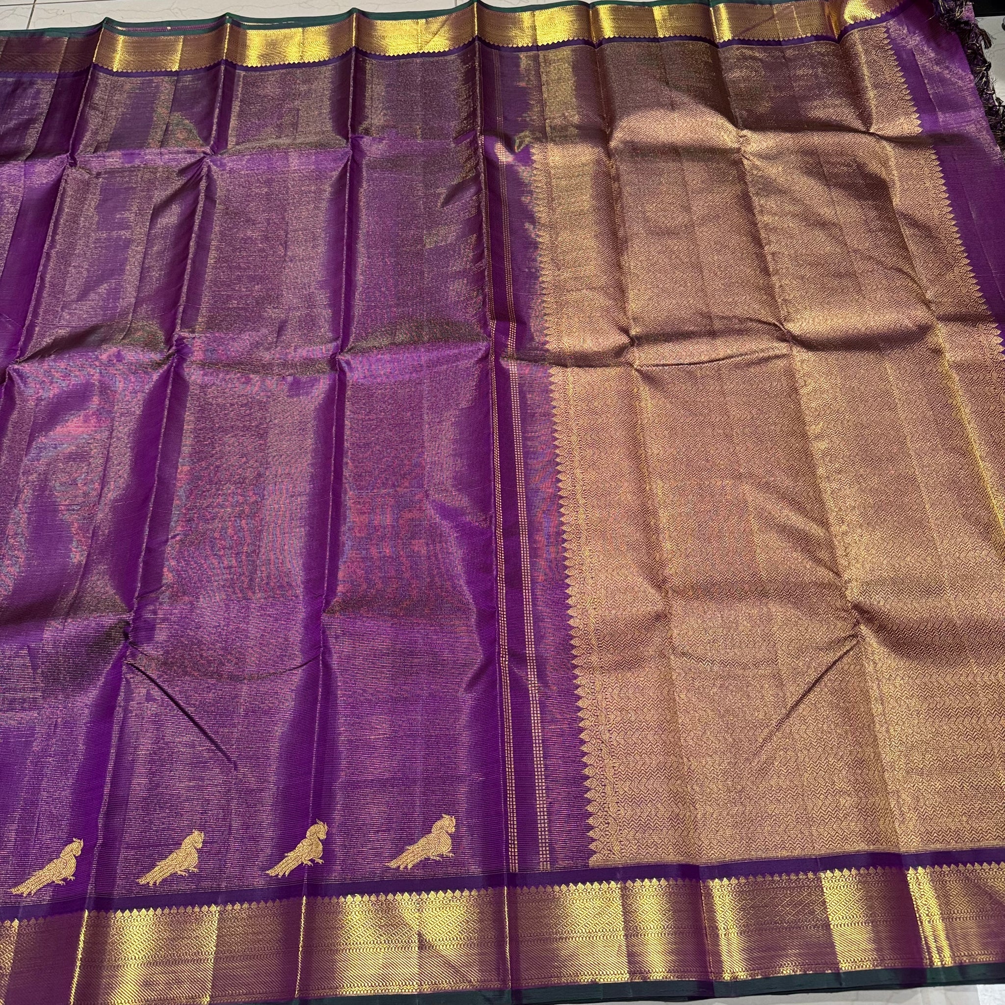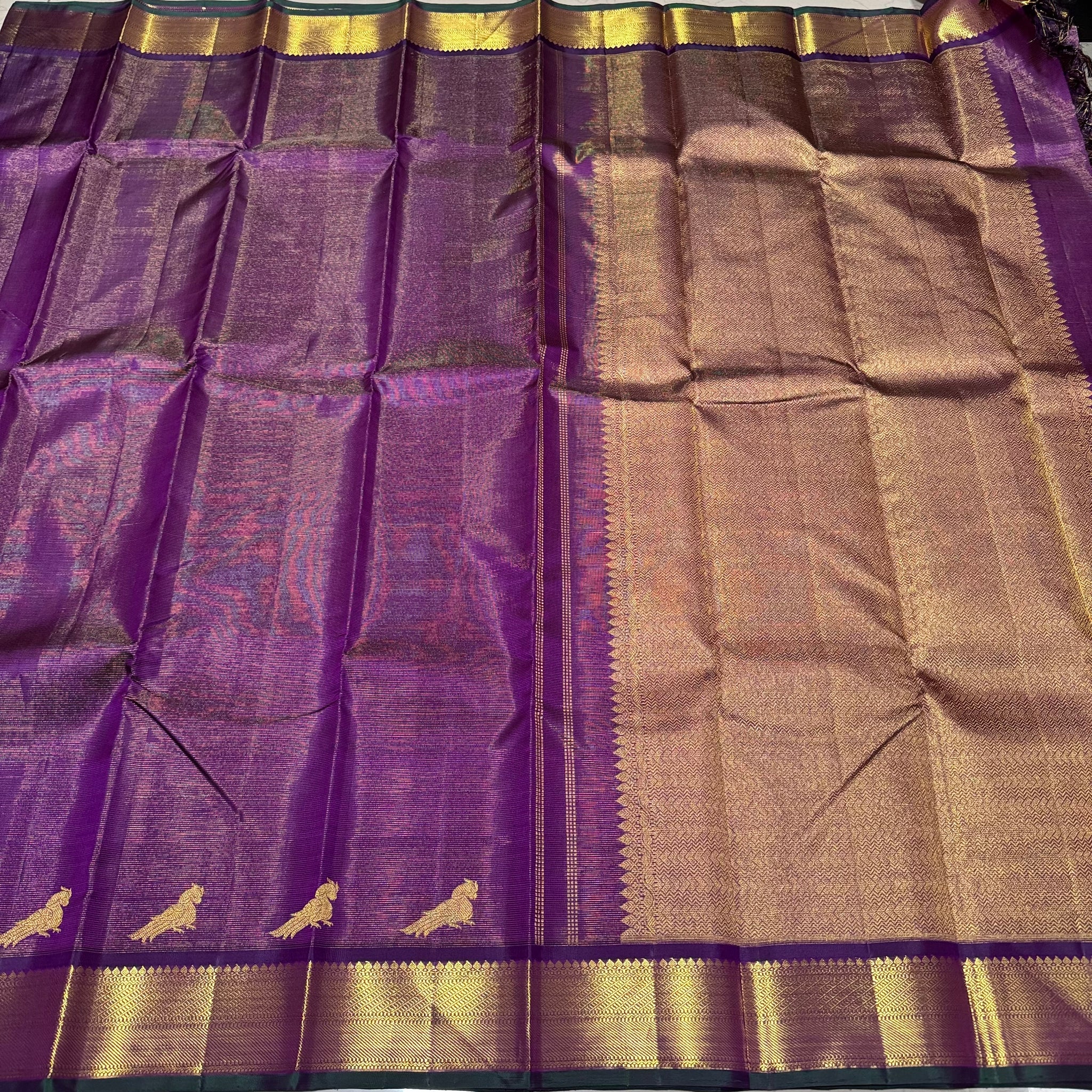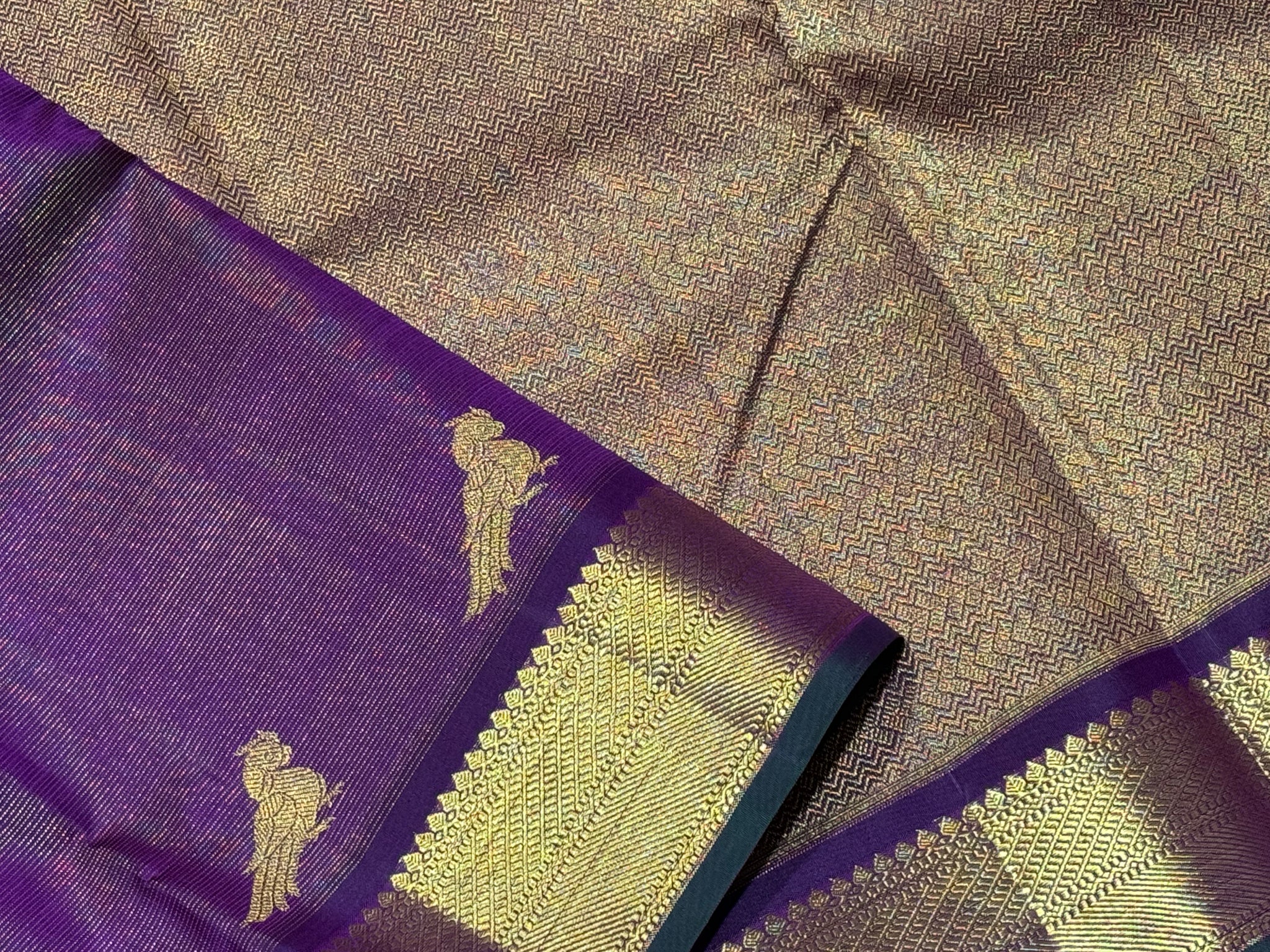 Beautiful Purple with Gold Handwoven Pure Vairaoosi Woven Kanjivaram Silk with Parrots woven beautiful lower borders with rich borders pallu and self colored blouse