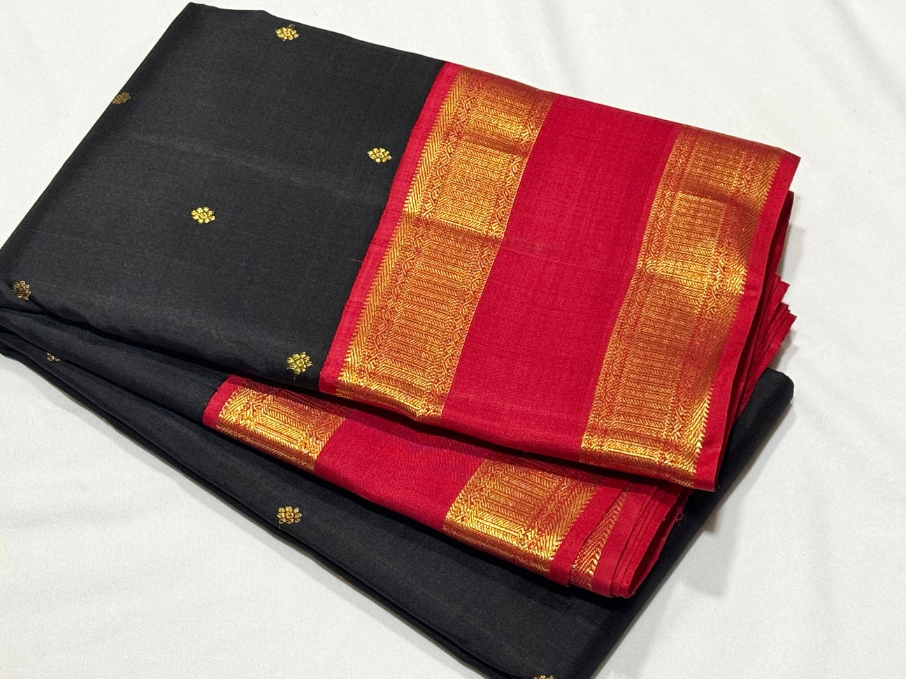 Vaibhogam -Stunning Black with Red Handwoven Pure Jari Kai Korvai Kanjivaram Silk Saree with Doublepet Borders woven body with beautiful small buttas woven all over with rich pallu and contrast woven blouse