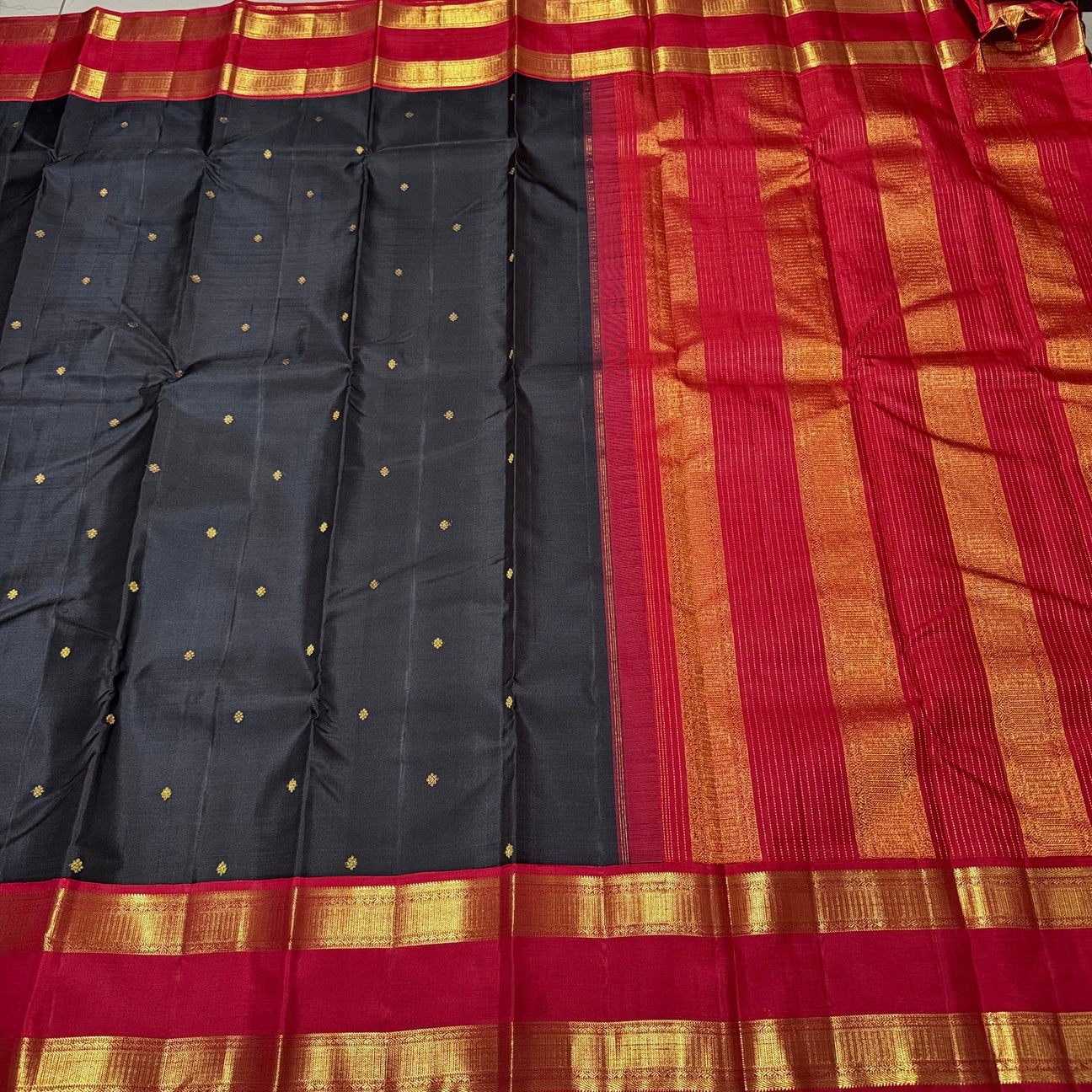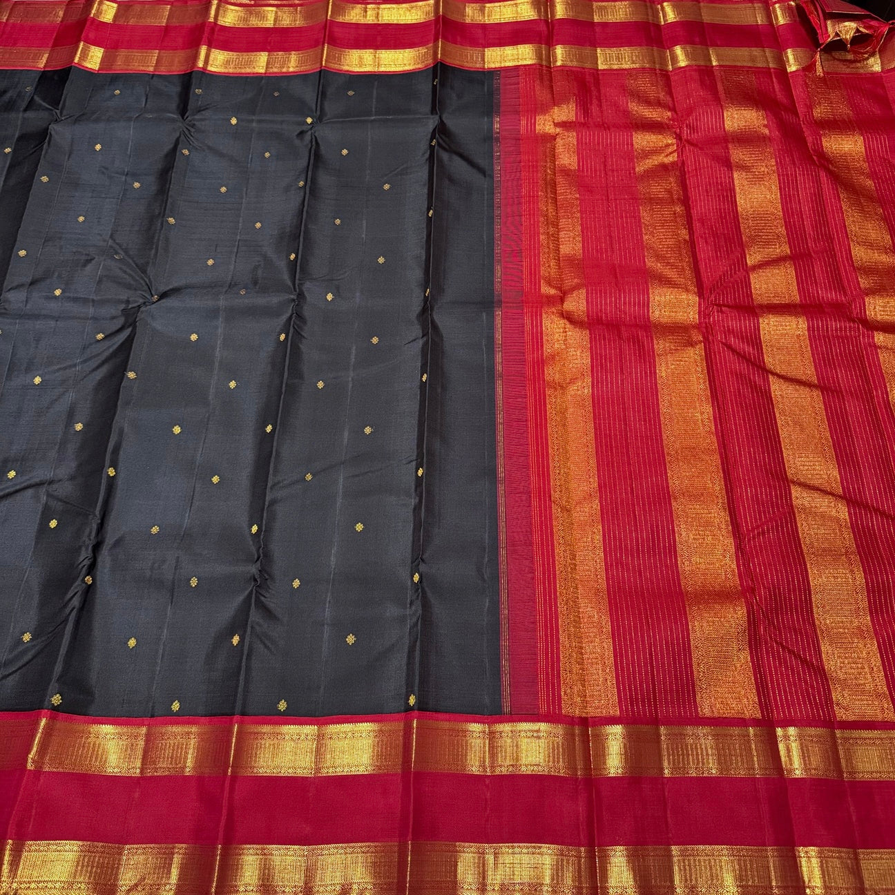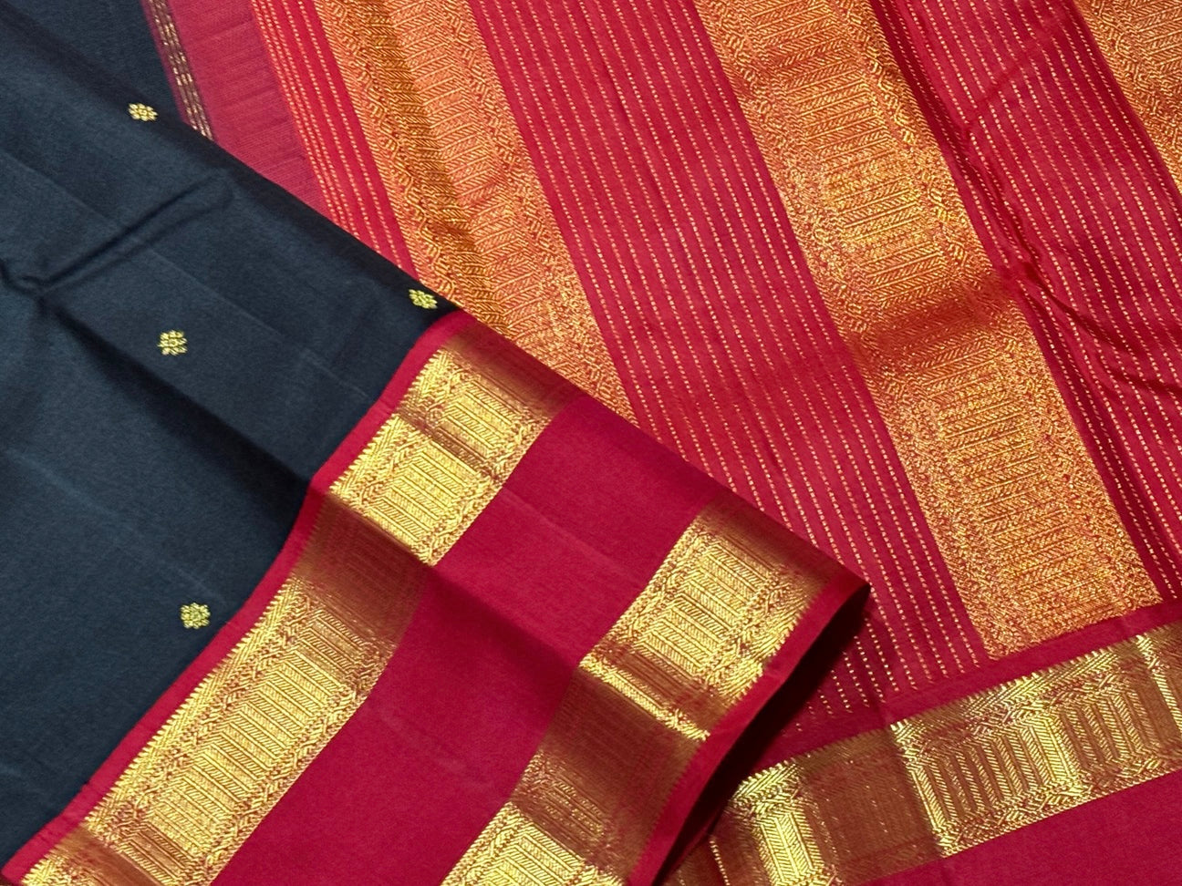 Stunning Black with Deep Red Handwoven Pure Jari Kai Korvai Kanjivaram Silk Saree with Doublepet Borders woven body with beautiful small buttas woven all over with rich pallu and contrast woven blouse