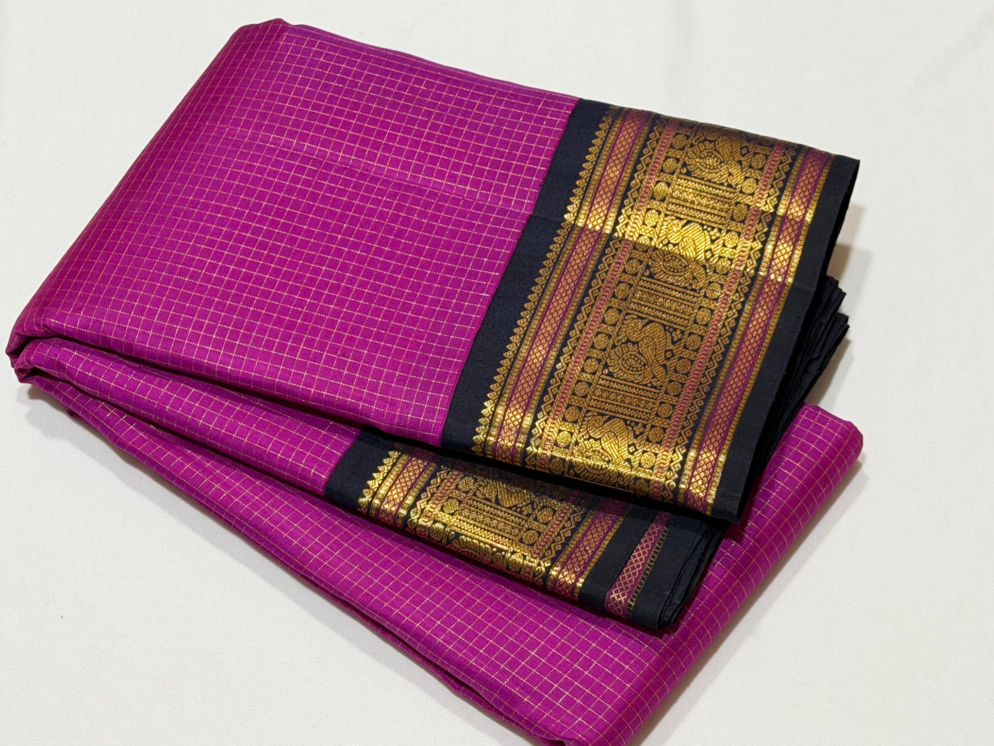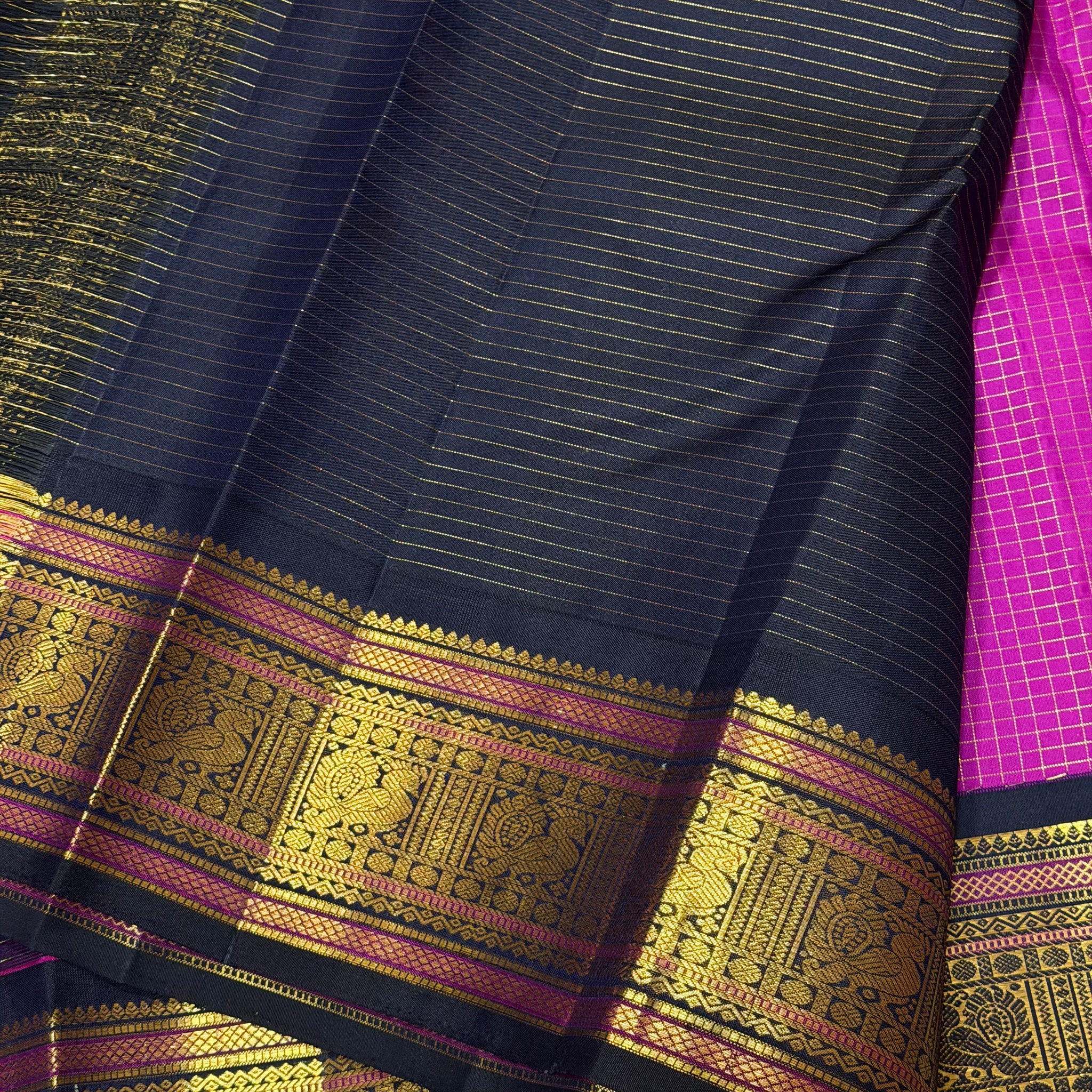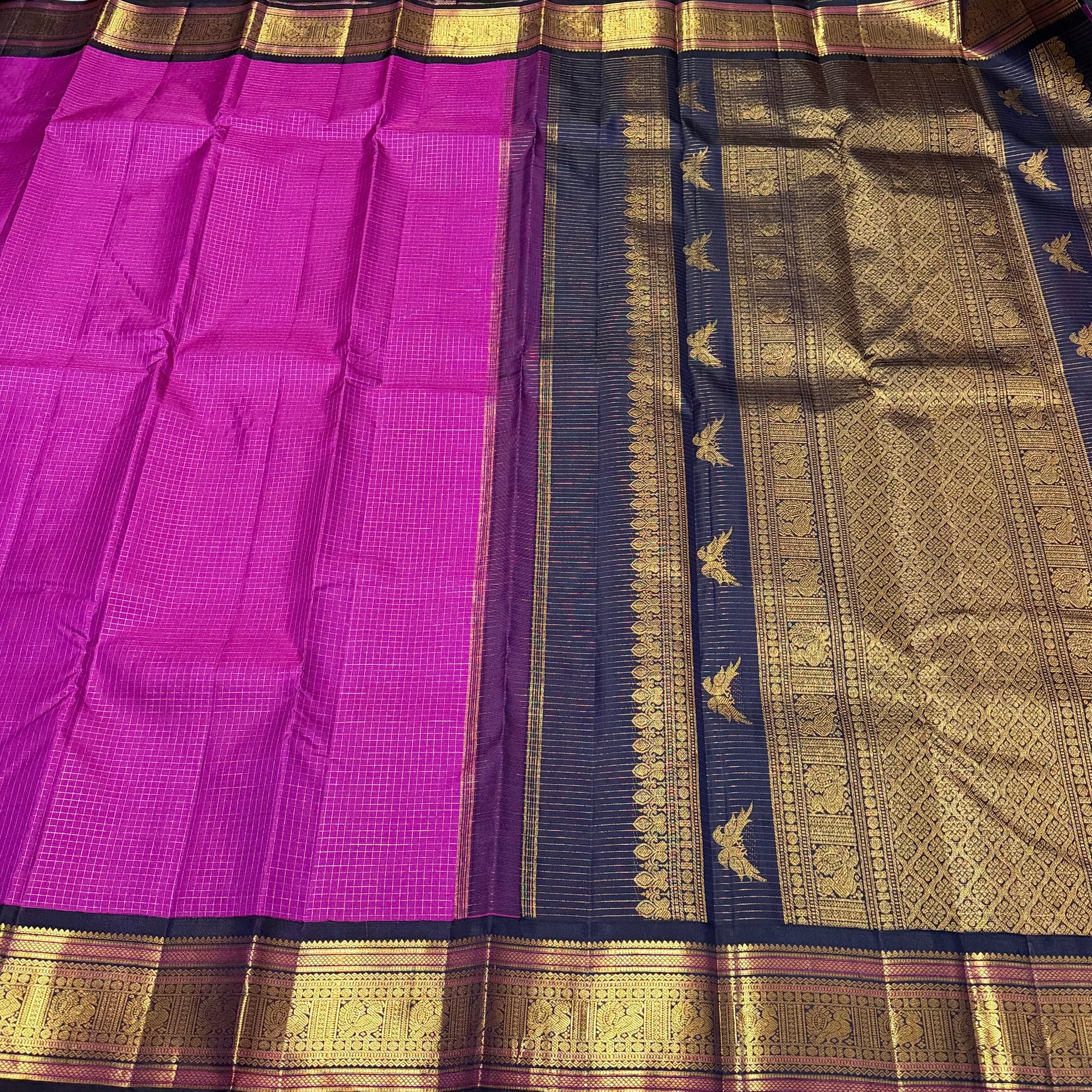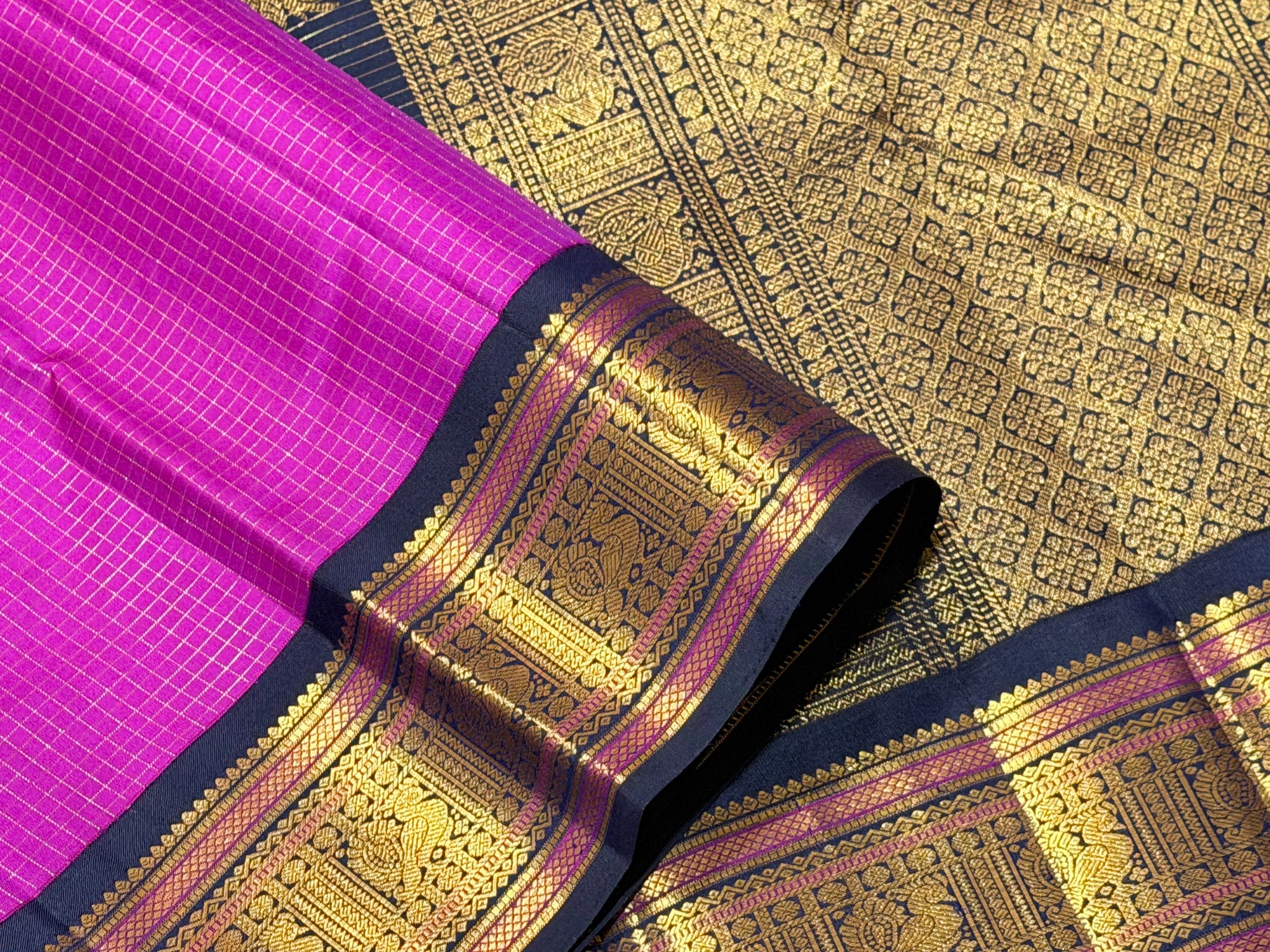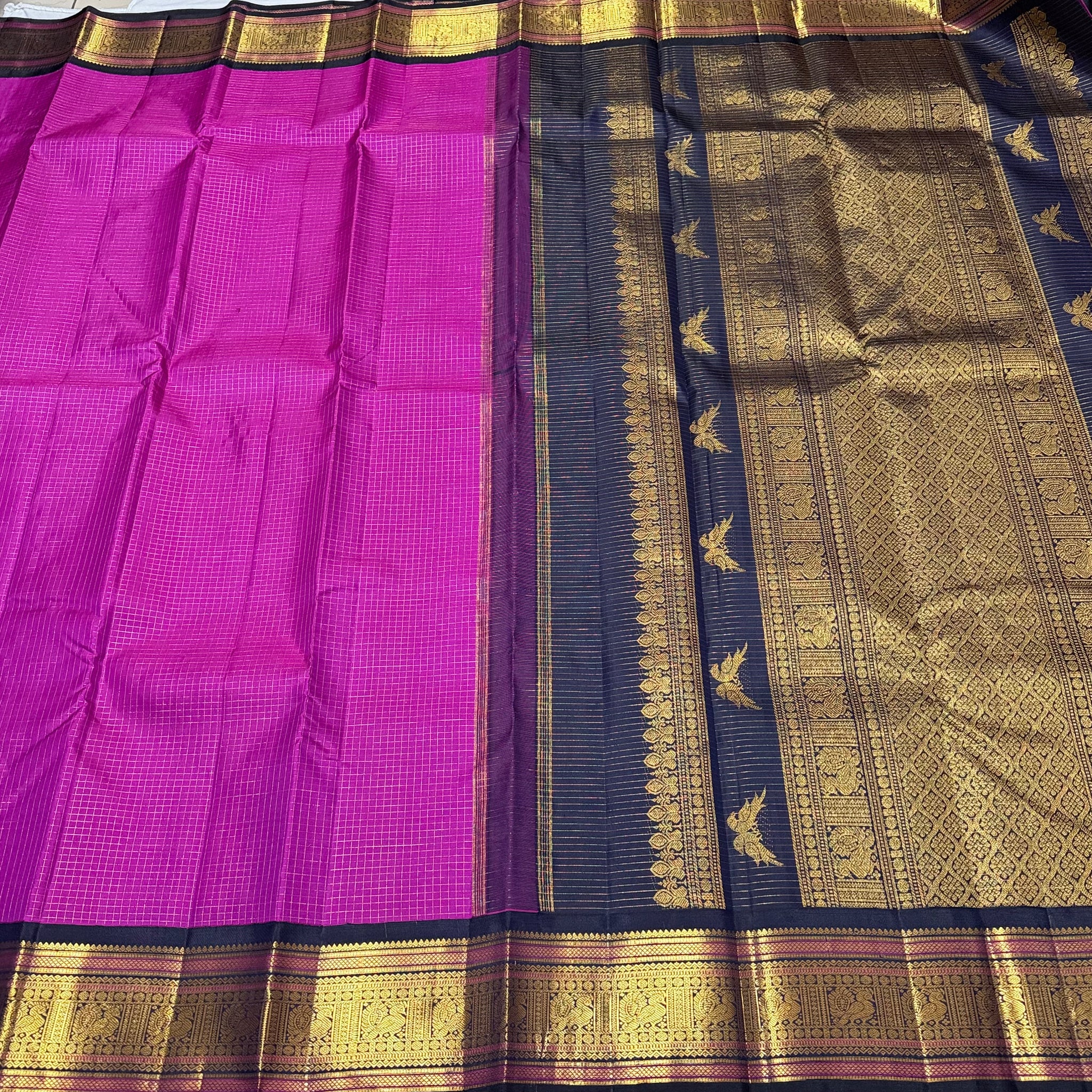 Vaibhogam- Stunning Magenta with dark kanchana blackish Blue Vairaoosi checks Handwoven Pure Jari Korvai Kanjivaram Silk with Rettaikili buttas woven body, beautiful borders rich pallu with bird buttas and contrast Vairaoosi woven blouse