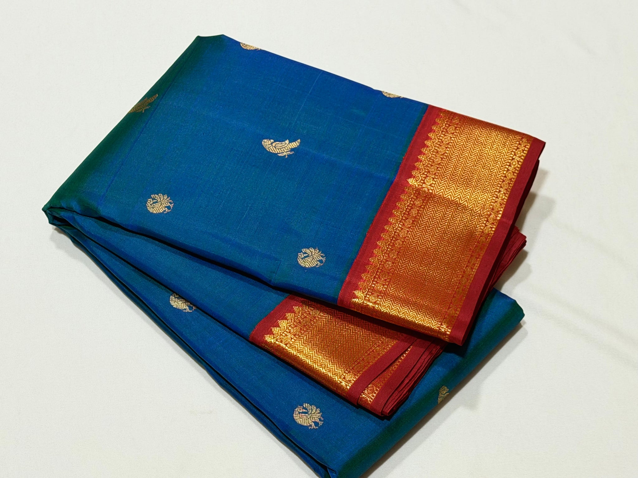 Vaibhogam- Stunning Peacock Blue with Dark Red Handwoven Pure Jari Korvai Kanjivaram Silk with Mayil Kuyil Buttas Woven beautiful body with rich borders veey uniquely woven pallu with elephants flying horses peacocks in 1000 buttas style and contrast woven blouse.