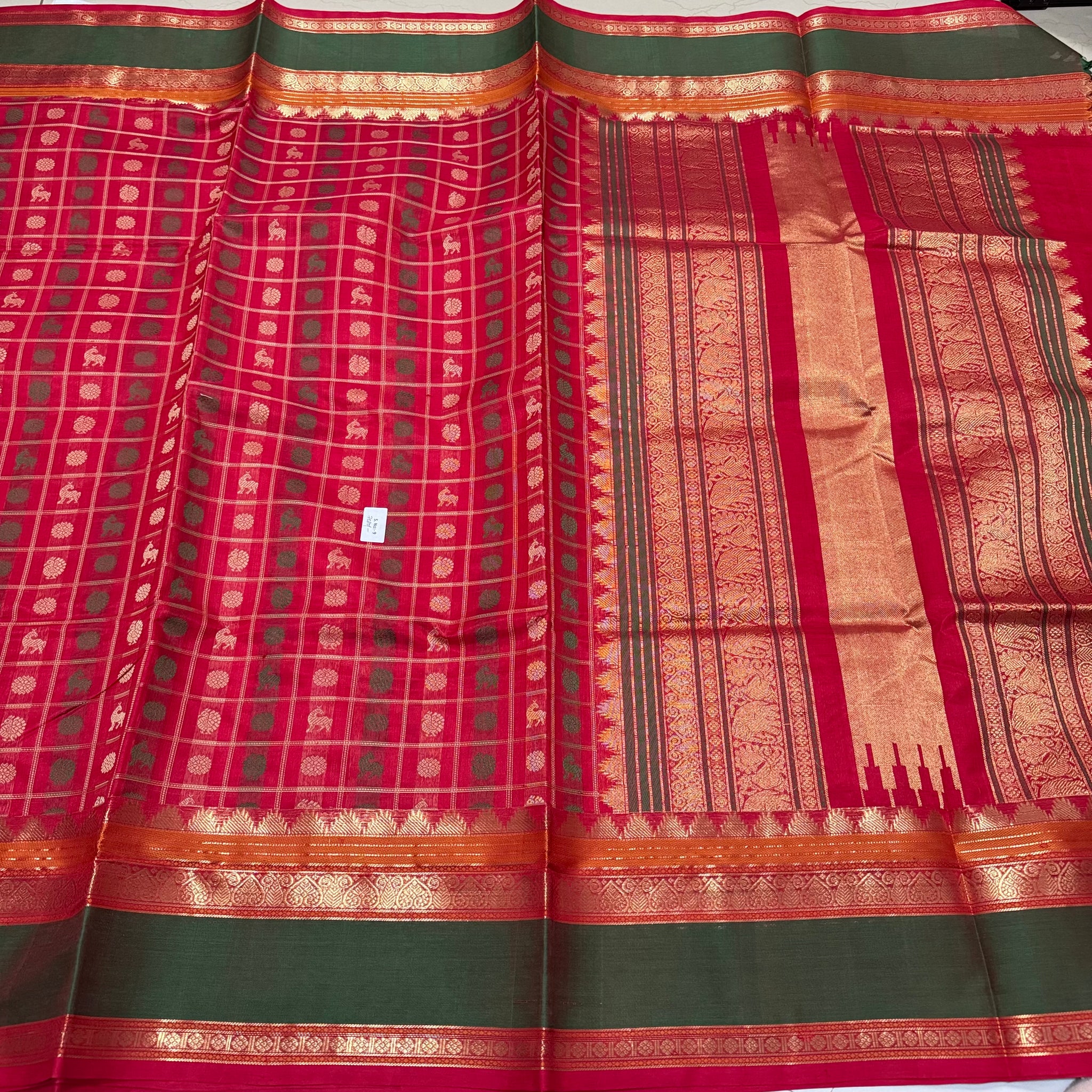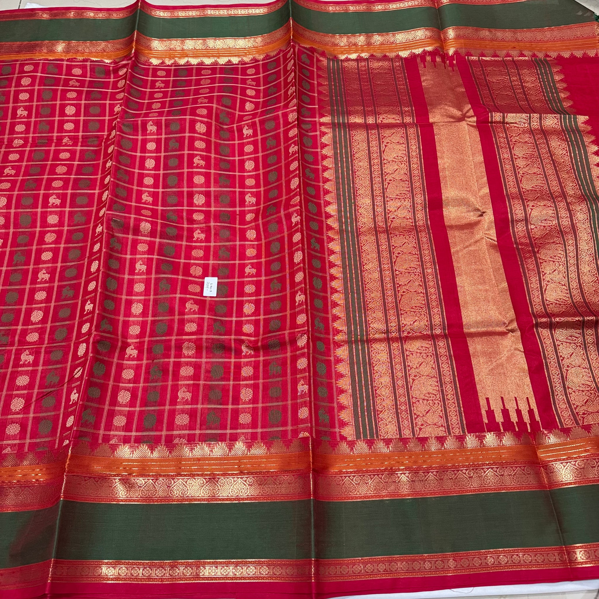 Gorgeous Red & Green 1000 Buttas deers Mayil chakrams Handwoven Premium Kanjivaram Silkcotton Saree Beauty
