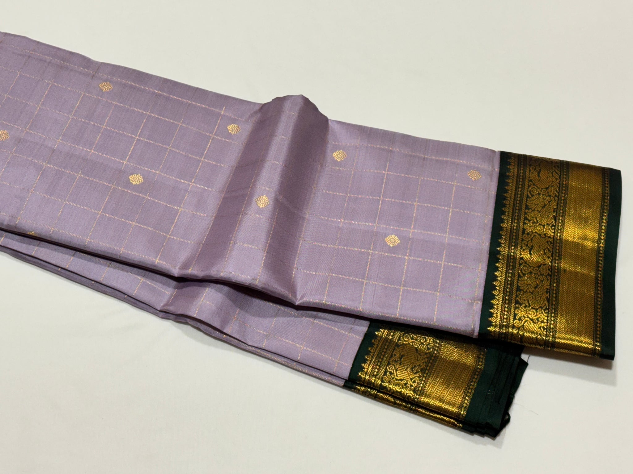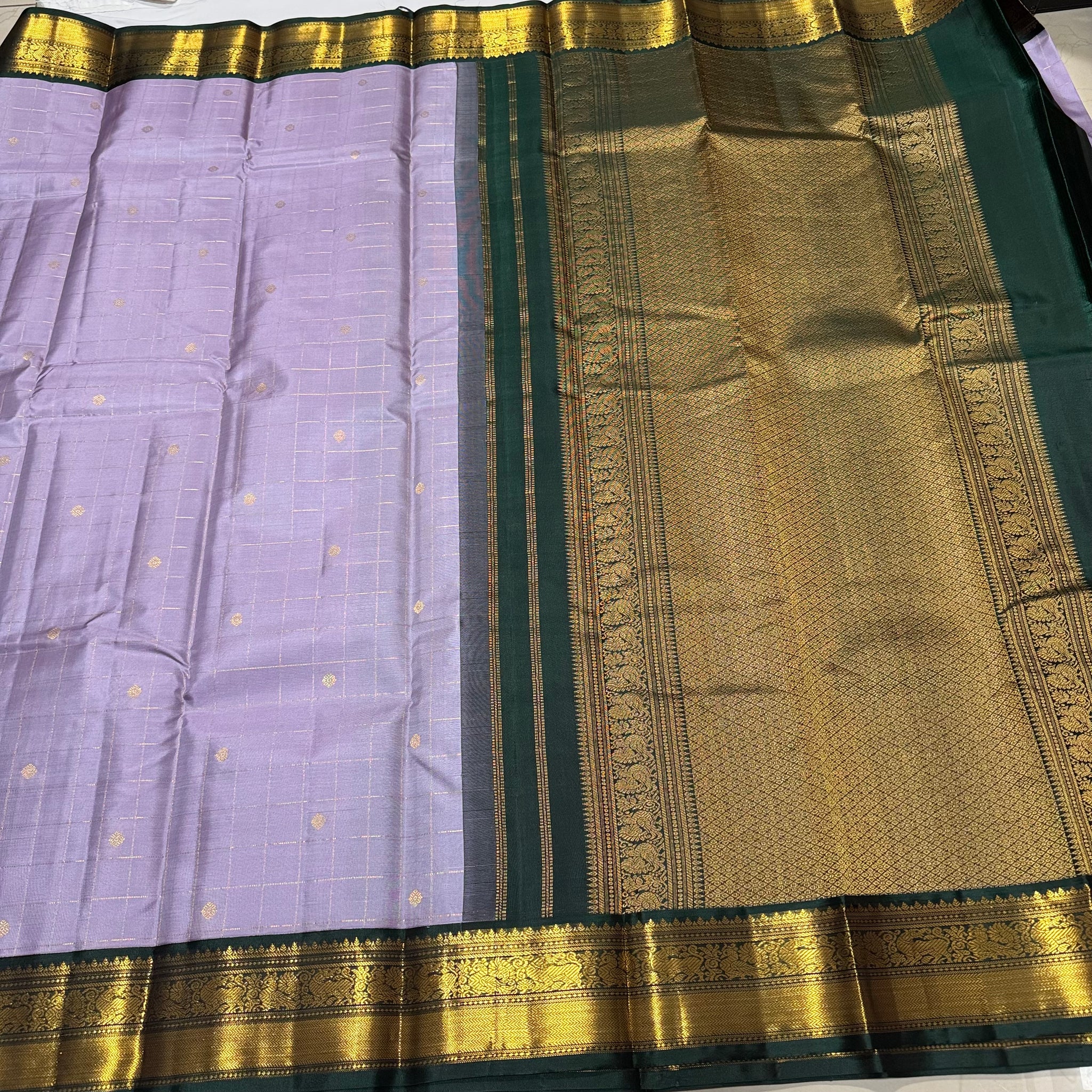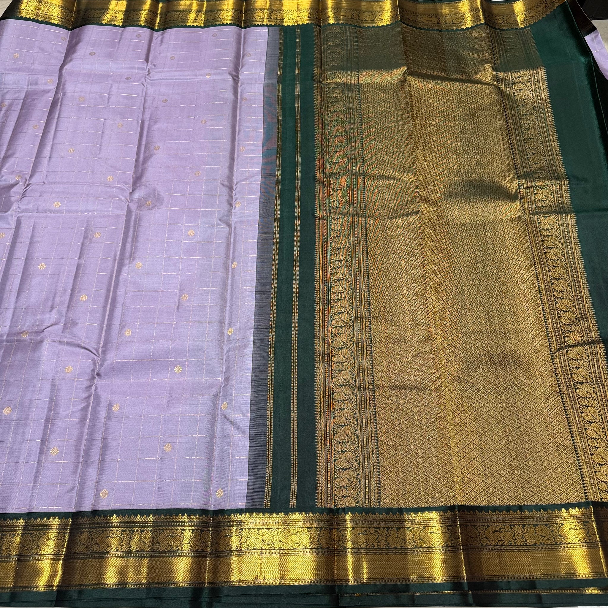 Lavendar with Bottle Green  Jari  Kattam with Buttas Small Borders Rich Pallu and Contrast blouse Handwoven Pure Kanjivaram Silk Saree Beauty