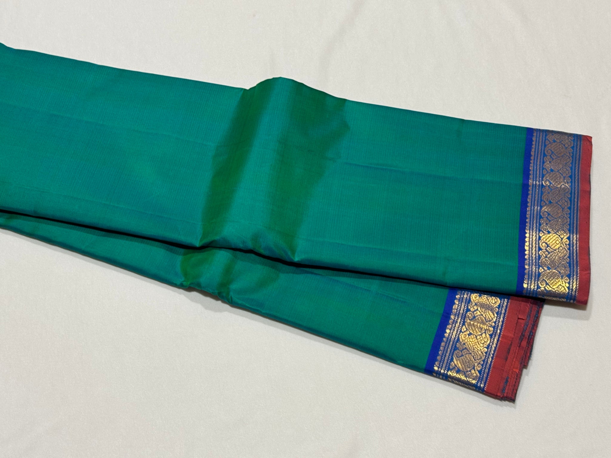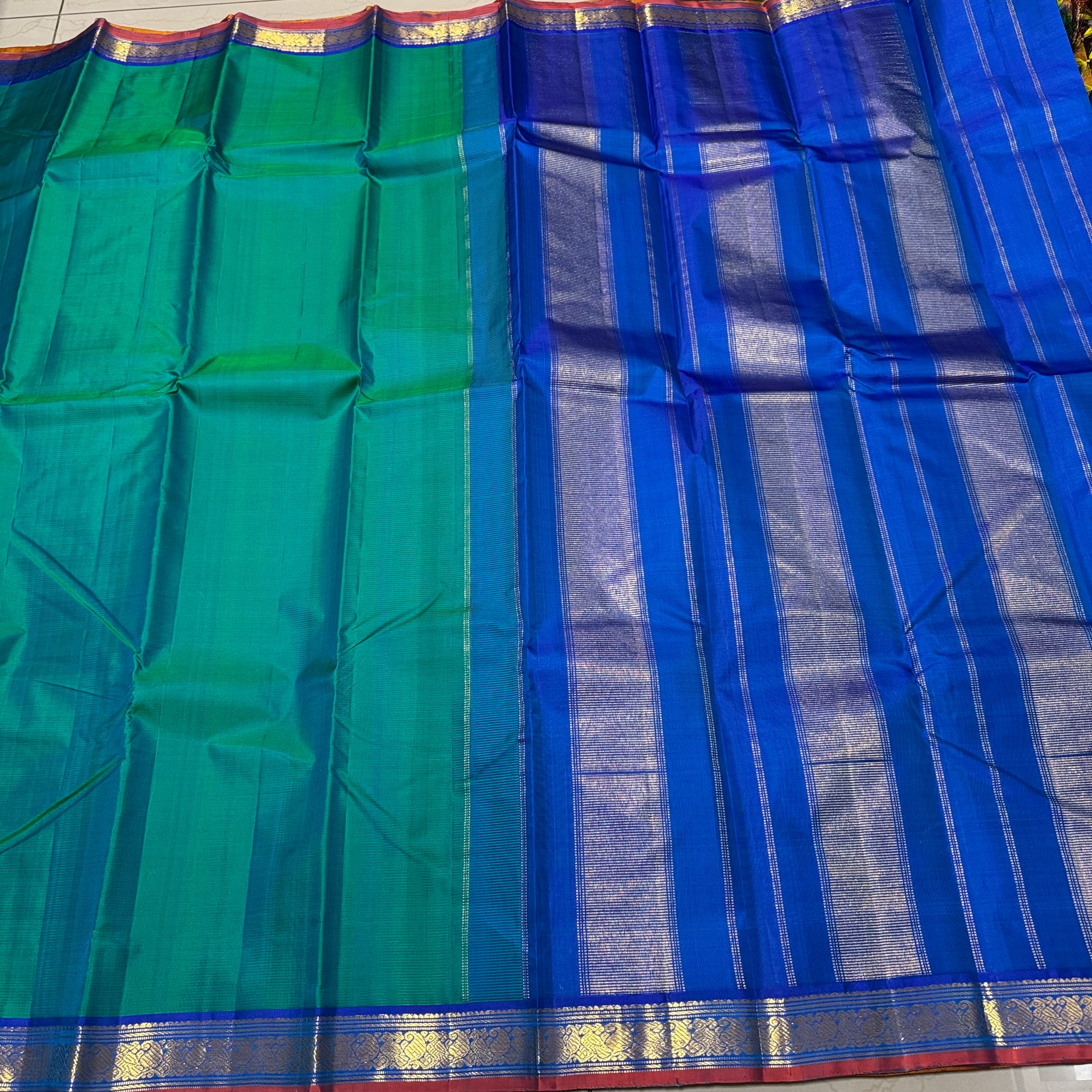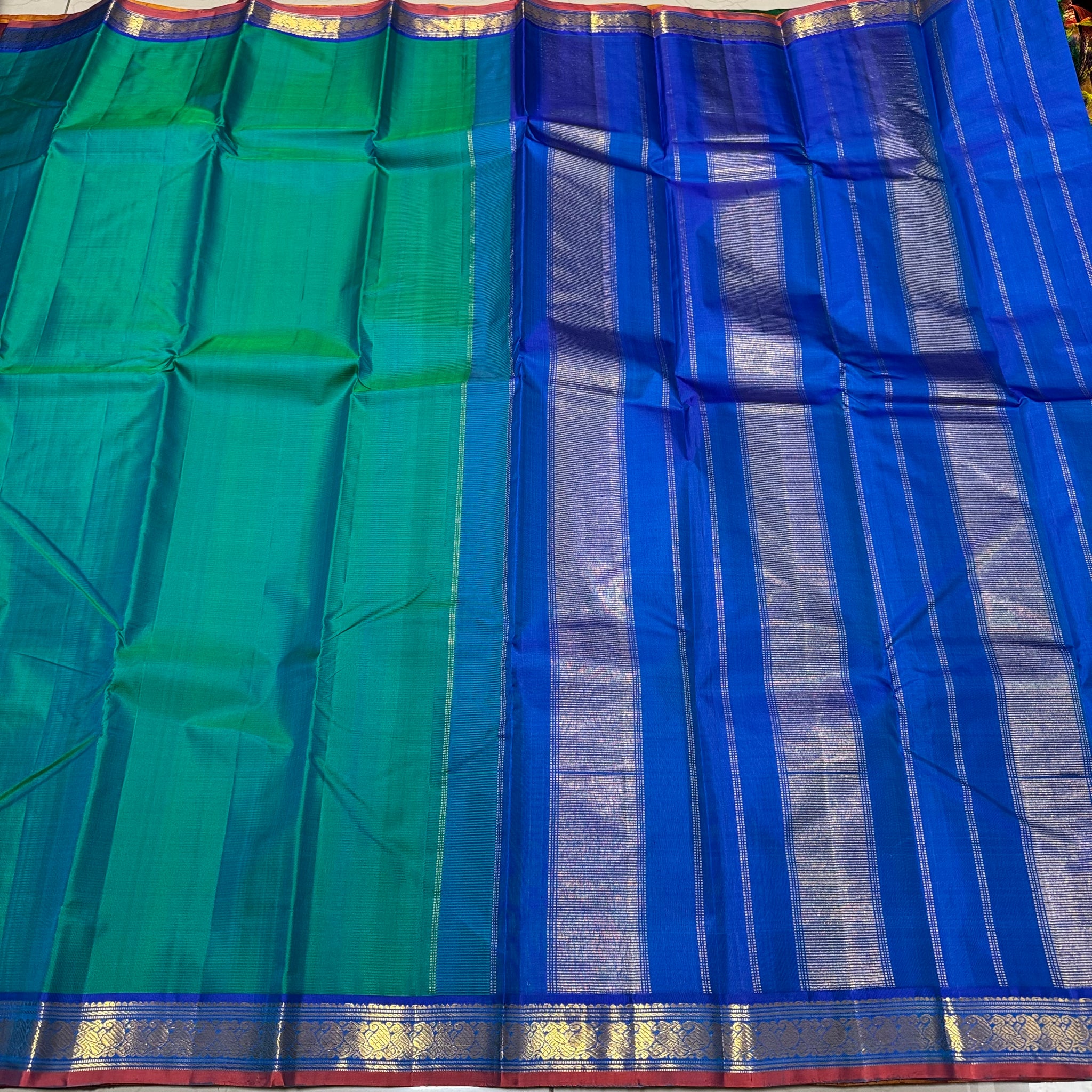 Peacock Green with Peacock Blue Small Borders Handwoven Pure Jari Kanjivaram Silk Saree Beauty