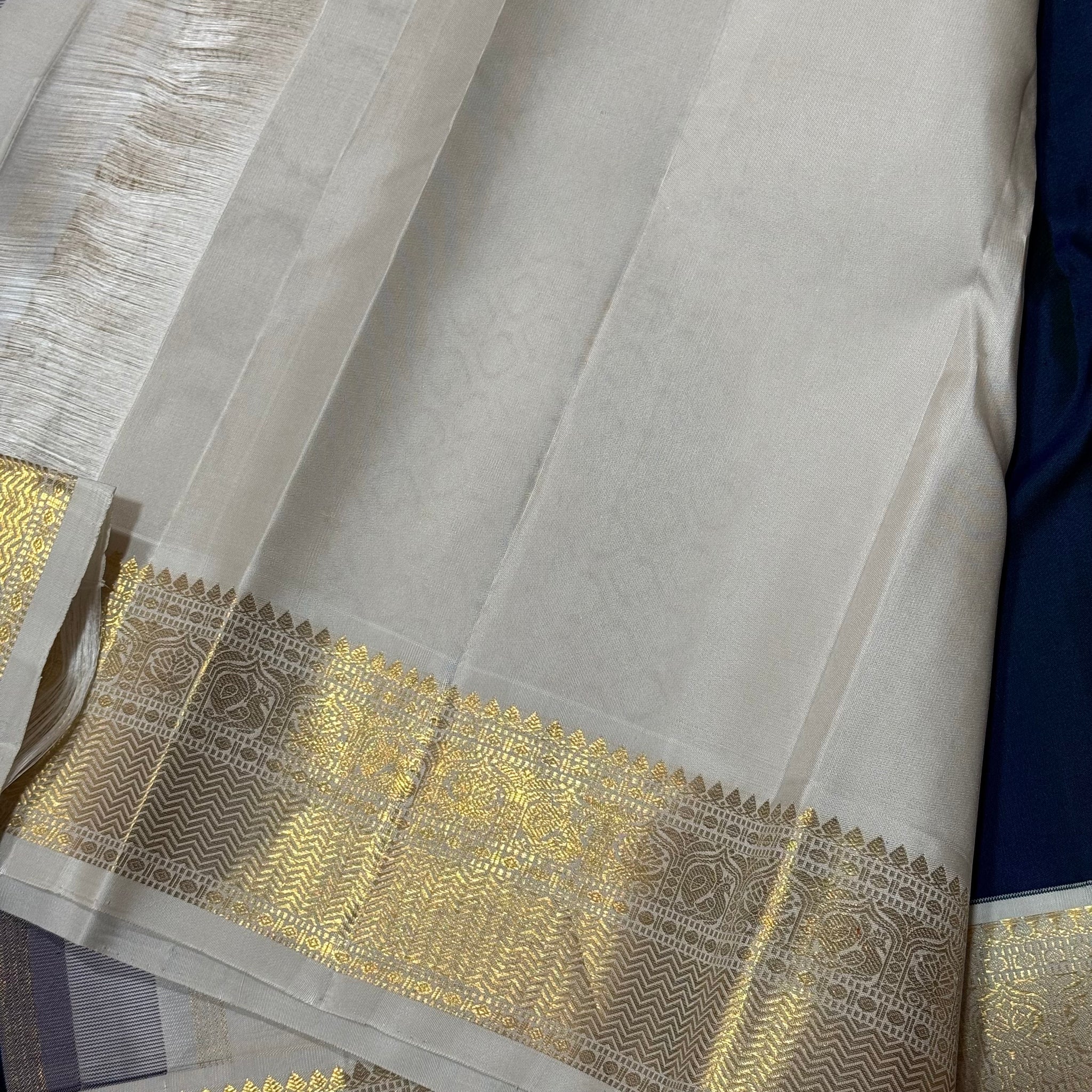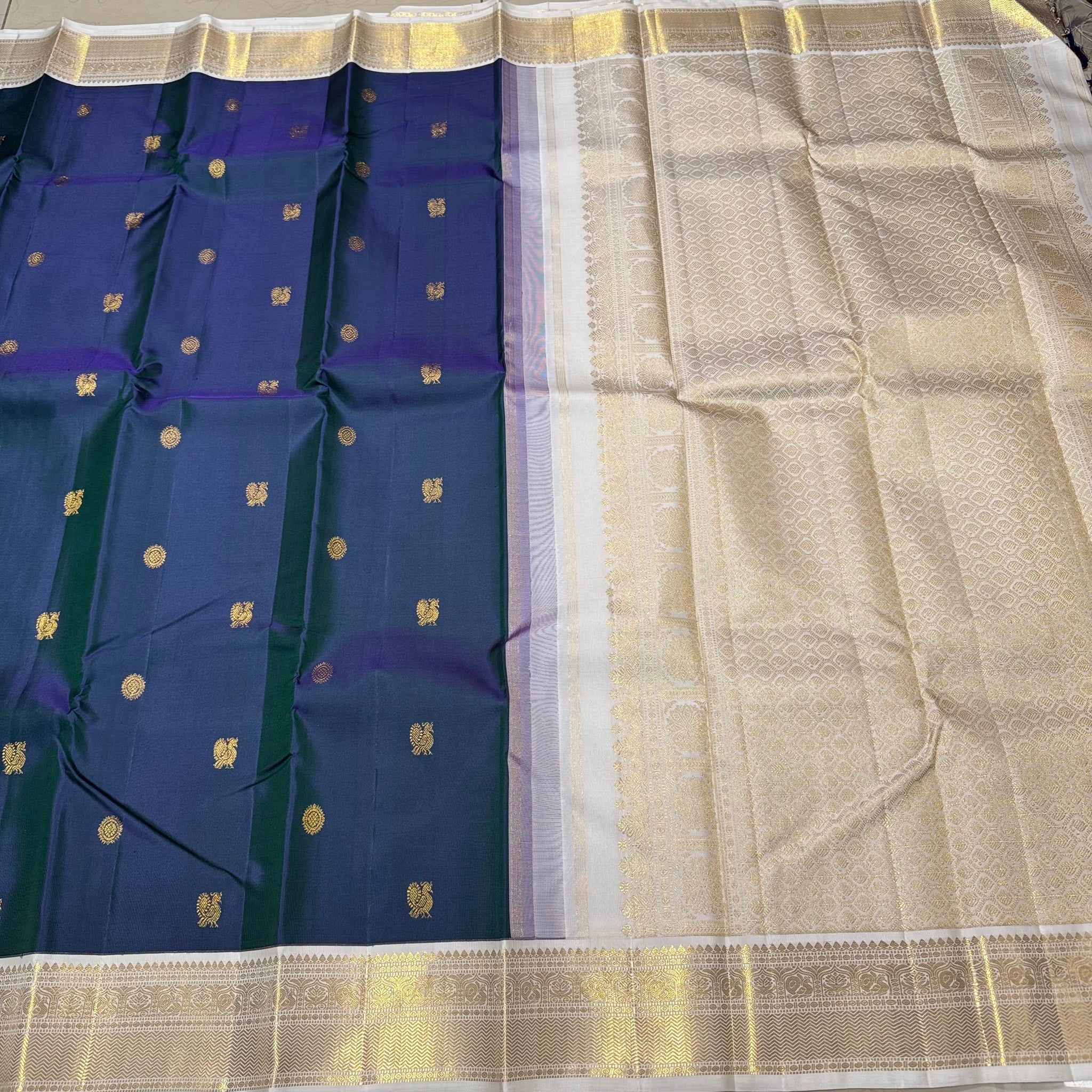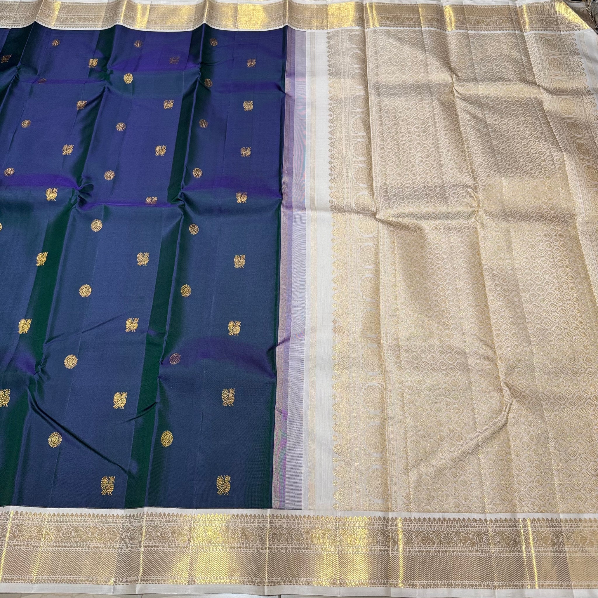 Stunning Deep Sapphire Blue (dual tone deep blue short with green) with Offwhite Handowen Pure Jari Korvai Kanjivaram Silk Saree with Mayil Chakram Buttas woven body with rich and very beautifully woven borders gorgeous pallu and contrast woven blouse