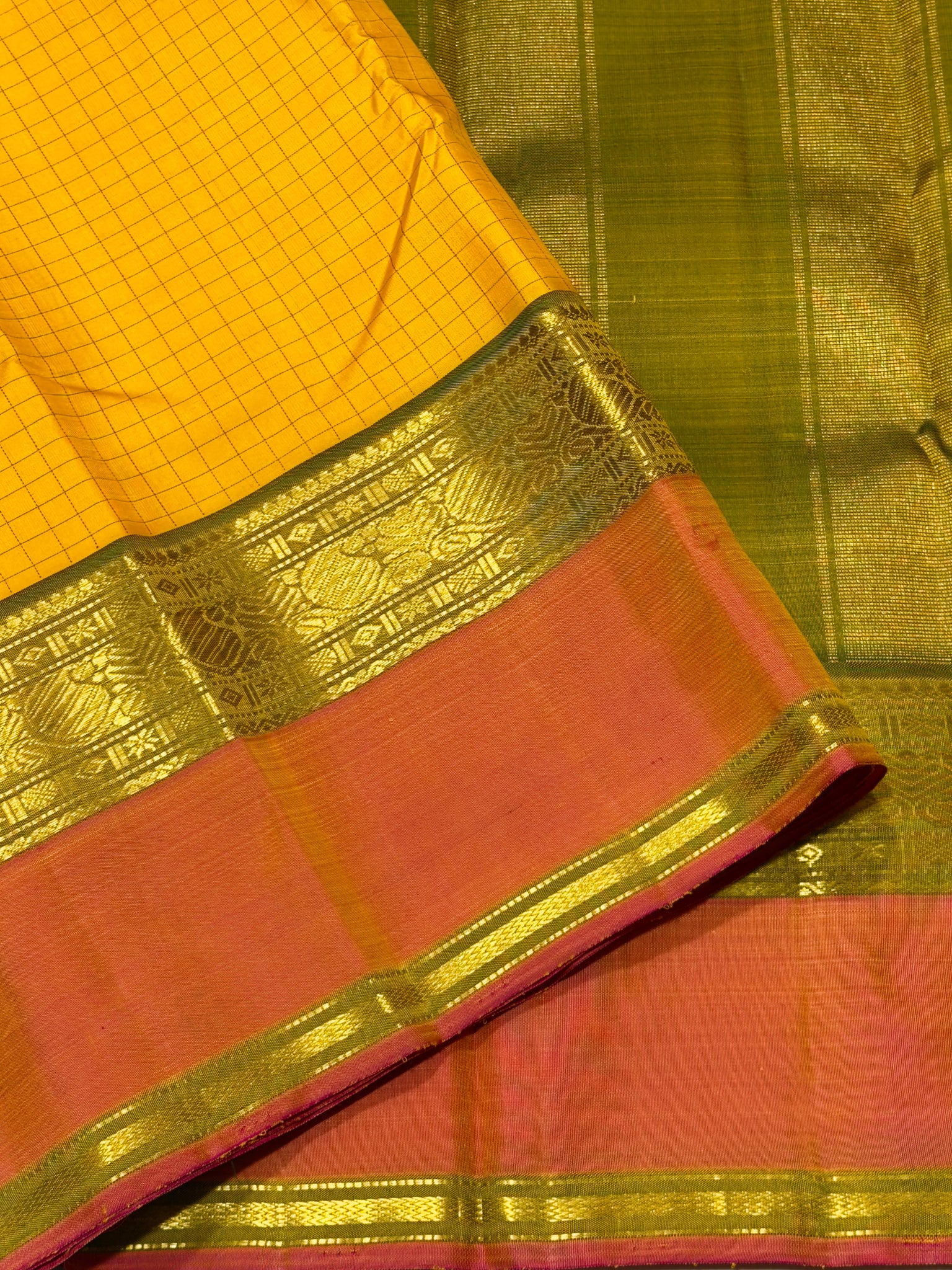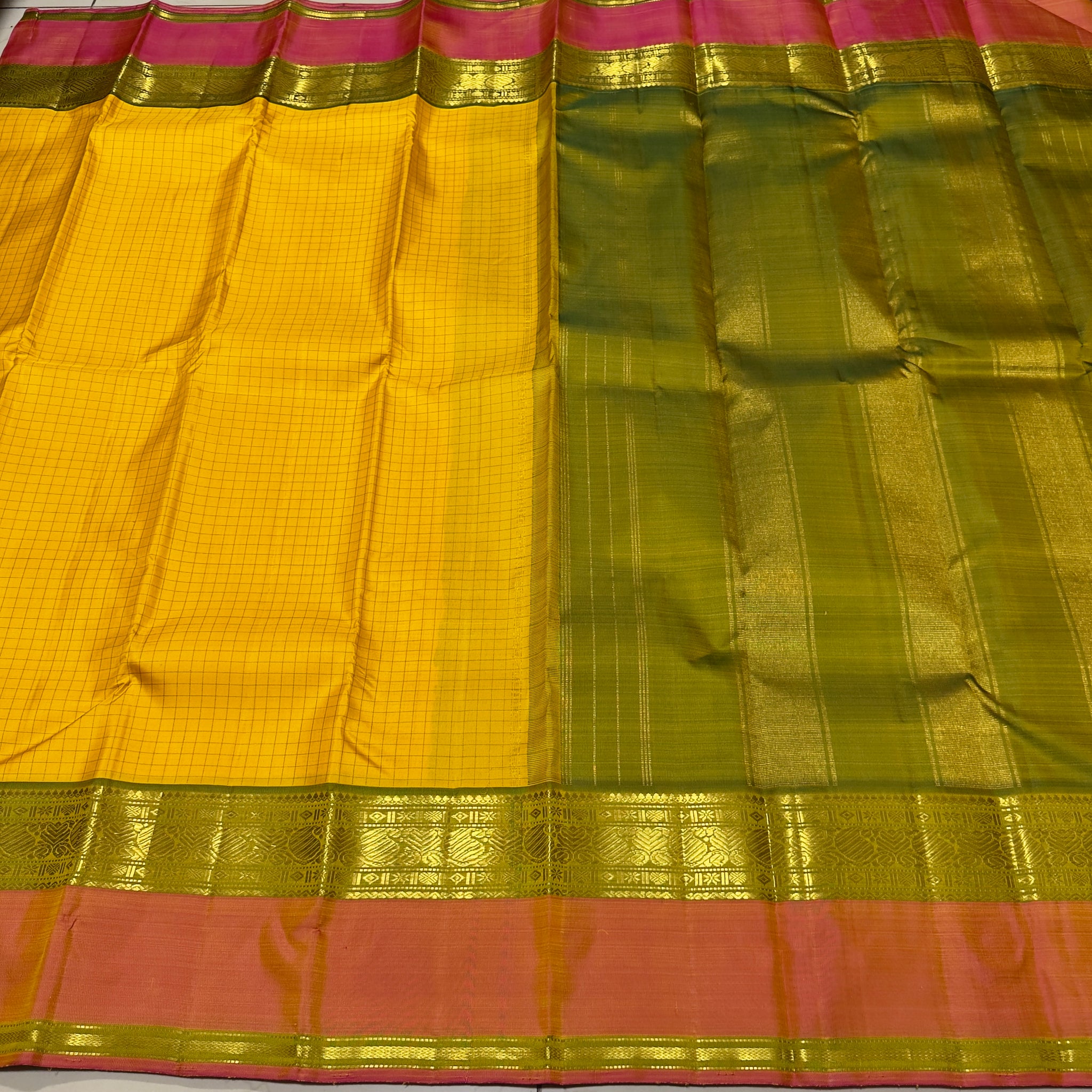Sahana- Gorgeous Sunshine Yellow with Muthukattam Handwoven Beautiful Pure Jari Kanjivaram Silk with beautiful peachish pink with Olive Green spaced borders rich olive green pallu and contrast woven blouse