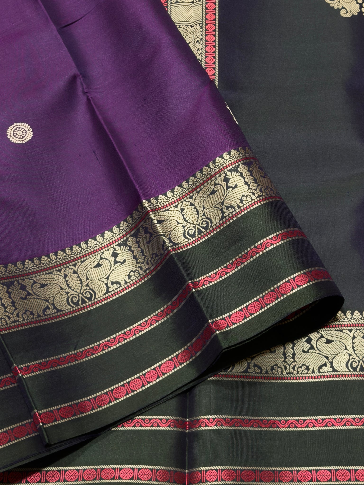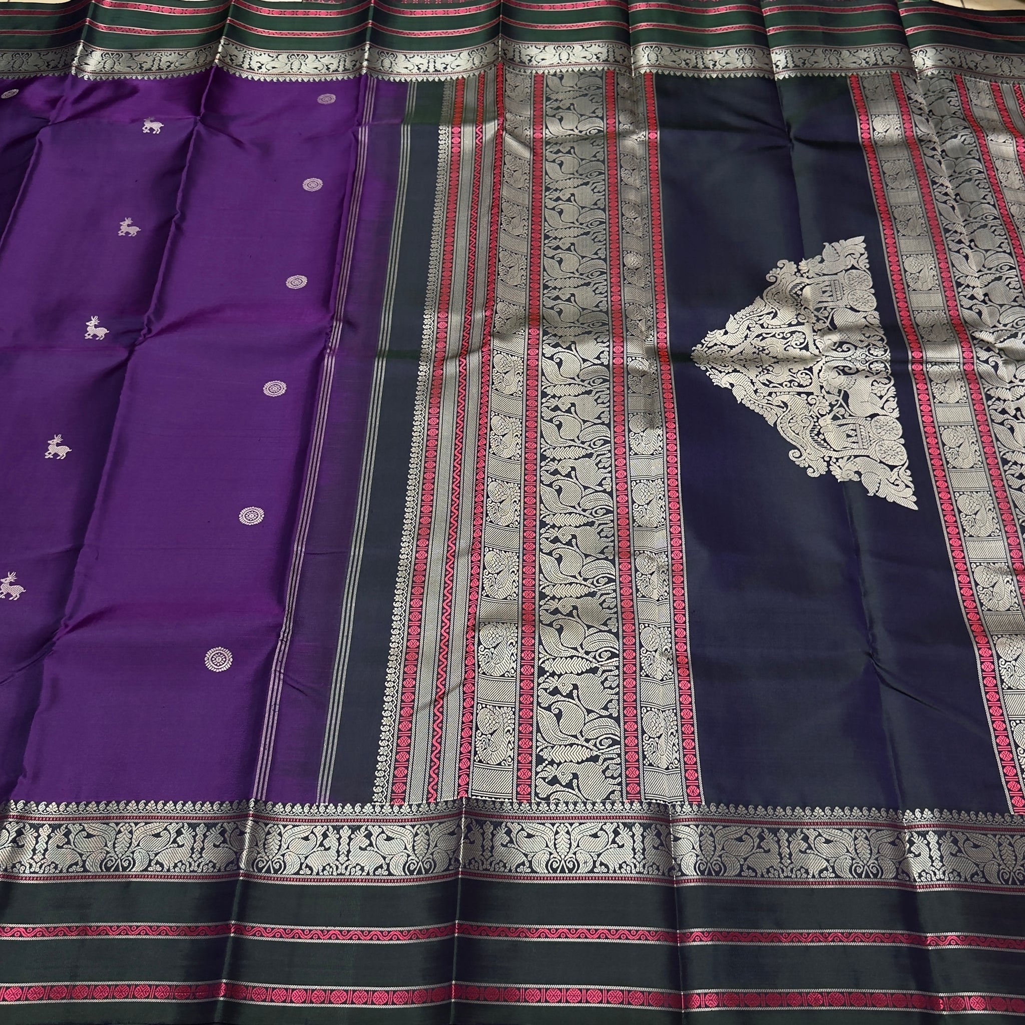 Saraswati- Gorgeous Purple with Dark Blackish Green Handwoven Pure Zariless Kanjivaram Silk with beautiful chakram and deer motifs woven all over the body with beautiful butterflies and deers woven borders l sorgavaasal pallu and contrast woven blouse