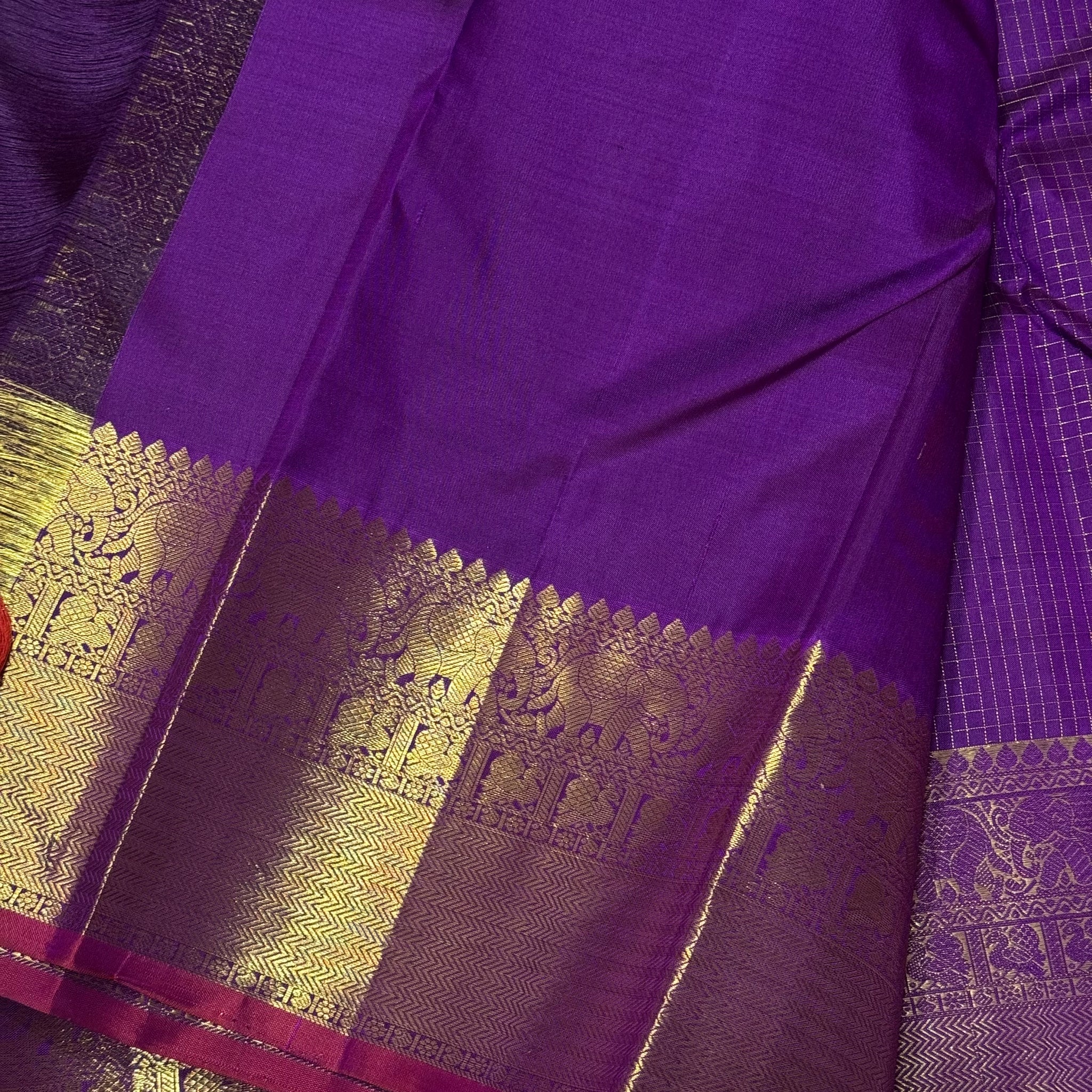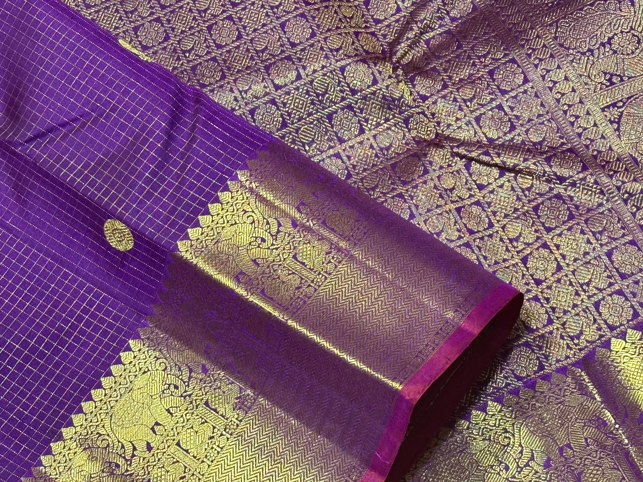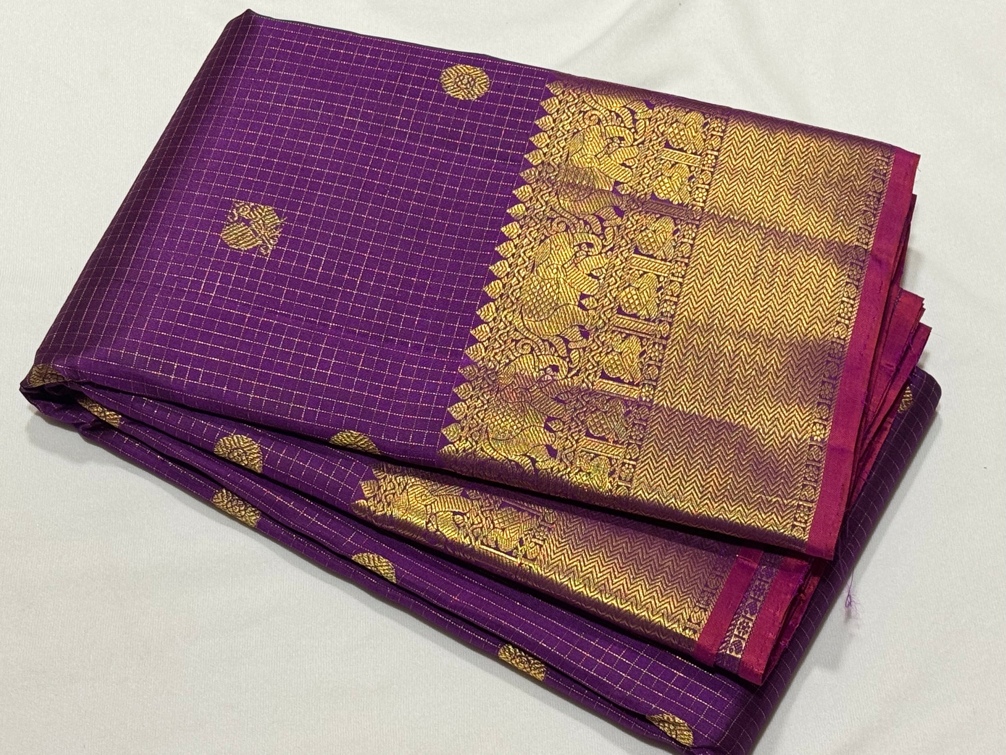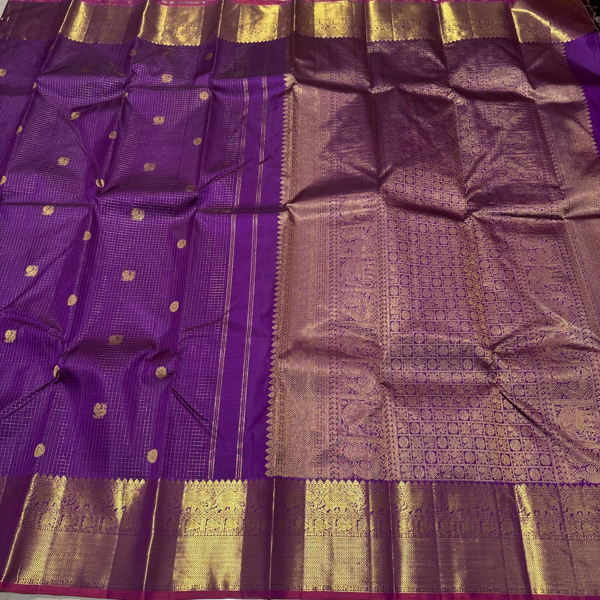 Vintage Recreation- Deep Magenta with Gold Handwoven Pure Jari Oosi Checks with mayil chakram buttas woven body with rich borders gorgeous pallu and self colored blouse