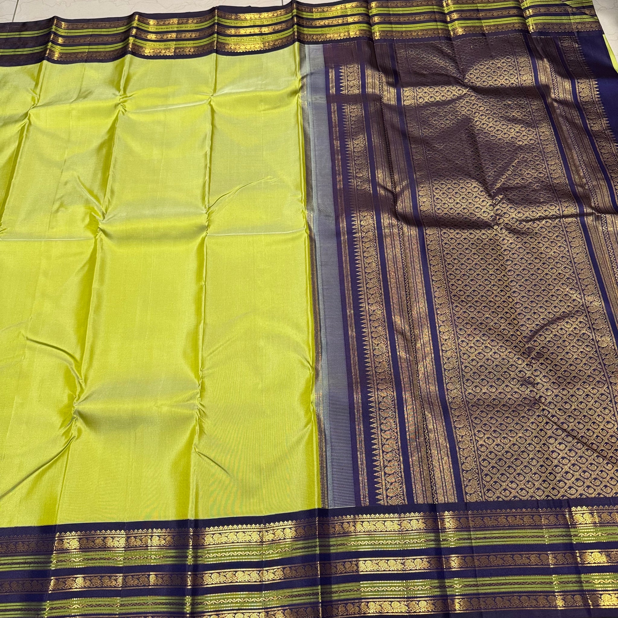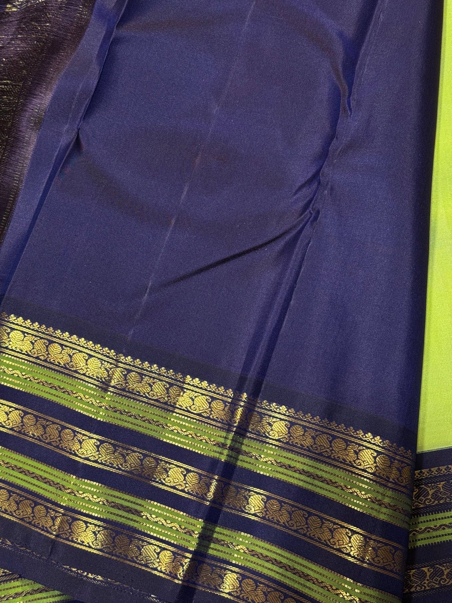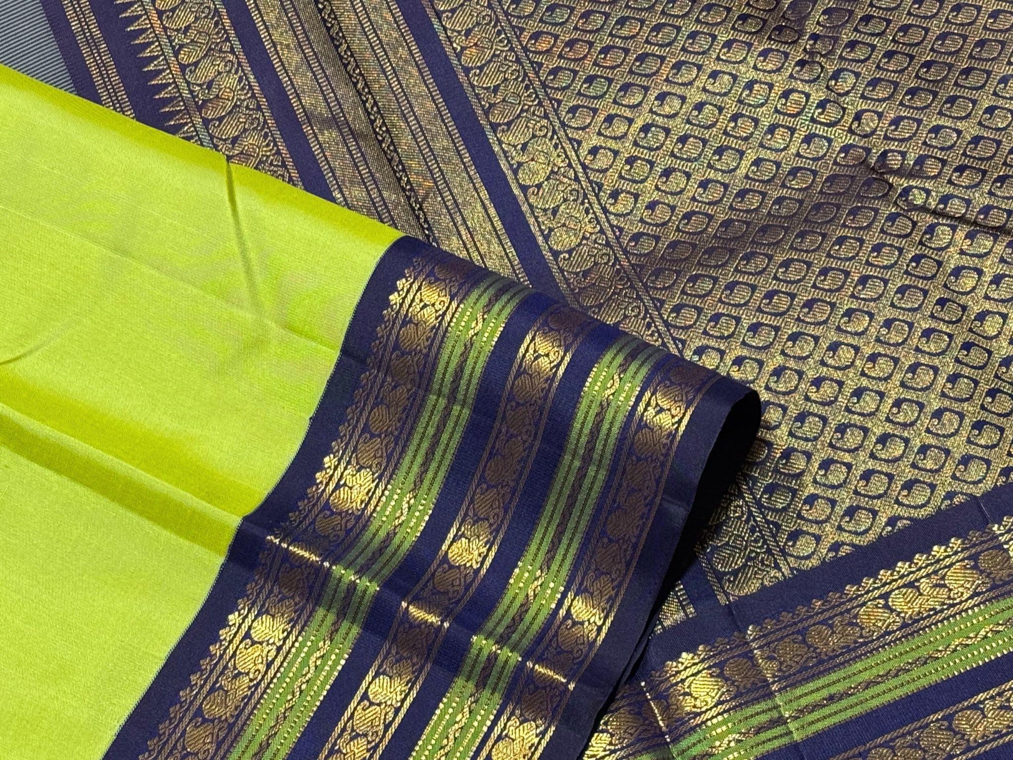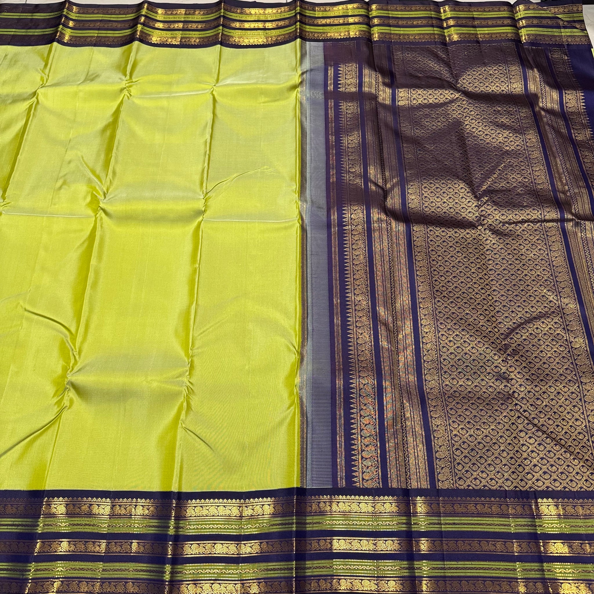 Gorgeous Pastel Green with Navy Blue Handwoven Pure Jari Korvai Plain Body Kanjivaram Silk Saree with rich Varisaipet Meenakari Borders Rich Pallu and Contrast Woven Blouse