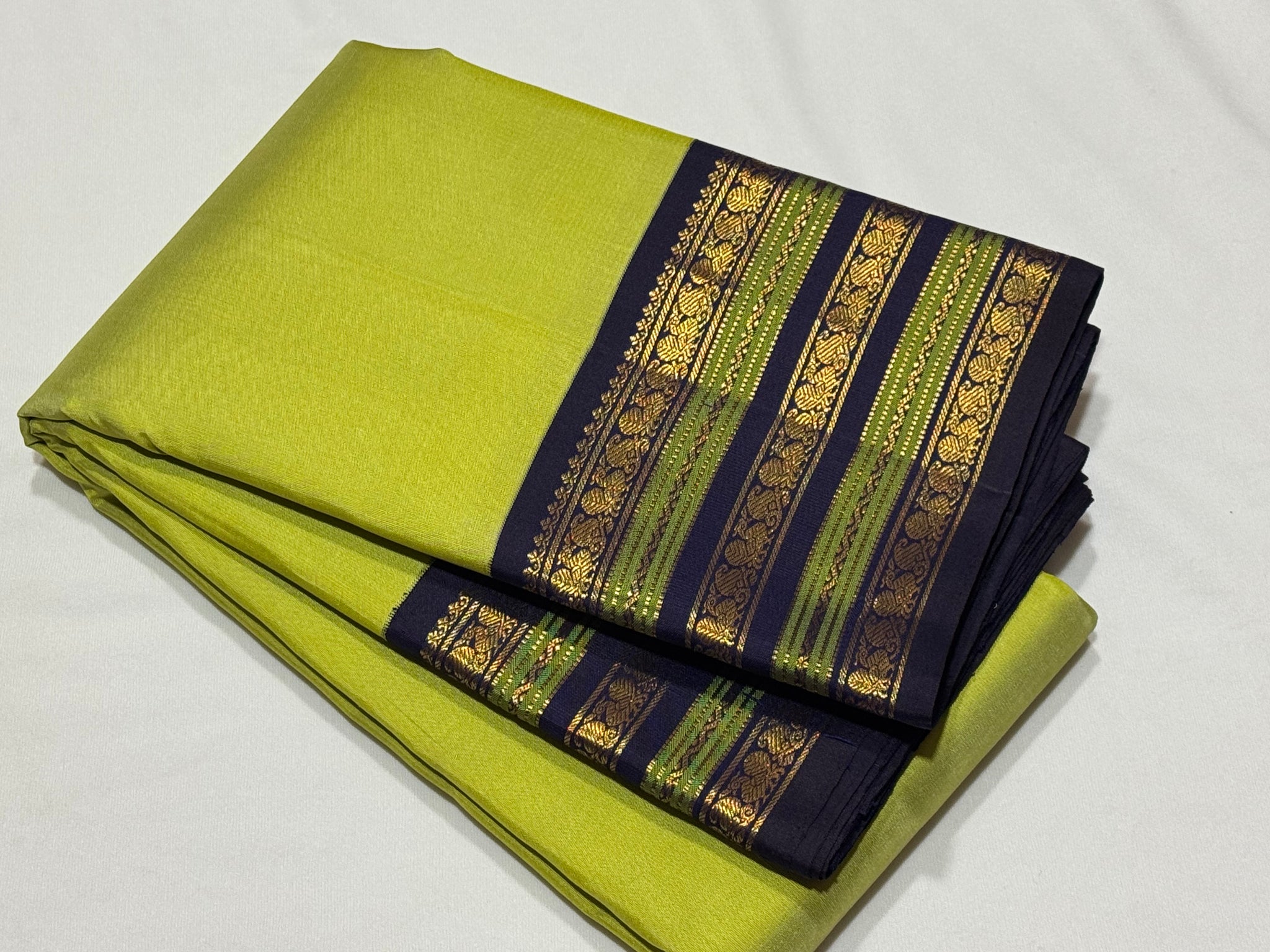 Gorgeous Pastel Green with Navy Blue Handwoven Pure Jari Korvai Plain Body Kanjivaram Silk Saree with Beautifully woven Meenakari Varisaipet Borders Rich Pallu and Contrast Woven Blouse. The borders have mangoes, annapakshis, nelis and beautiful floral motifs woven in rows.