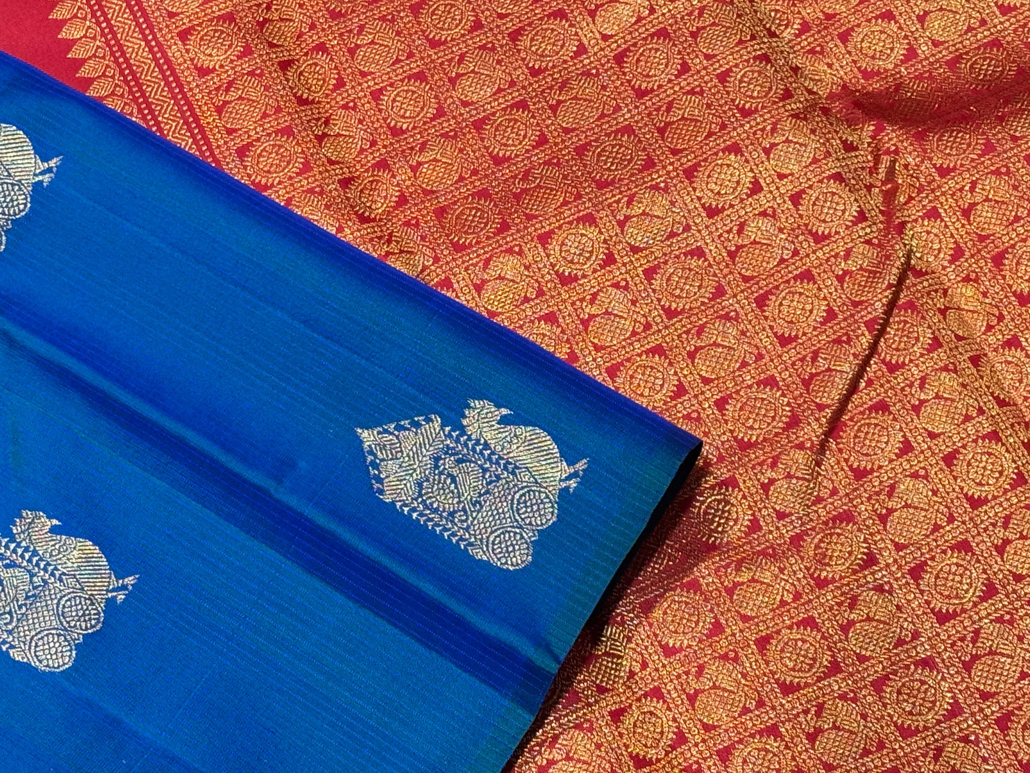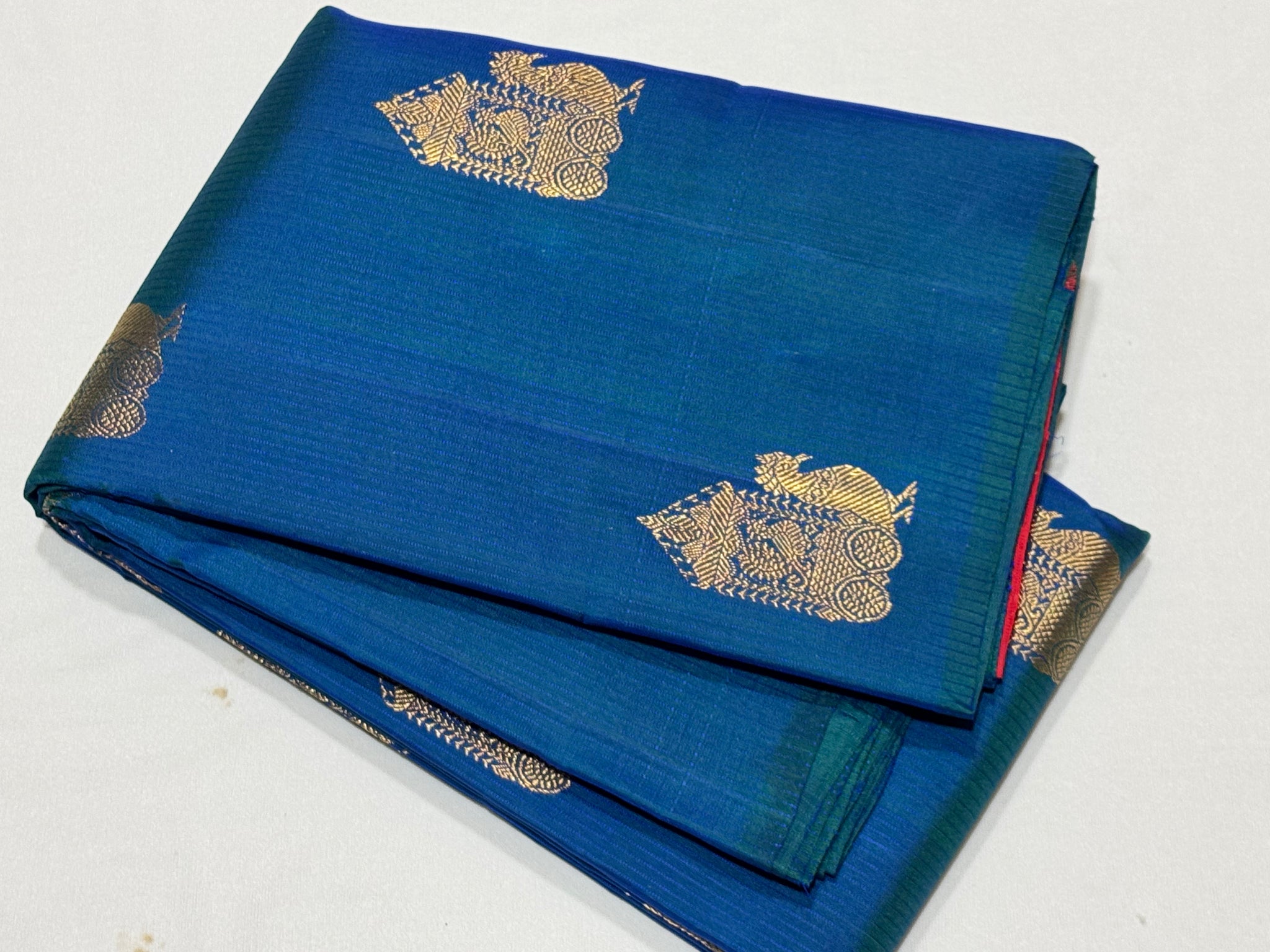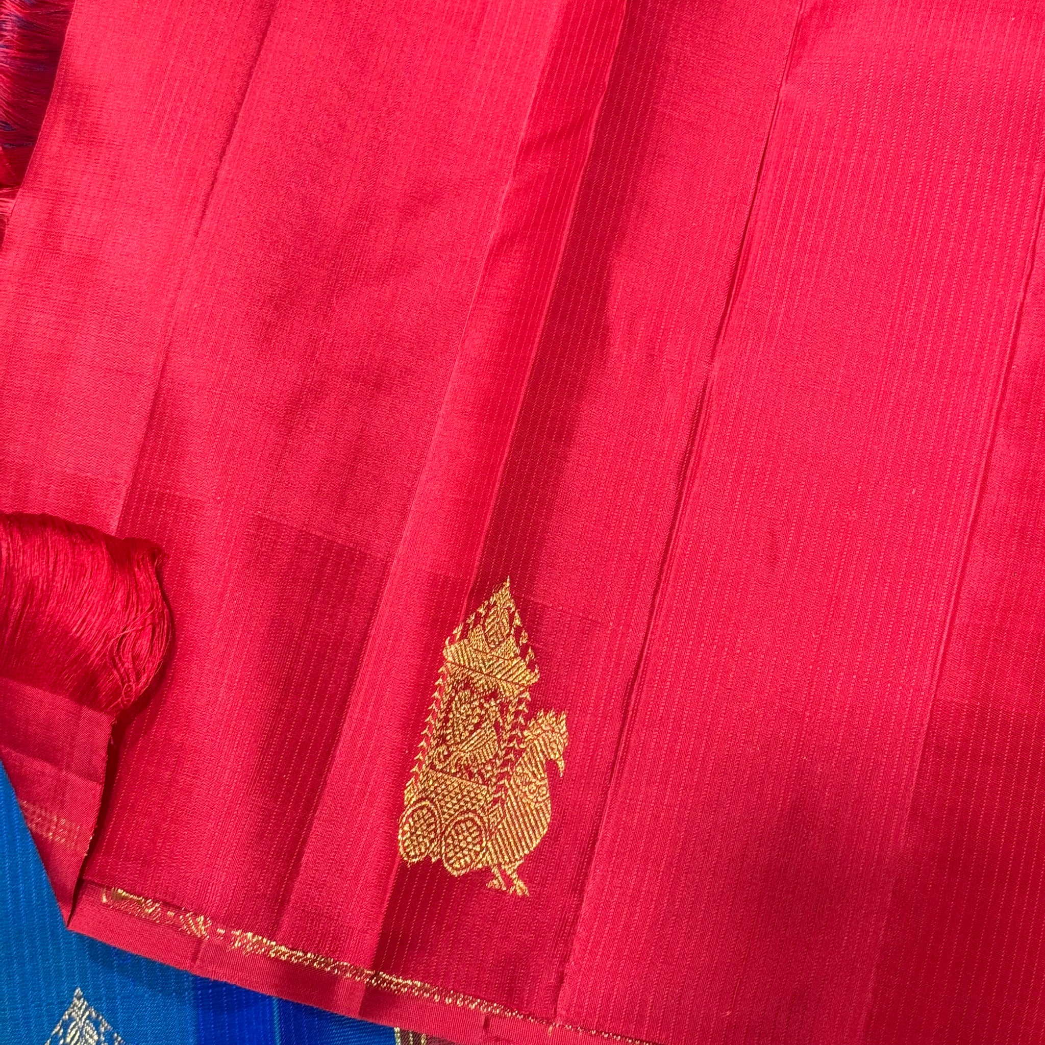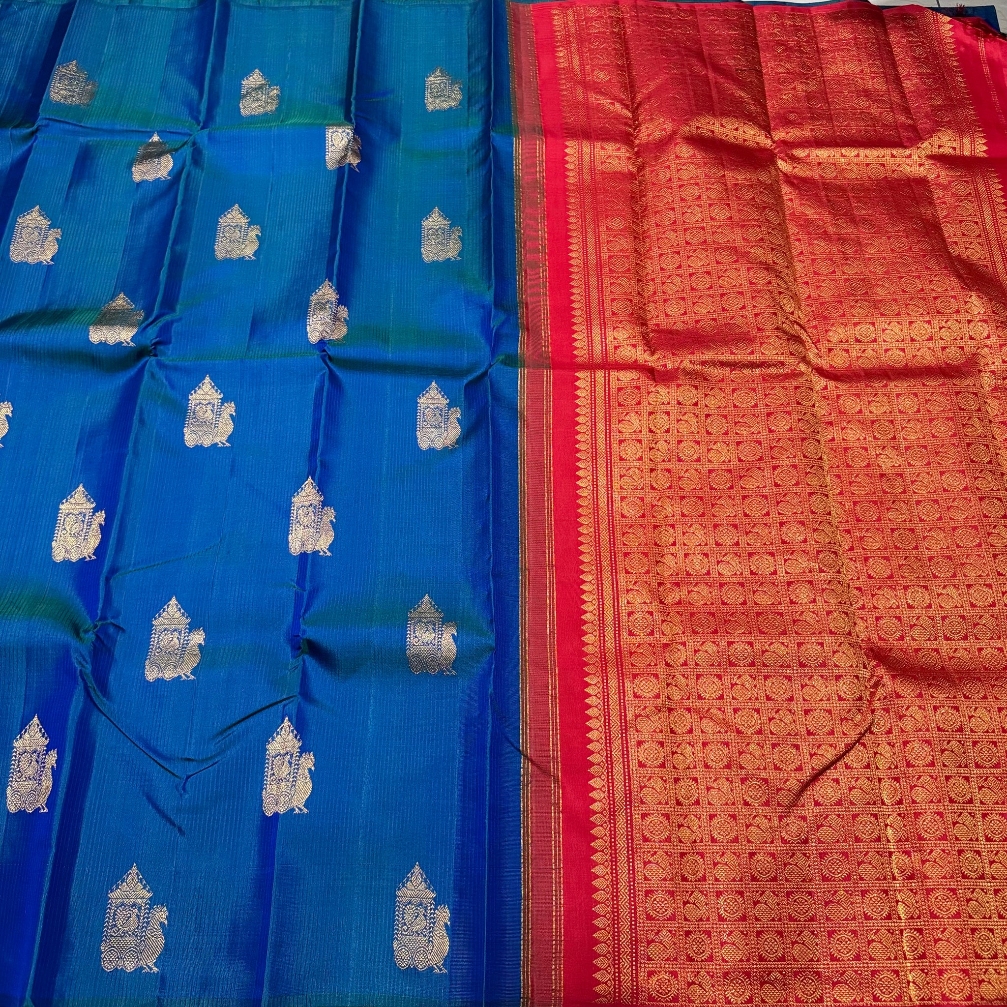 Peacock Blue with Red Borderless Muthukattam with Buttas woven body in a gorgeous Handwoven Pure Jari Kanjivaram Silk Saree with rich pallu and contrast woven blouse beauty