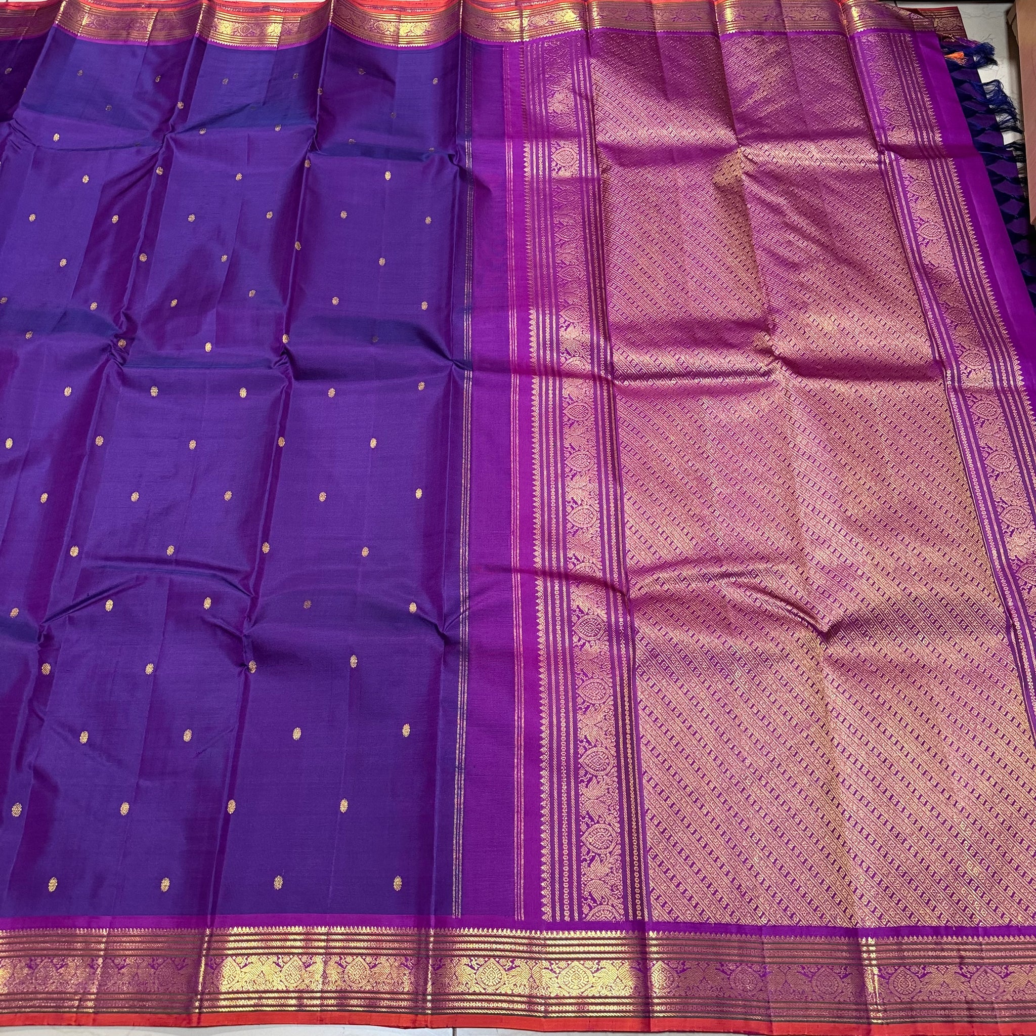 Sahana- Gorgeous Deep Purplish Blue with Magenta Purple Buttas Handwoven Pure Jari Kanjivaram Silk with rich small borders beautiful pallu and contrast woven blouse