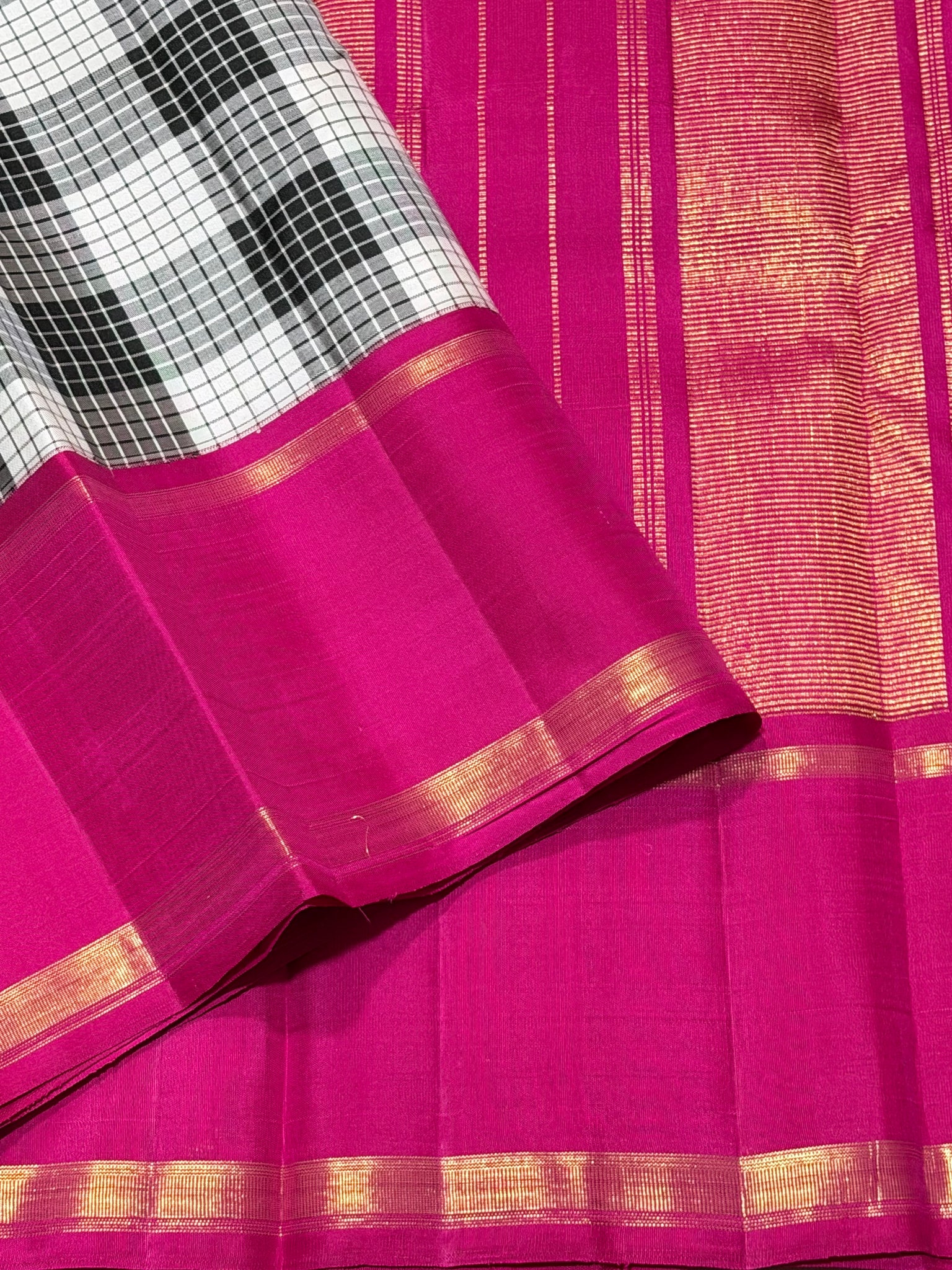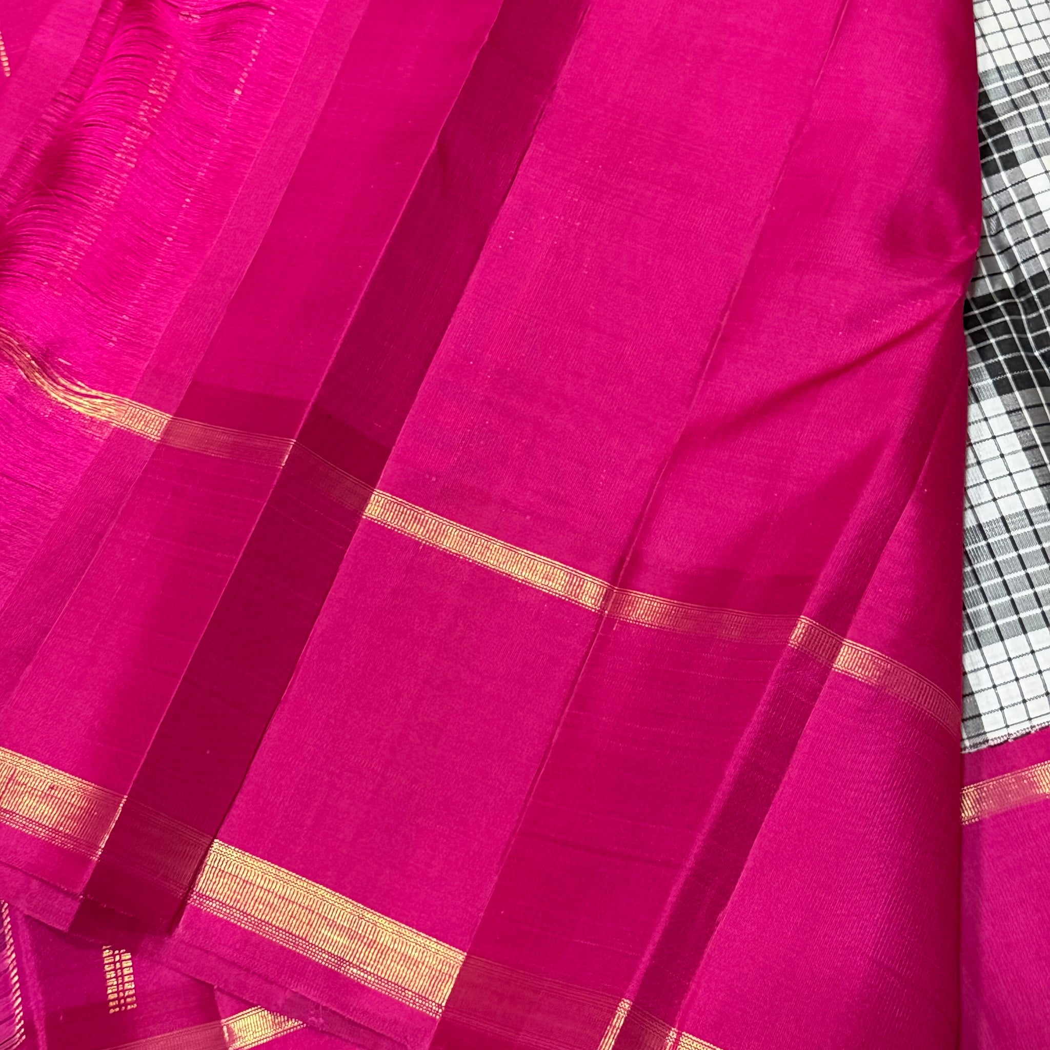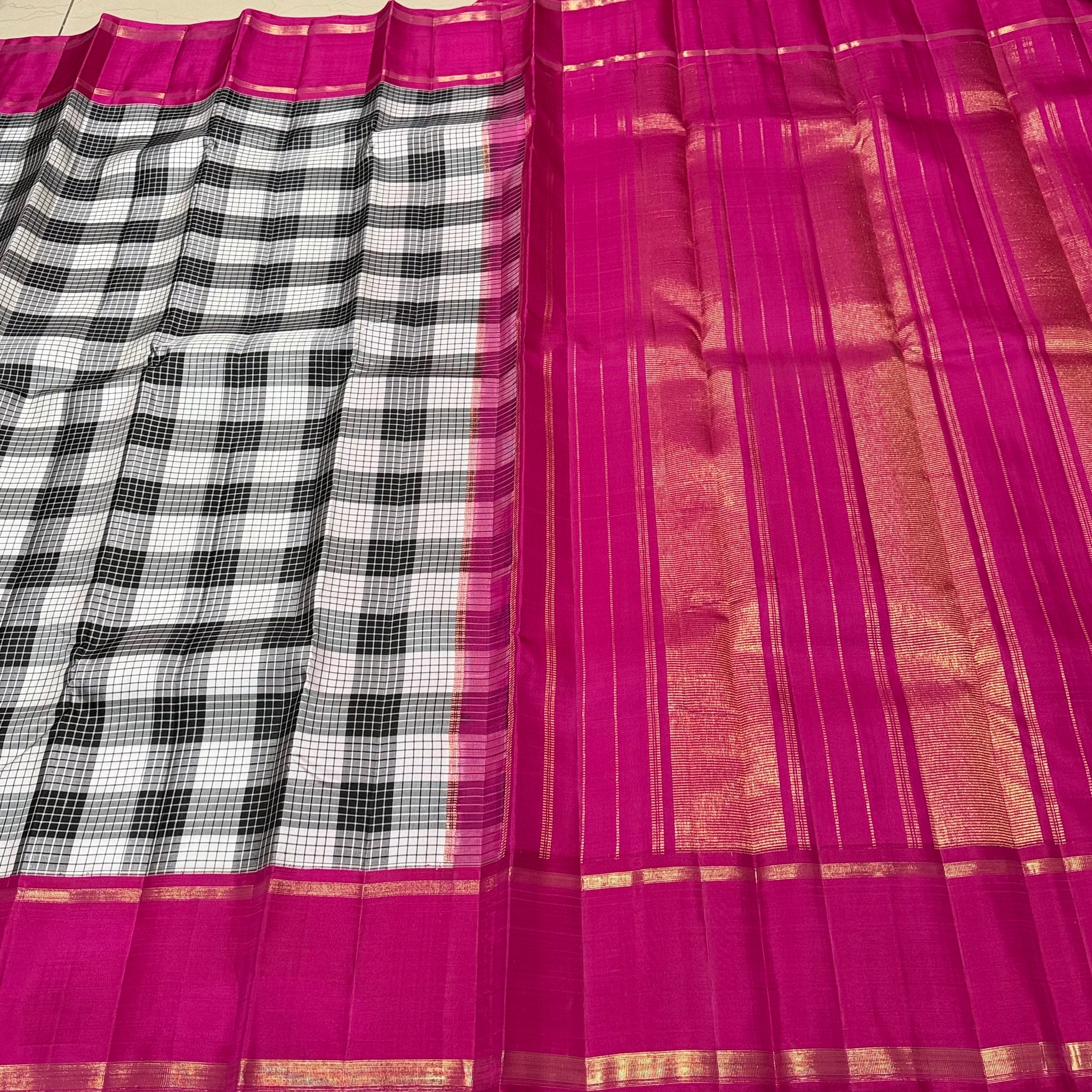 Sarasangi- Gorgeous Handwoven Pure Jari Korvai Kanjivaram Silk in Black and White Checks with beautiful Pink bodi rettapet borders rich seer pallu and contrast woven beautiful blouse