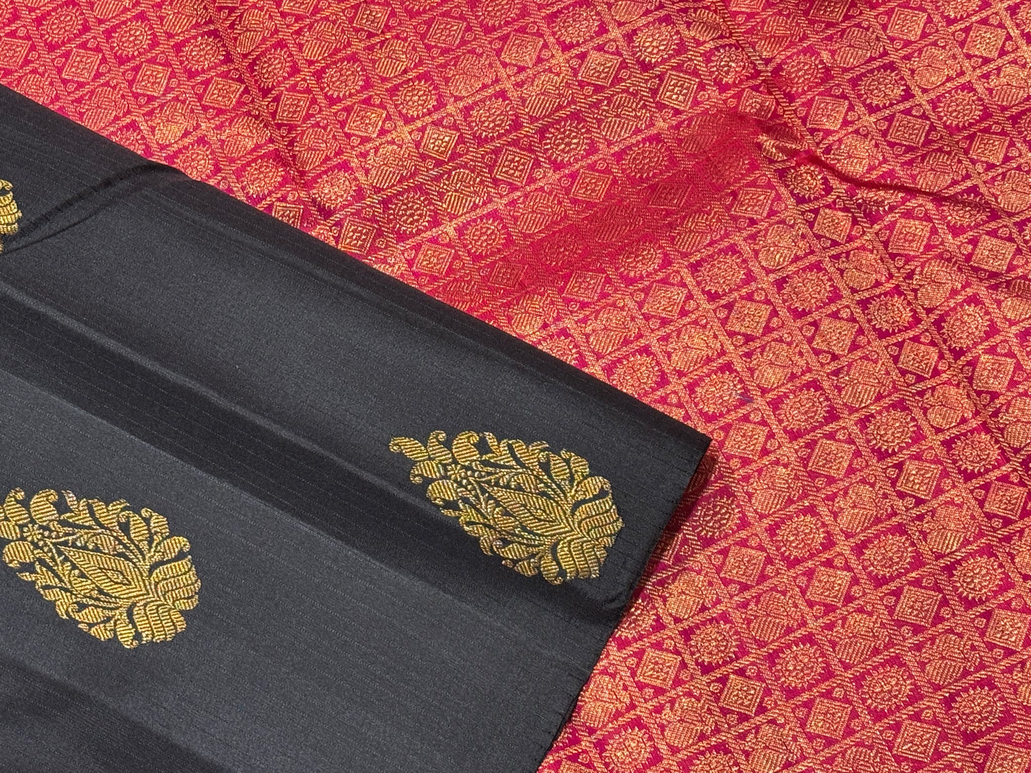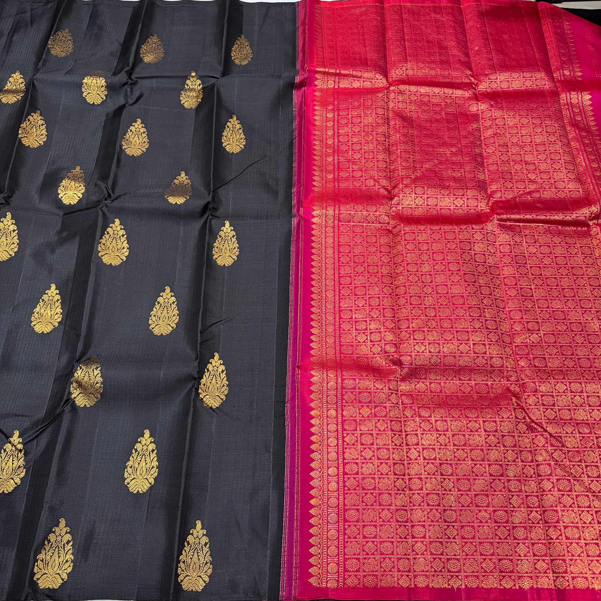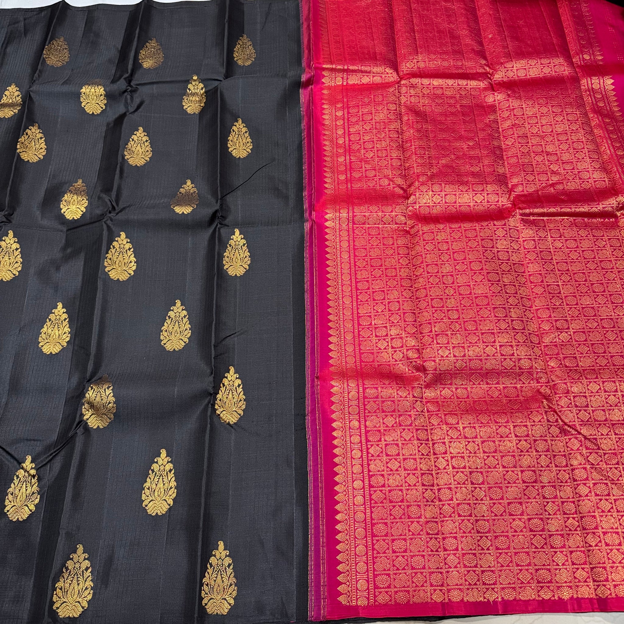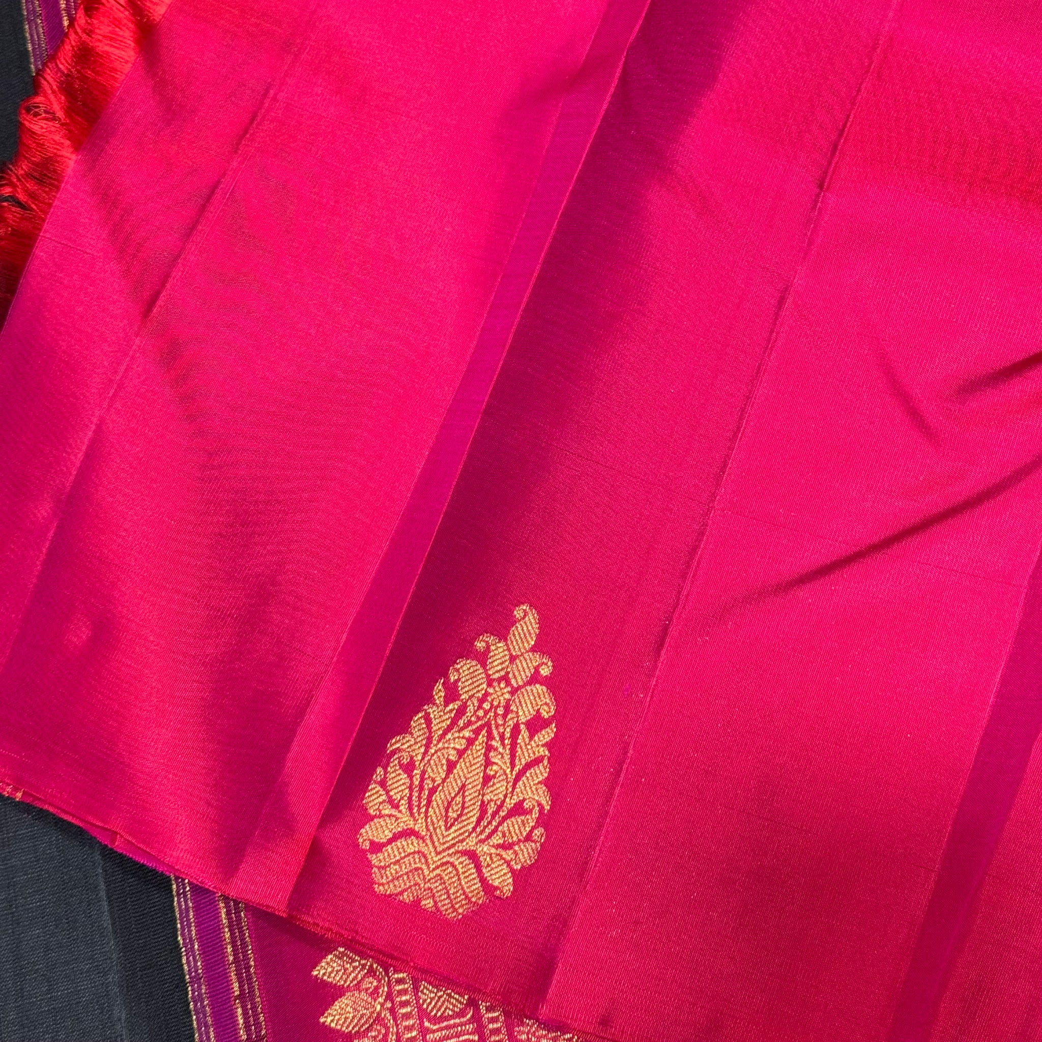 Striking Black with Shocking Pink Borderless Handwoven Pure Jari Muthukattam with Buttas Rich Pallu and Contrast woven blouse