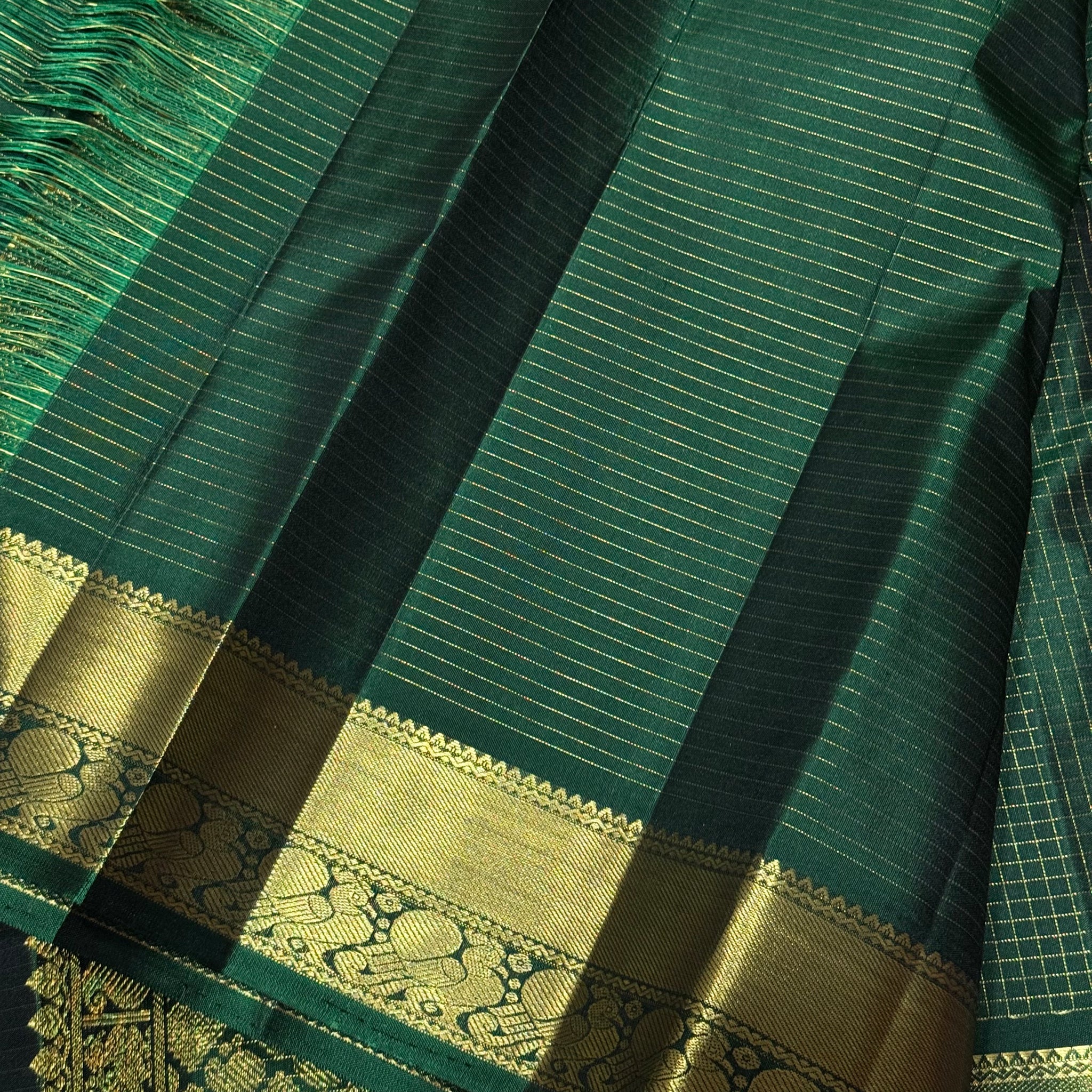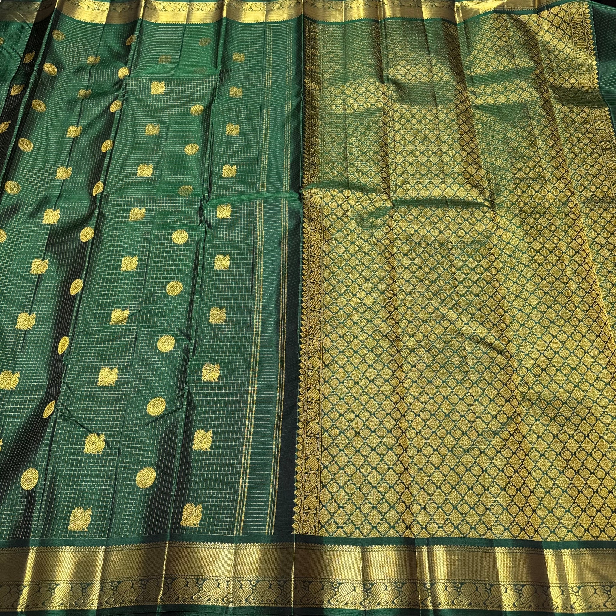 A Deep Emerald Green with Gold Vairaoosi with Buttas Handwoven Pure Jari Kanjivaram Silk Saree with rich borders pallu and self colored blouse beauty