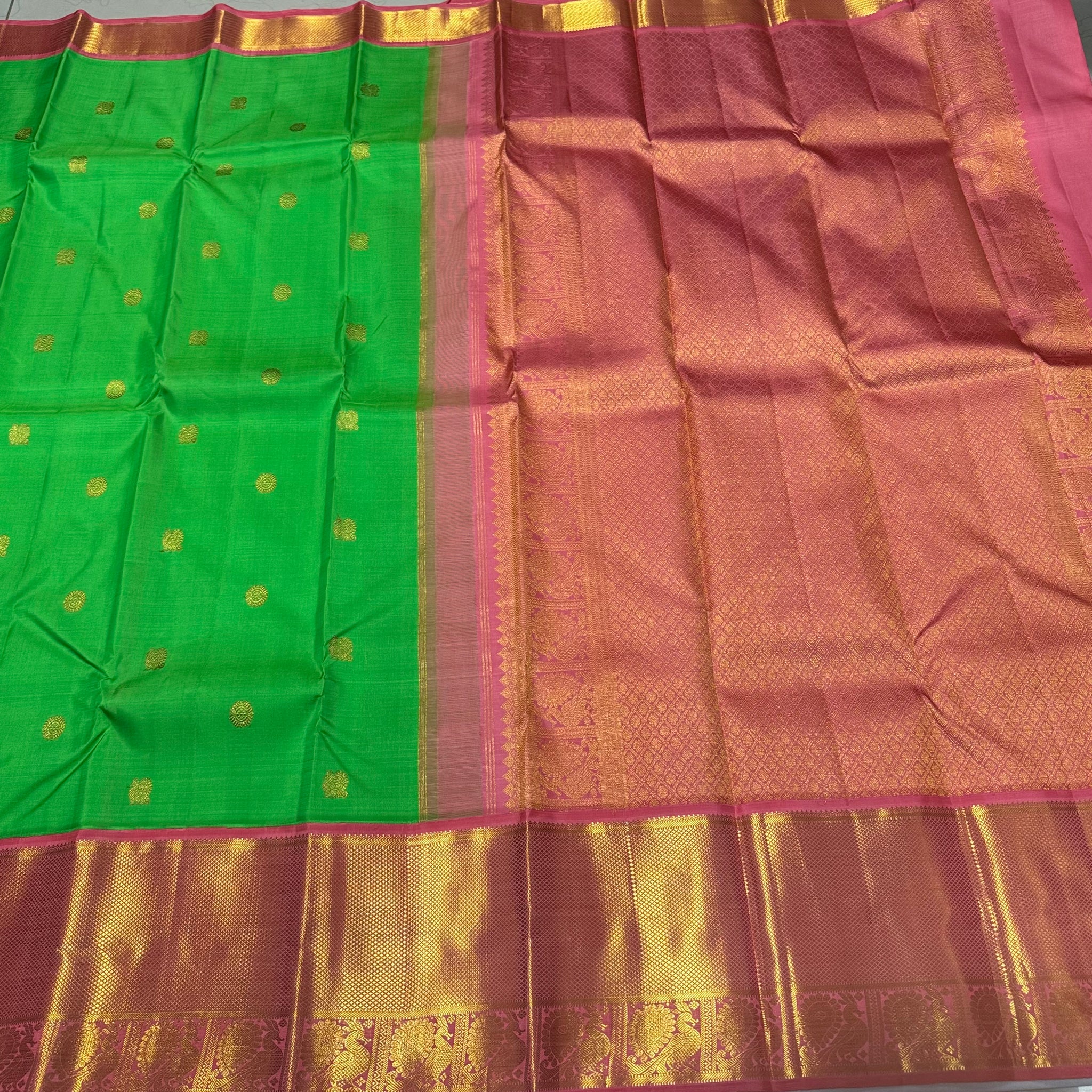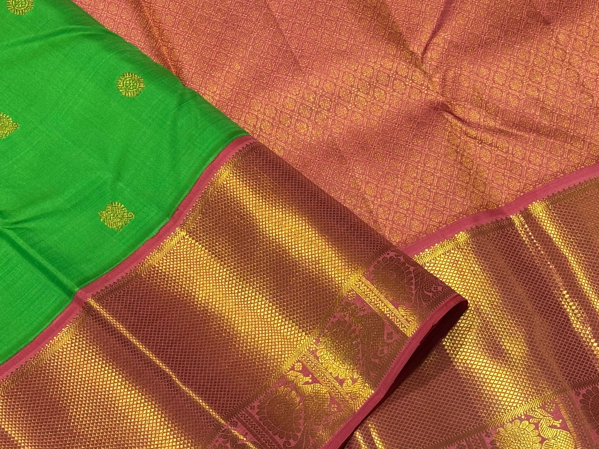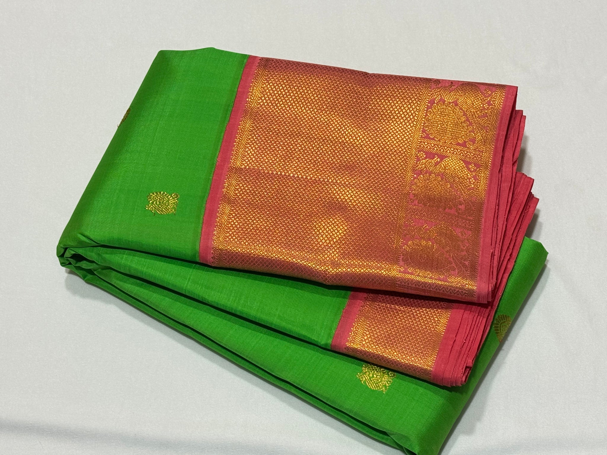 Bright Parrot Green with Coral Pink Handwoven Pure Jari Korvai Kanjivaram Silk Saree with Buttas woven body rich borders pallu and contrast woven blouse beauty