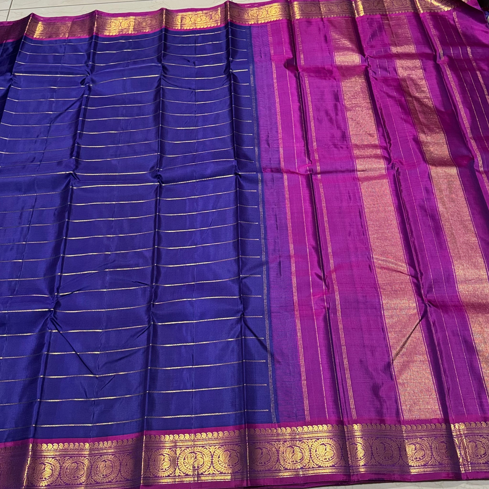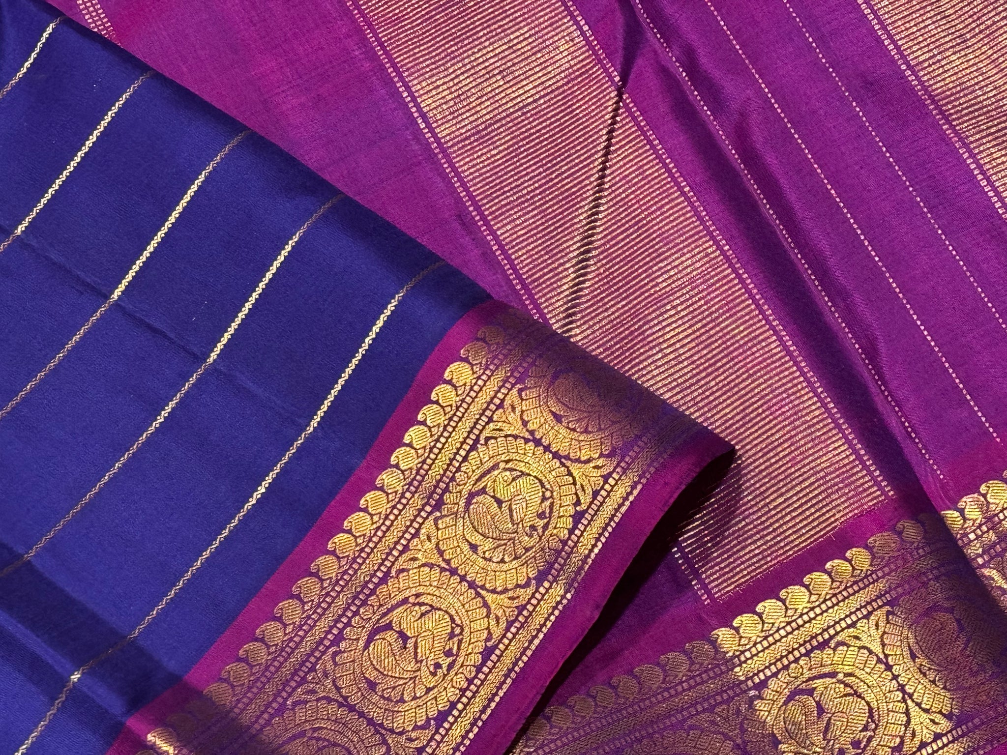 Deep Blue with Dark Magenta Jari Veldhari Handwoven Pure Kanjivaram Silk Saree with beautiful borders rich pallu and contrast woven blouse