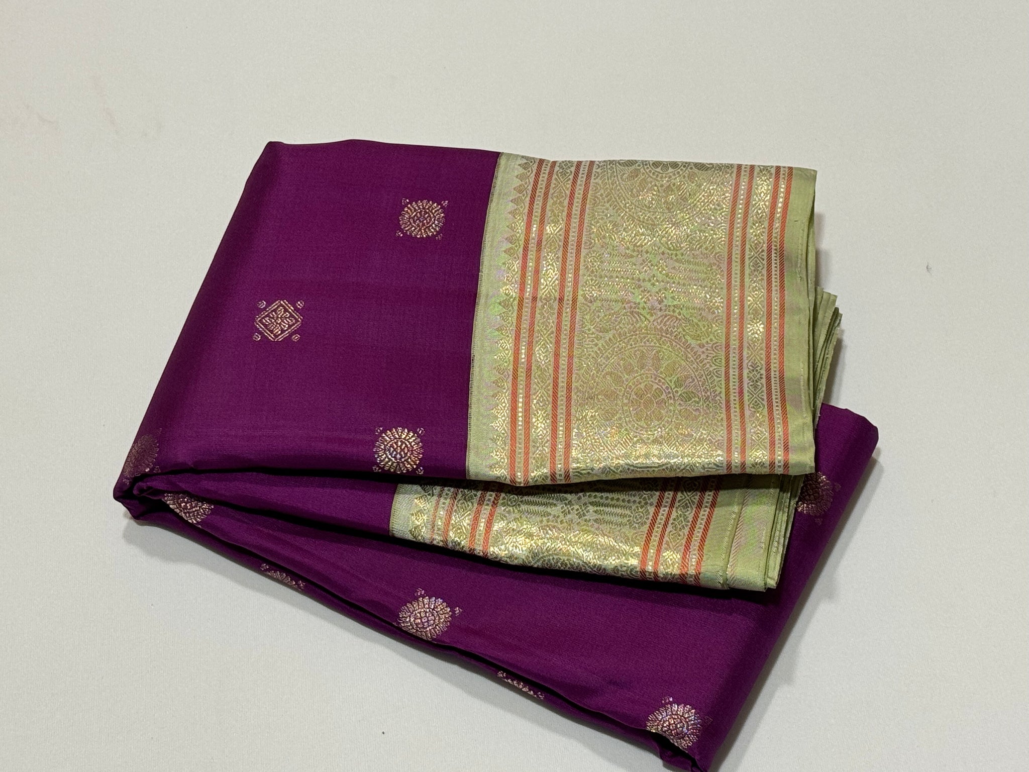 Deep Purple with Elakka Green in Kai Korvai Buttas Kanjivaram Silk Saree with beautiful diamonds and rudrakshas woven body intricate thambalam motifs woven borders rich pallu and contrast woven blouse
