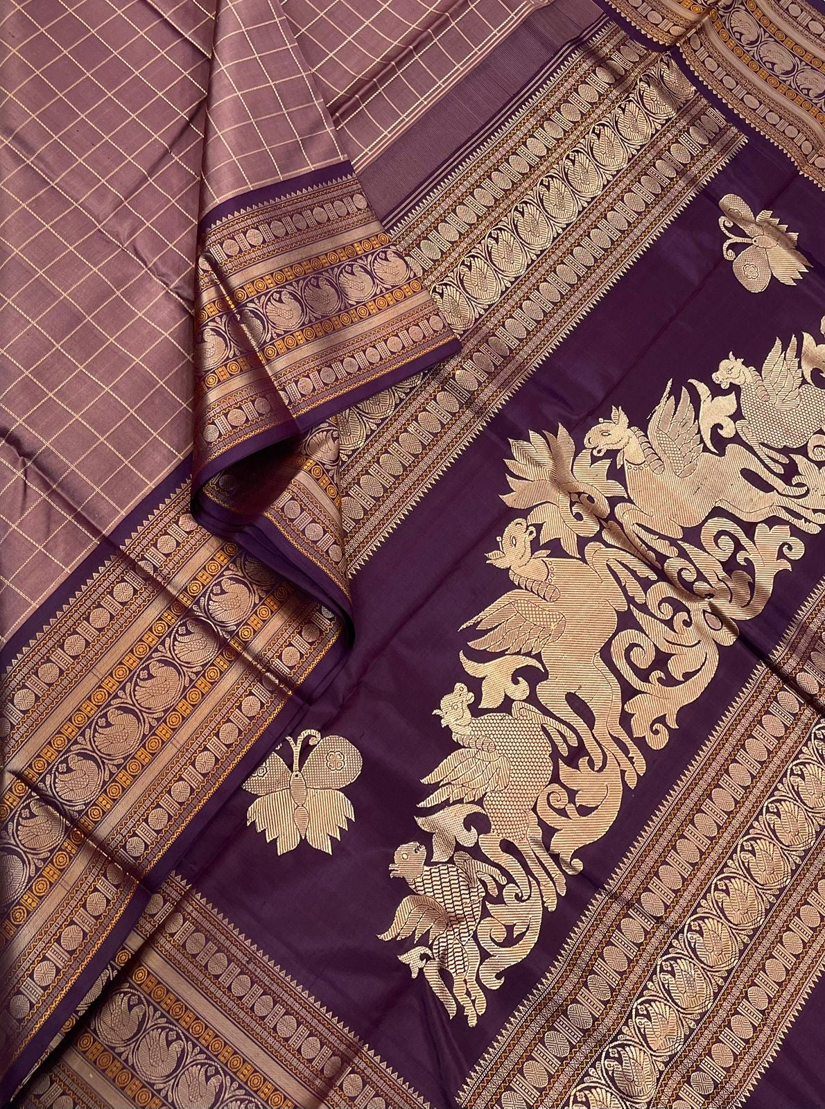 Premium Vintage Weave- Light Brown with Deep Purplish Brown Muthukattam Handwoven Pure Zero Zari Kanchipuram Silk with Rettapet rich woven borders Sorgavasal Pallu and Contrast Blouse