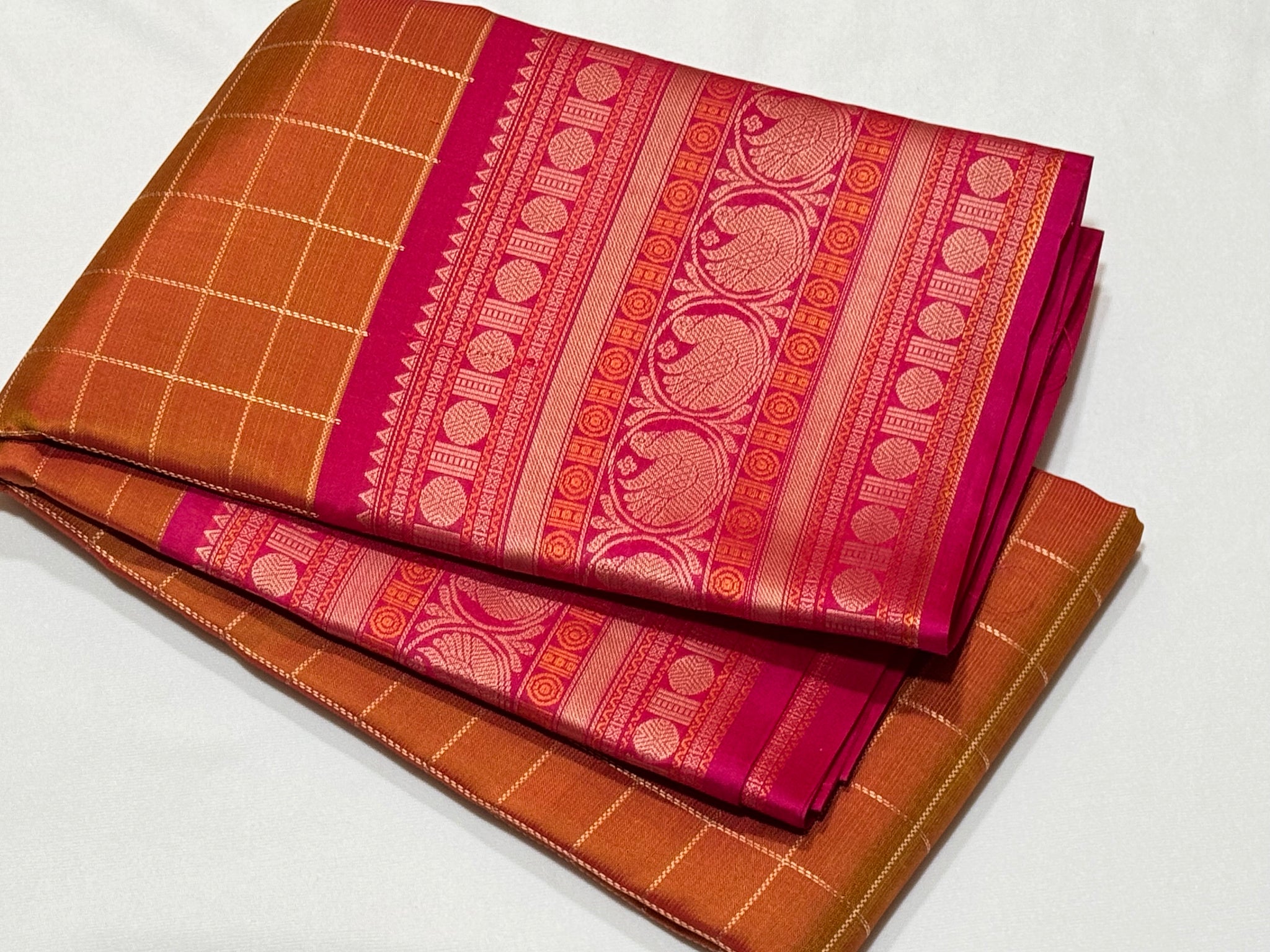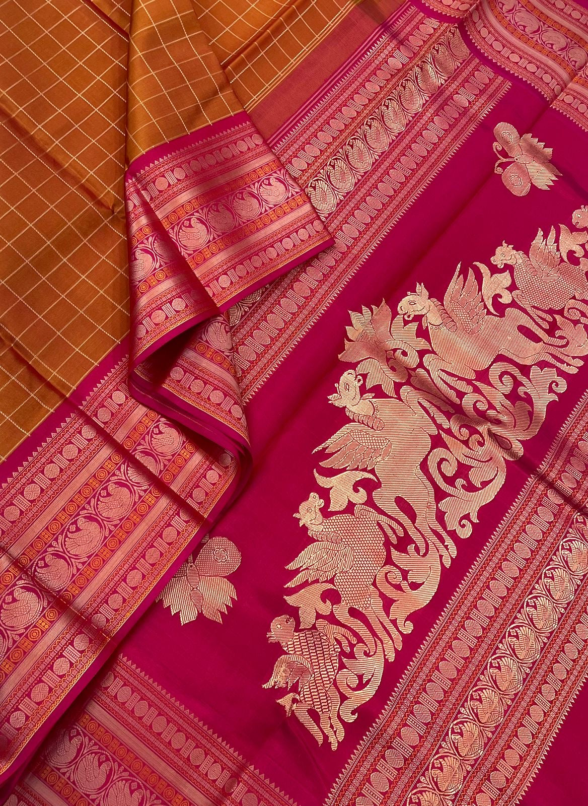 Premium Zariless Vintage Weave- Golden Mustard with Tomato Pink Muthukattam with Rich borders Sorgavaasal Inspired Pallu In a ZeroZari Handwoven Pure Kanjivaram Silk Saree Beauty