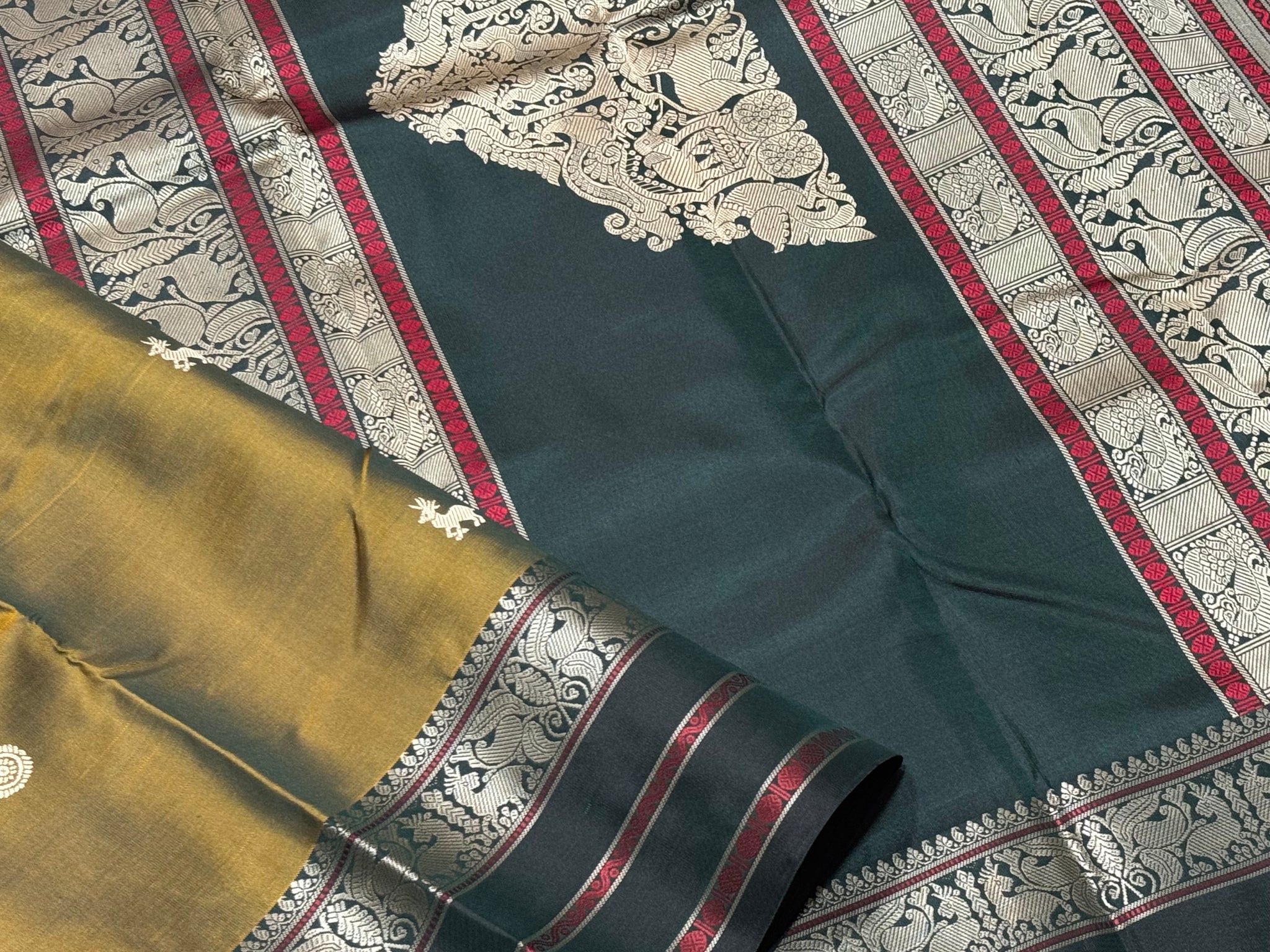 Premium Zariless Vintage Weave- Light Moss Green with Dark Bottle Green with 5 different buttis Sorgavasal Inspired Pallu in a rich Handwoven Zariless Pure Kanjivaram Silk Saree Beauty