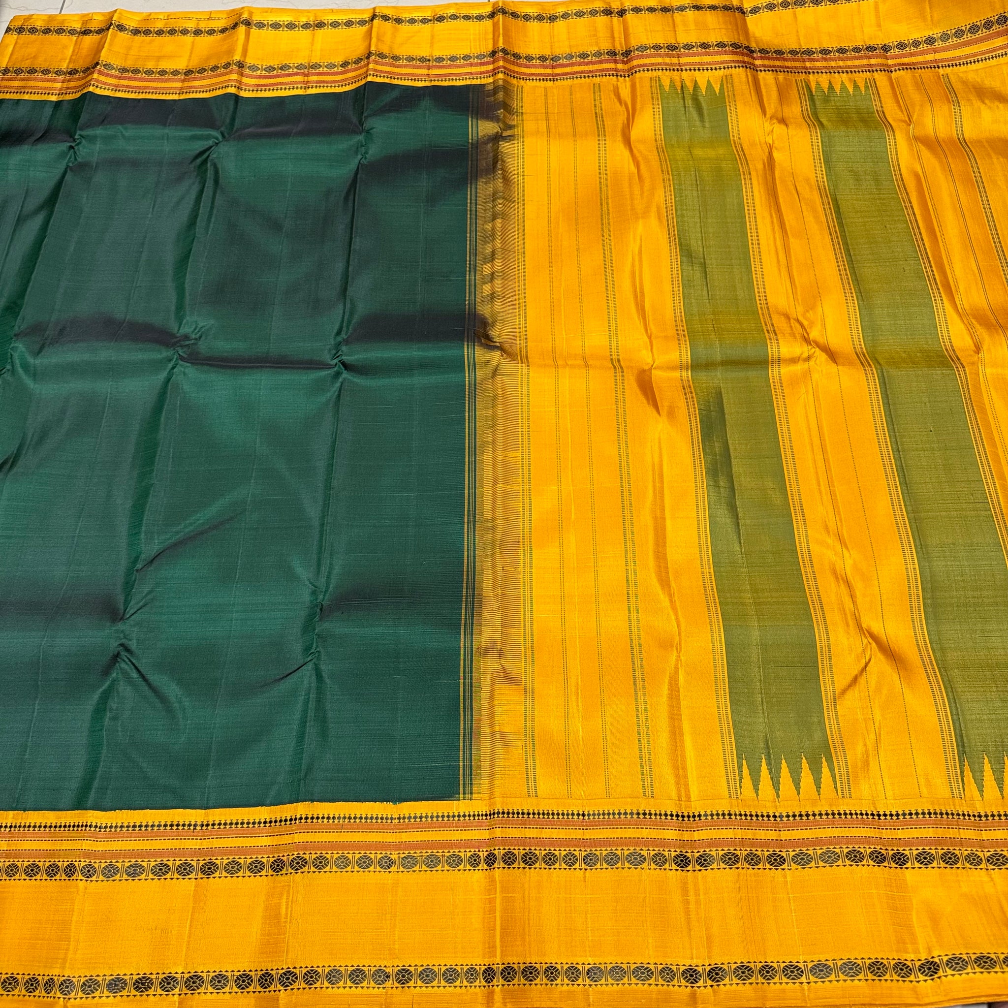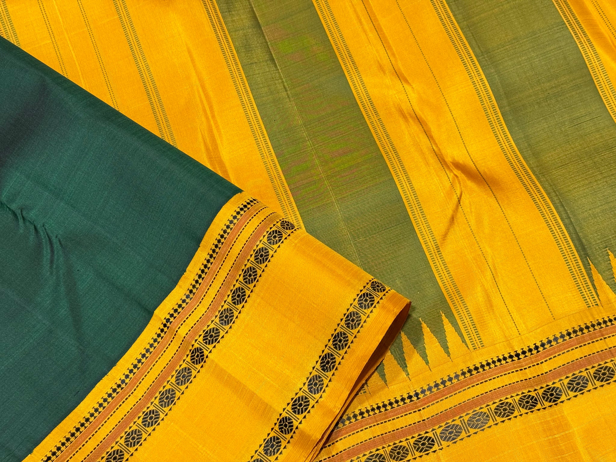Premium Zariless Weave- Bottle Green with Yellow Handwoven Pure Zariless Korvai Kanjivaram Silk with Rudrakshaper Borders classic rekku pallu and contrast woven blouse beauty