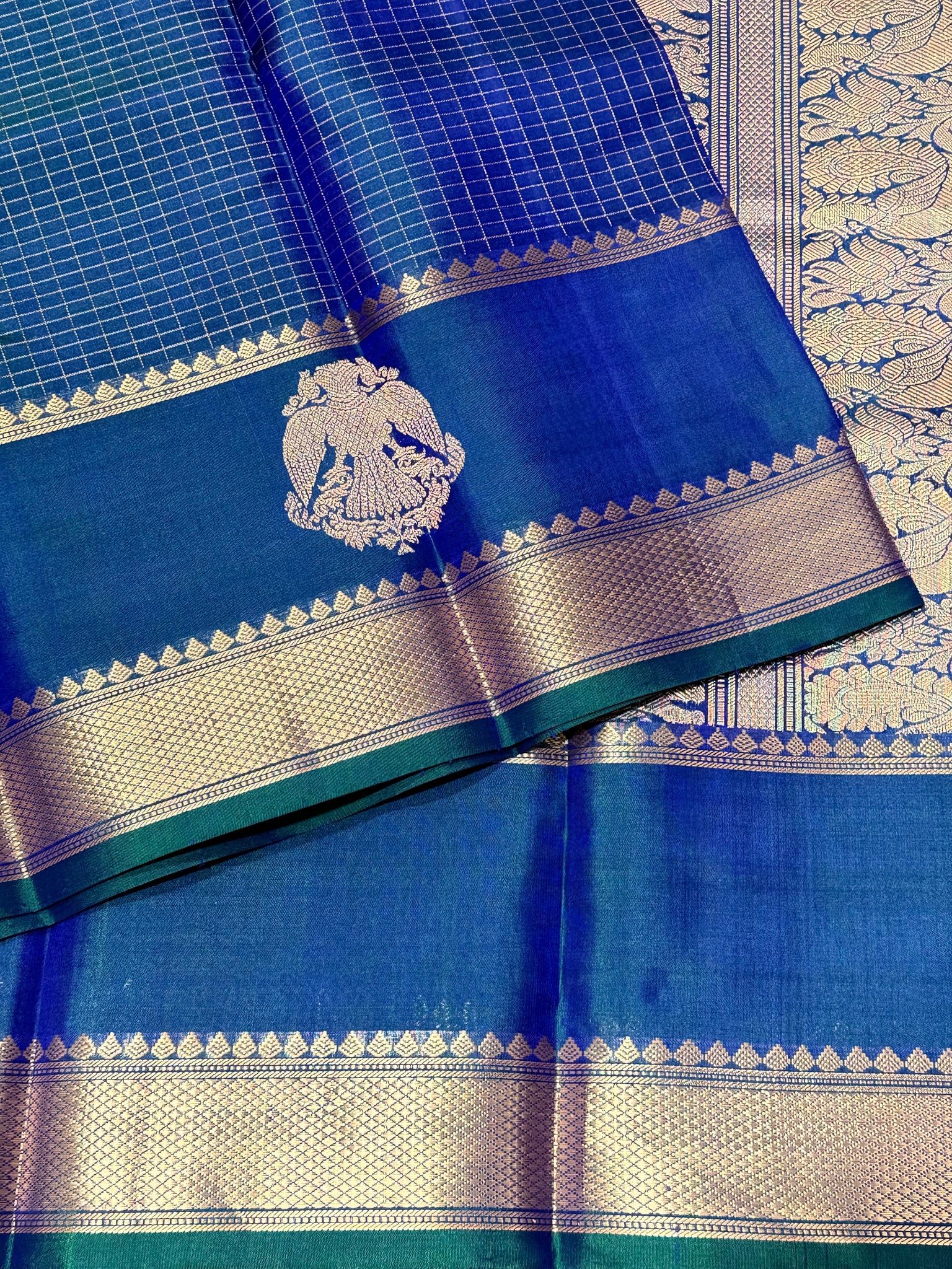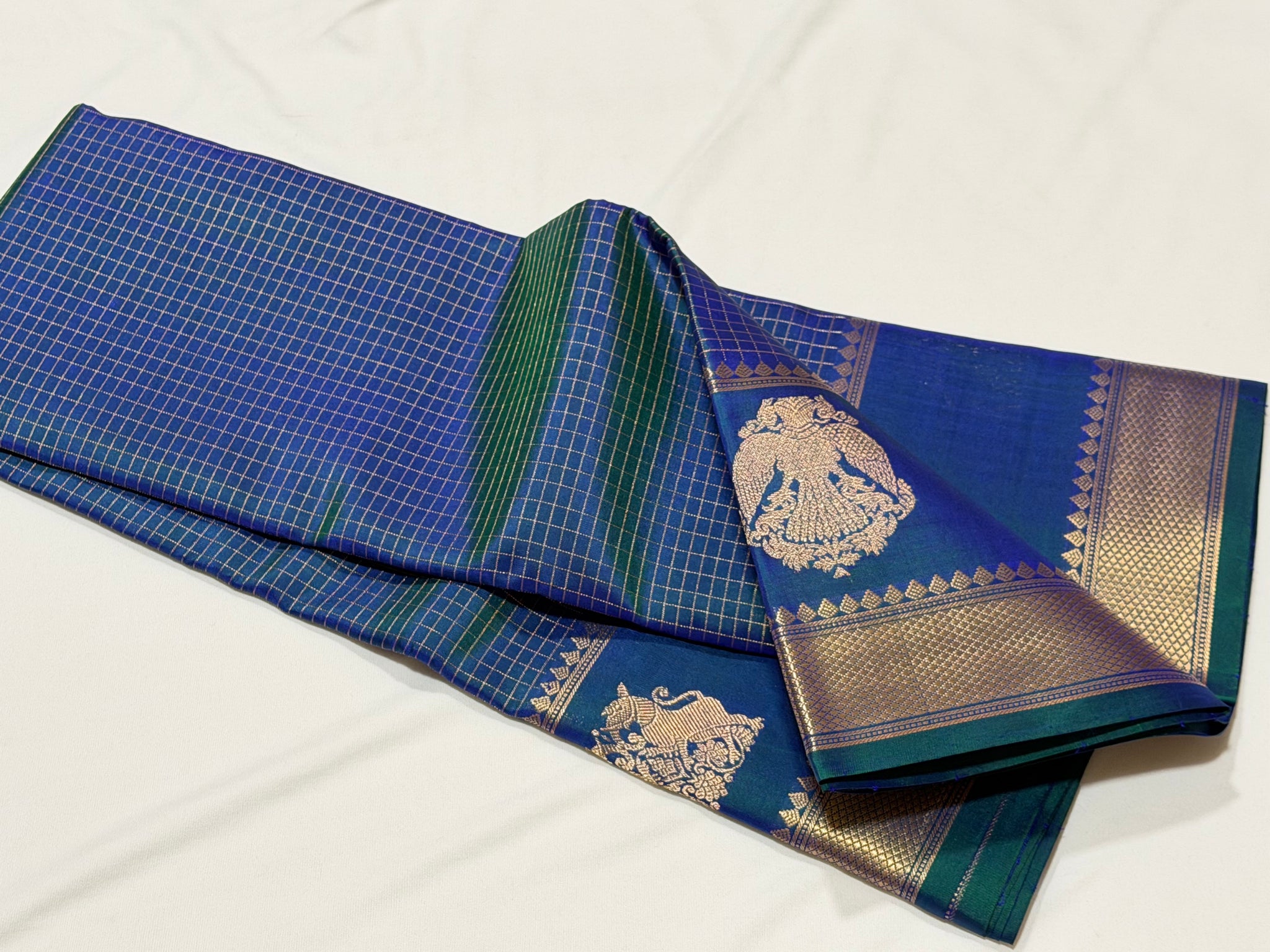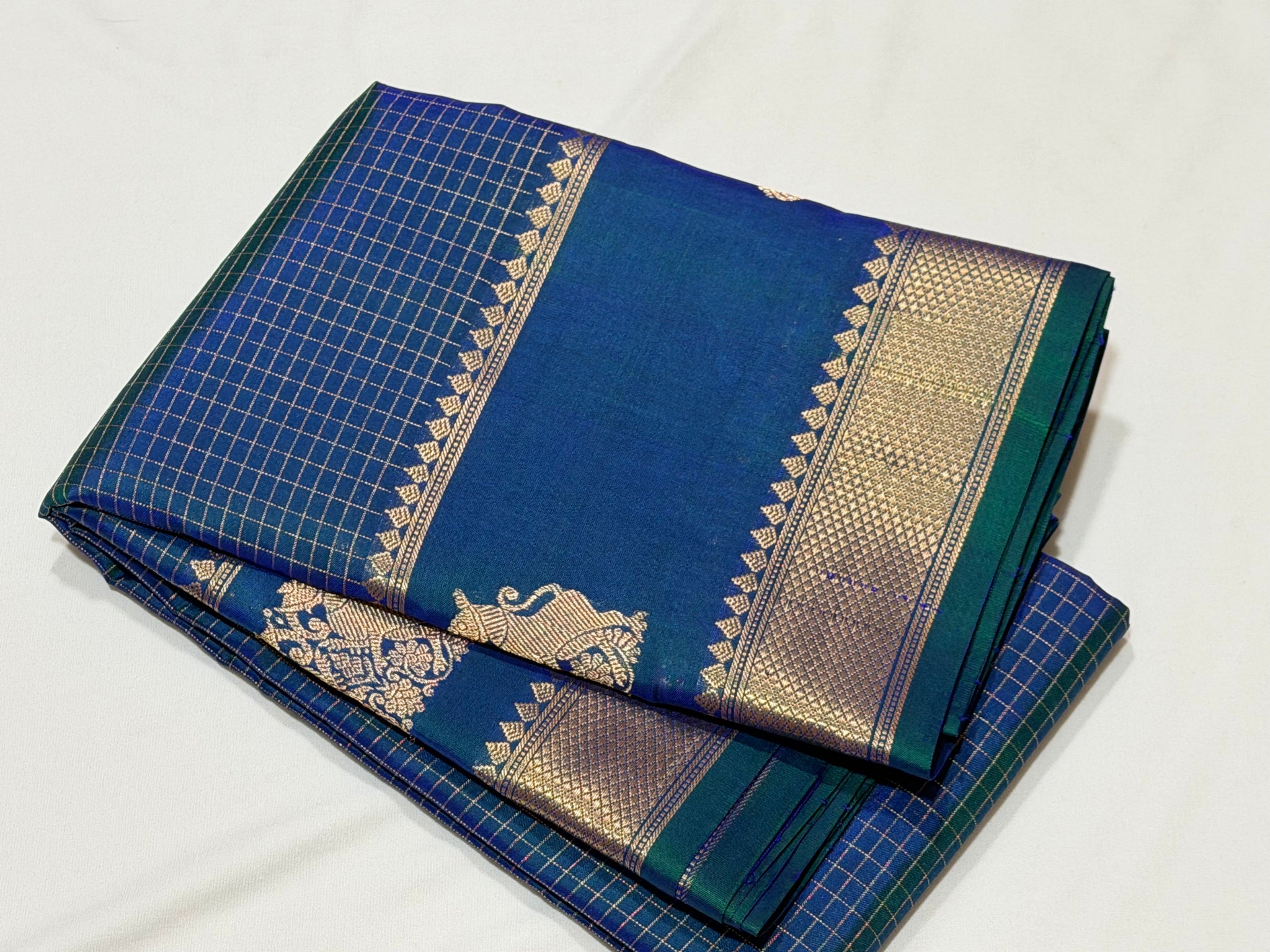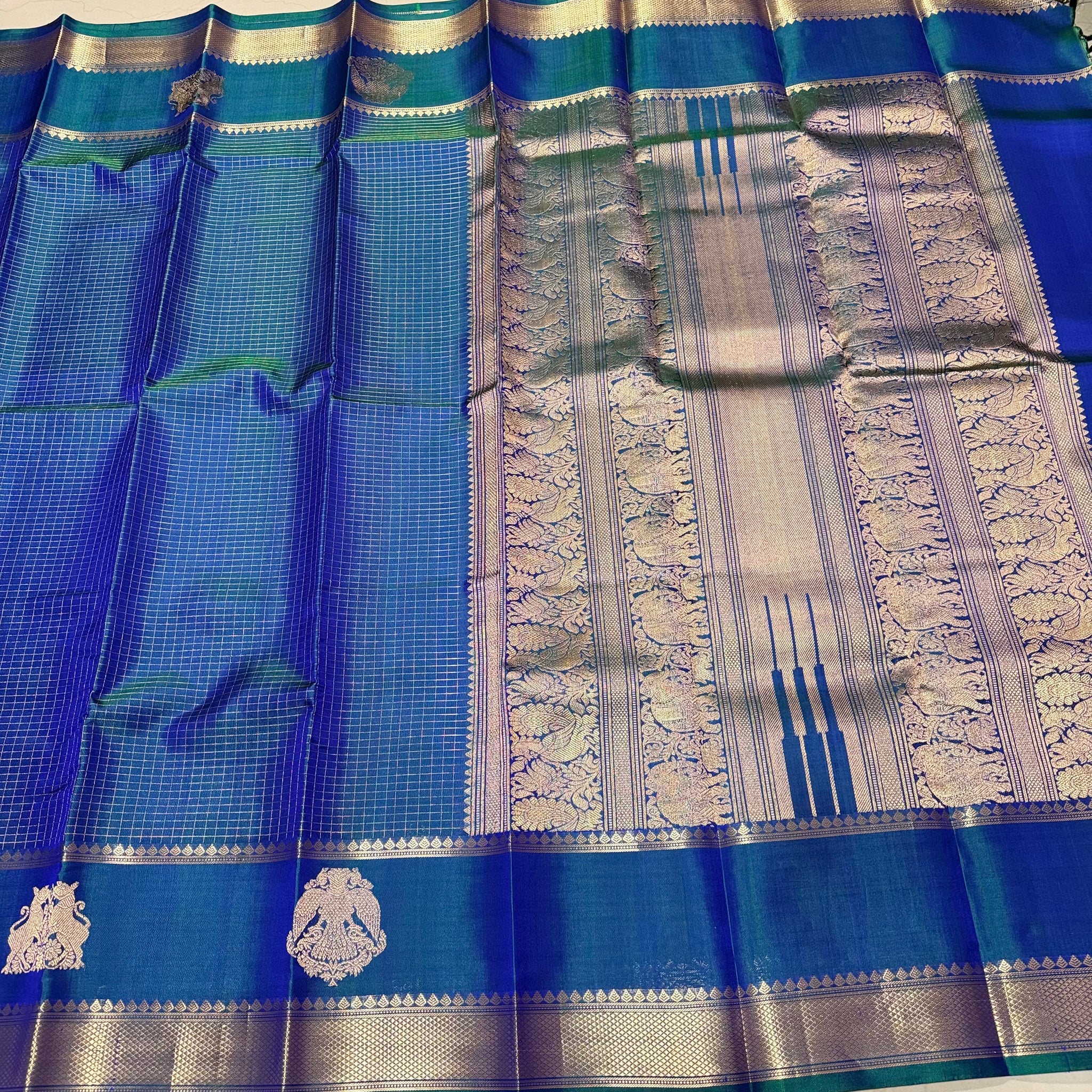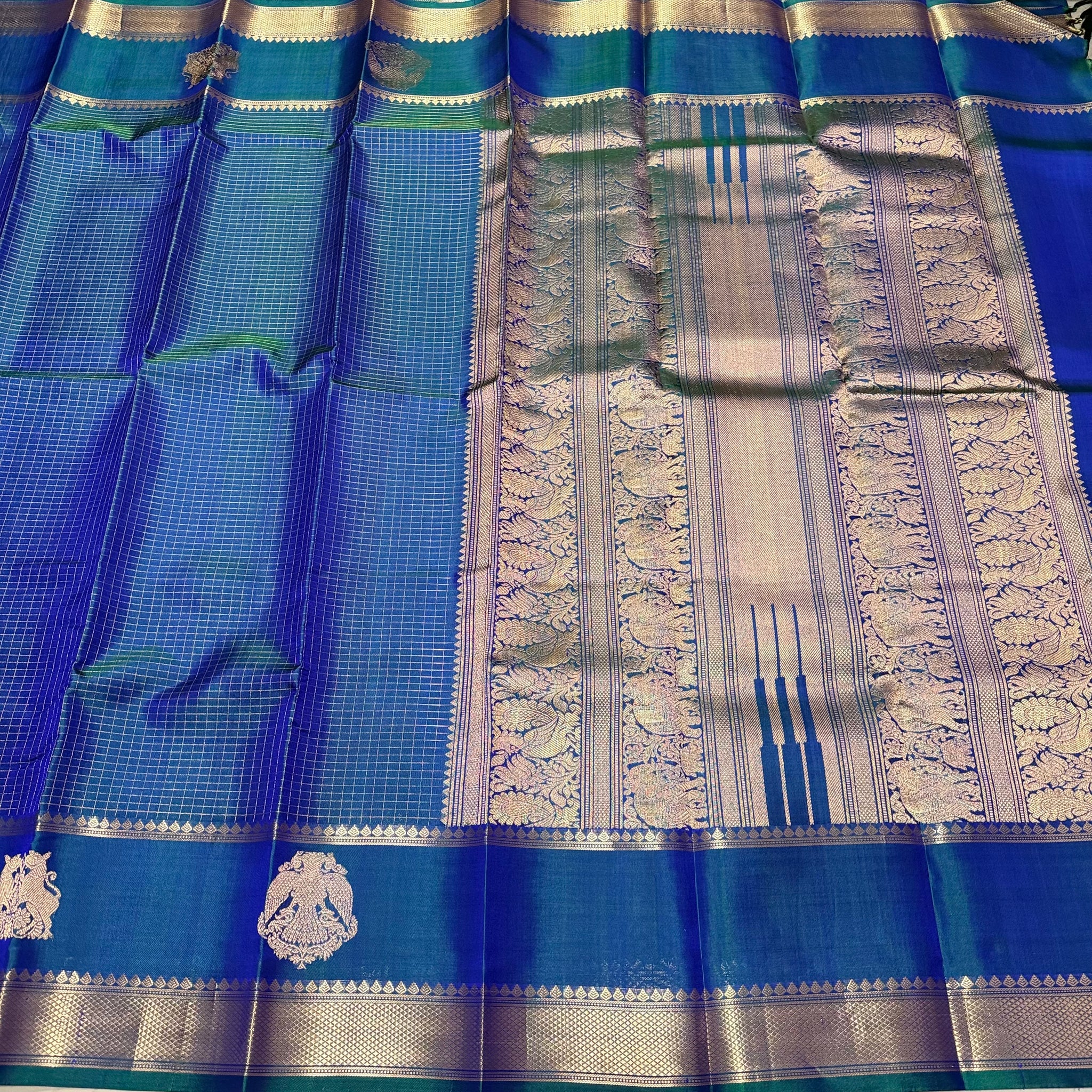 Sahana- Beautiful Peacock Blue with Gold and Green selvedges Handwoven Pure Jari Kanjivaram Silk with beautiful yazhis and gandaberunds woven both side borders kottadi jari checks woven body rich pallu and self colored blouse