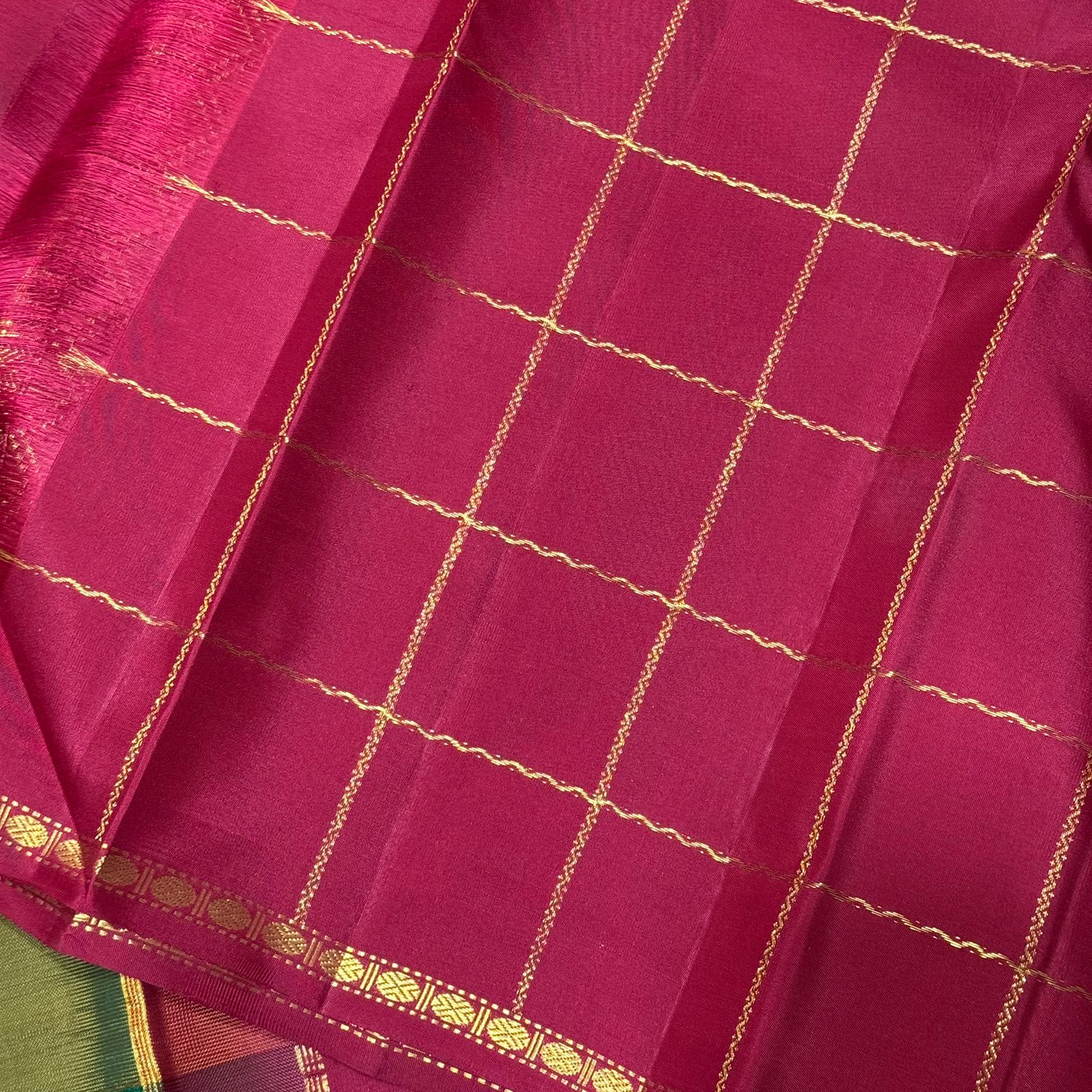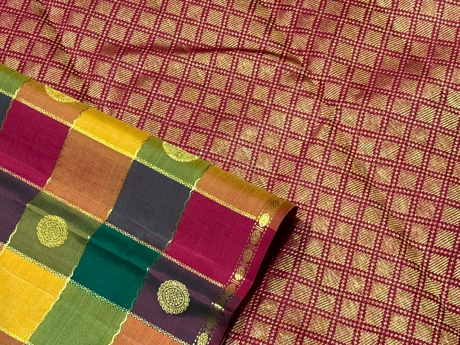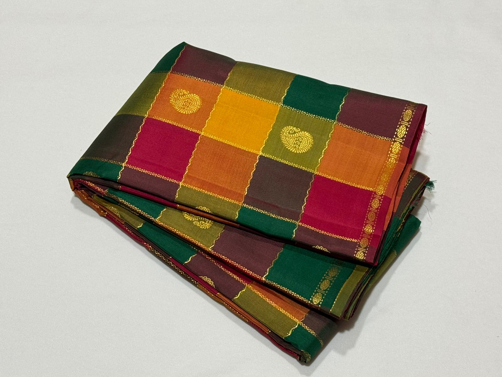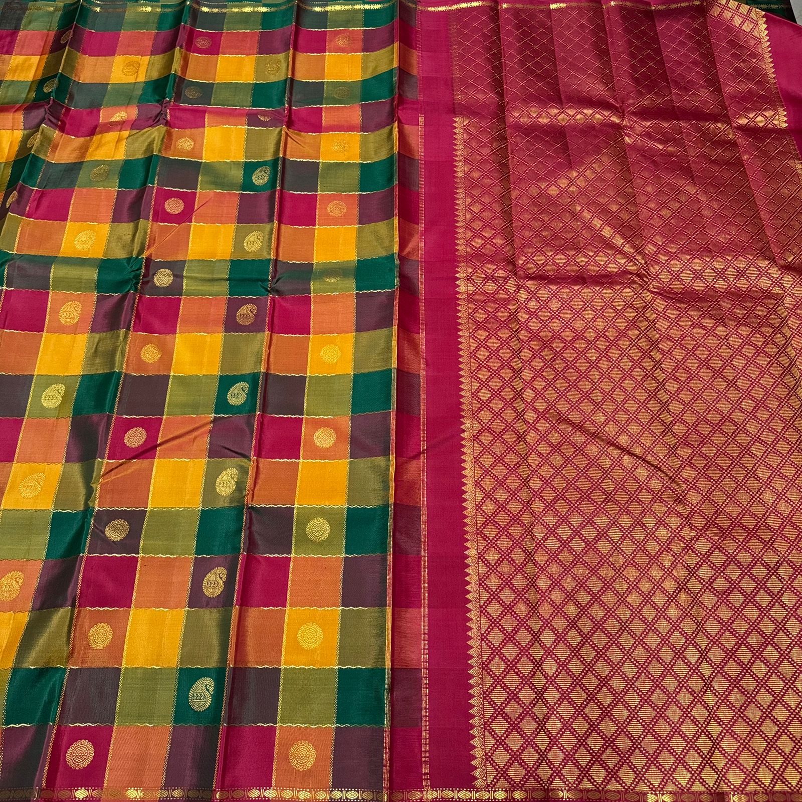 Saranga- Super Gorgeous Handwoven Pure Kanjivaram Silk Saree in a Beautiful Palum Pazhamum Checks with traditional colors with mango and chakram buttas woven in the body with neli veldhari jari lined checks rich woven pallu and contrast arakku red blouse
